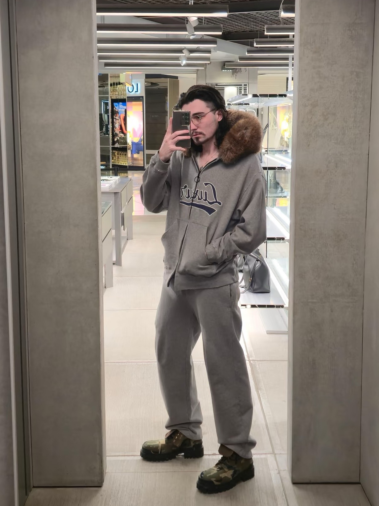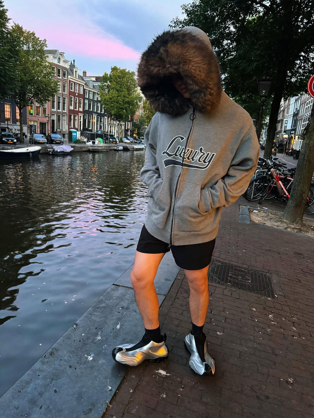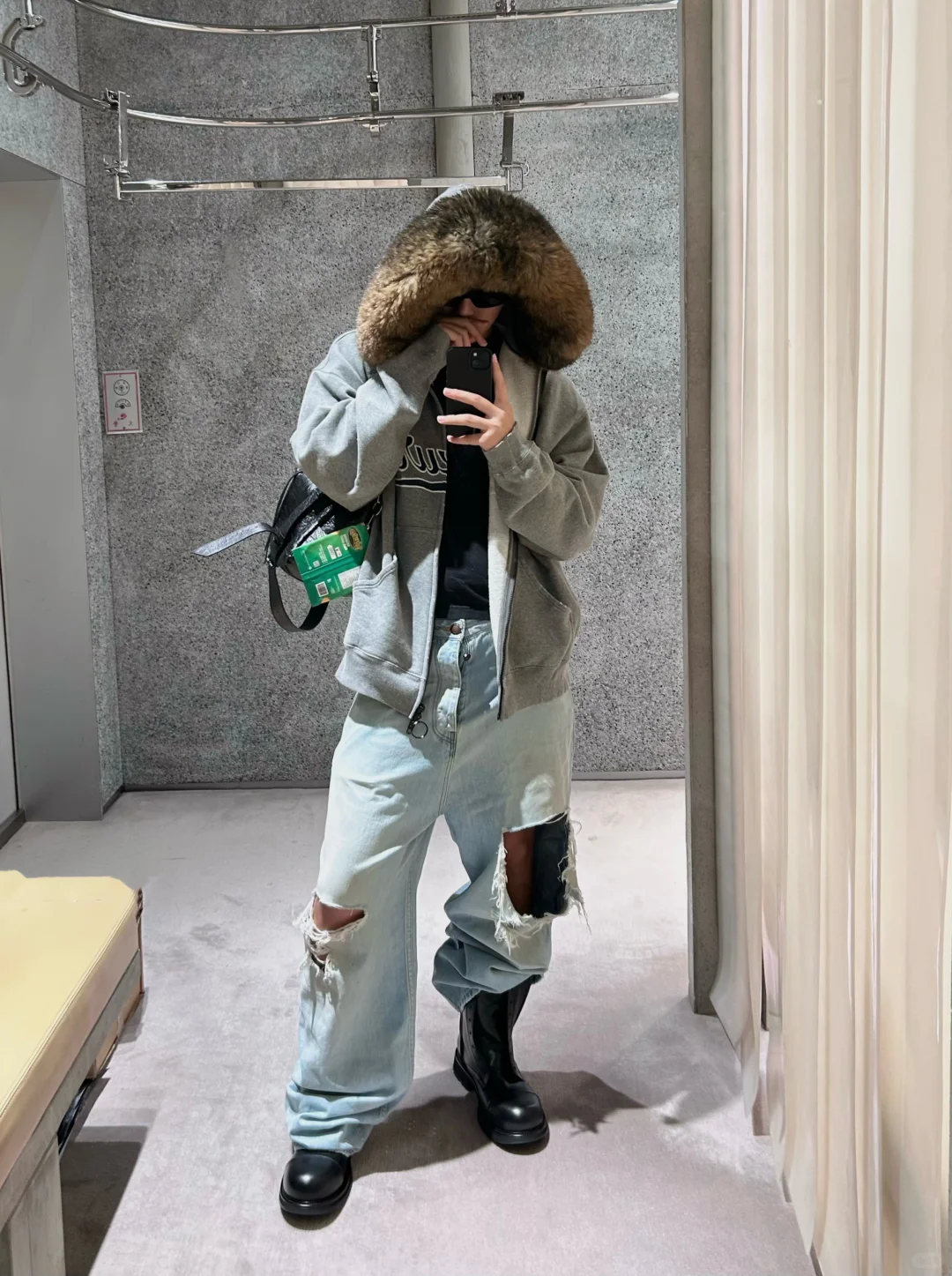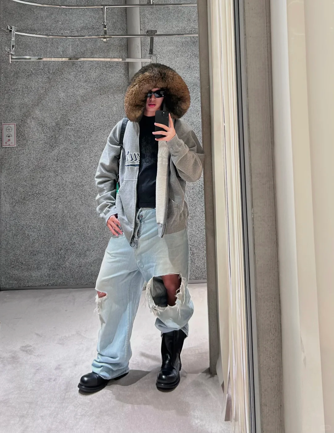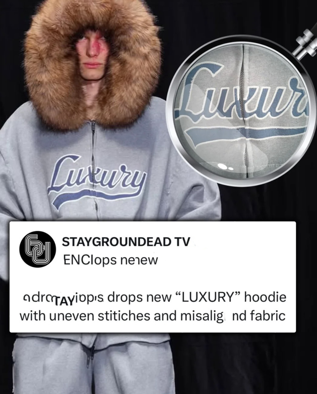 Luxury Script廓形深花灰色刺綉毛領連帽拉鍊衛衣Hooide
