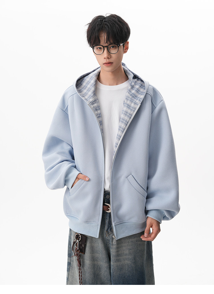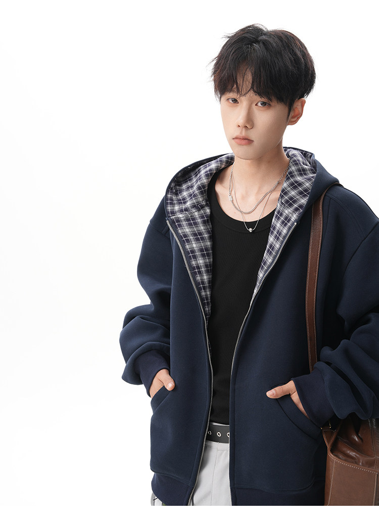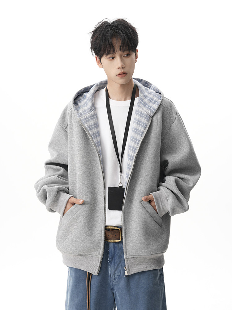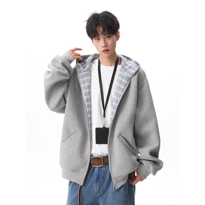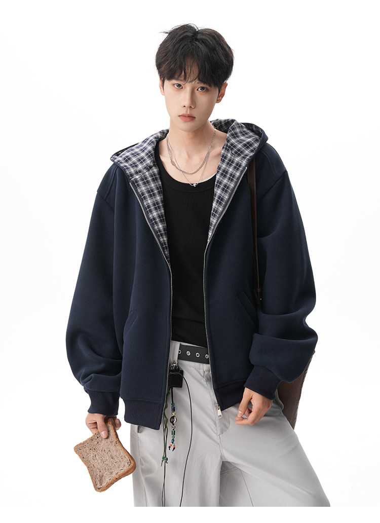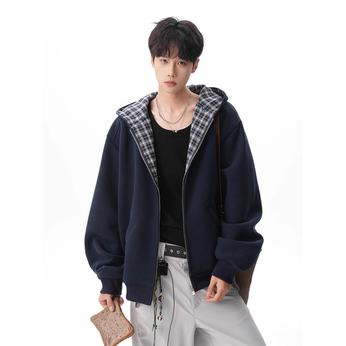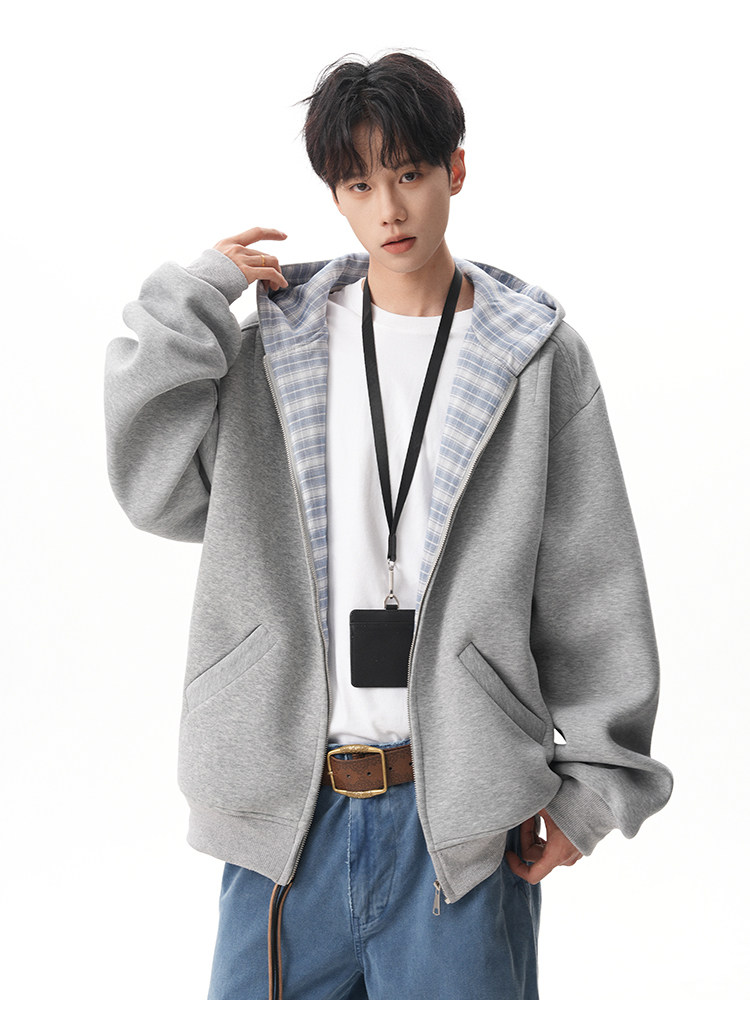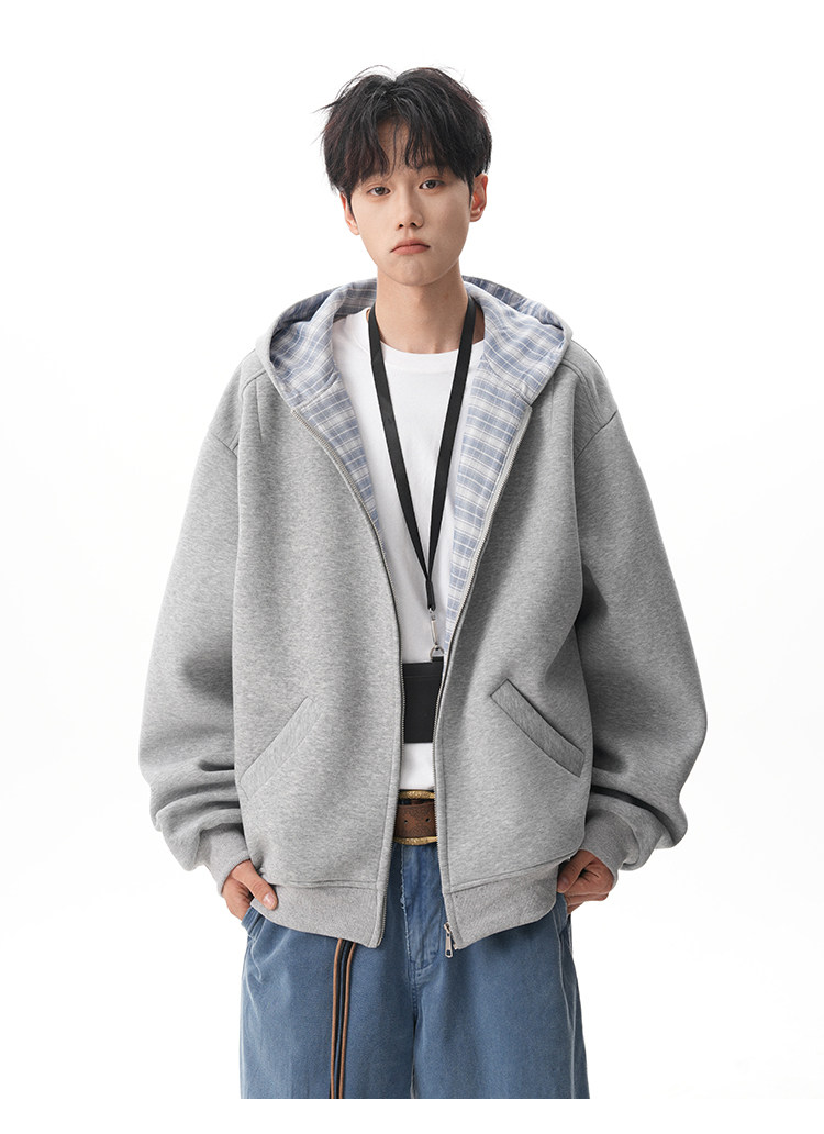 500G重磅美式格紋拼接連帽衛衣男秋季慵懶寬松外套休閒運動夾克