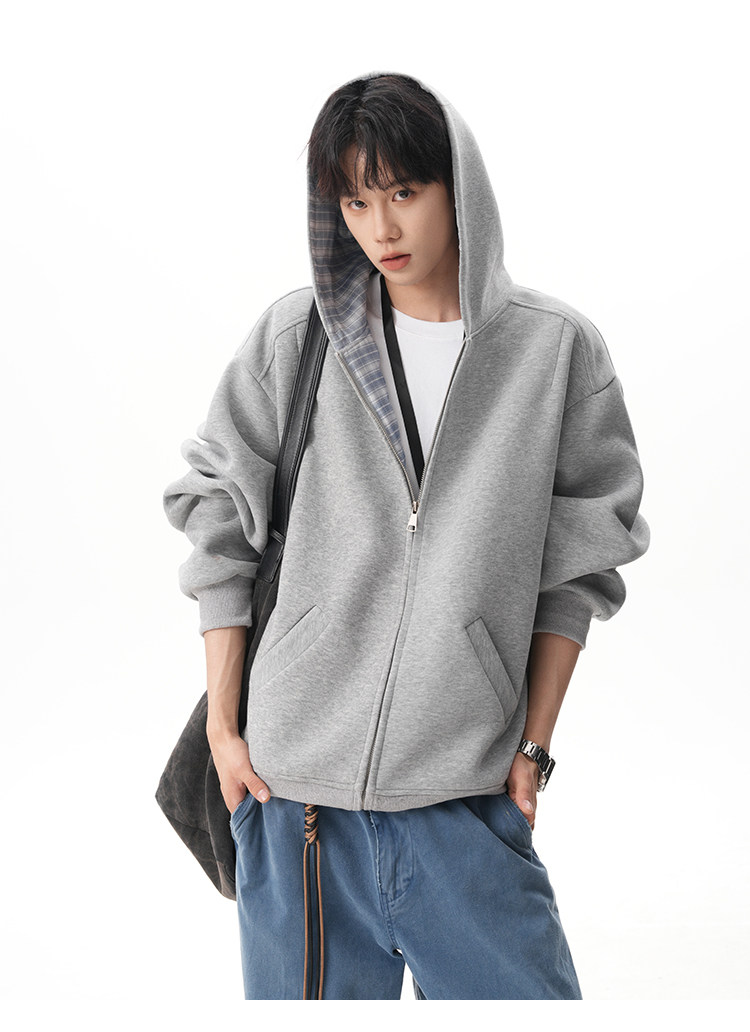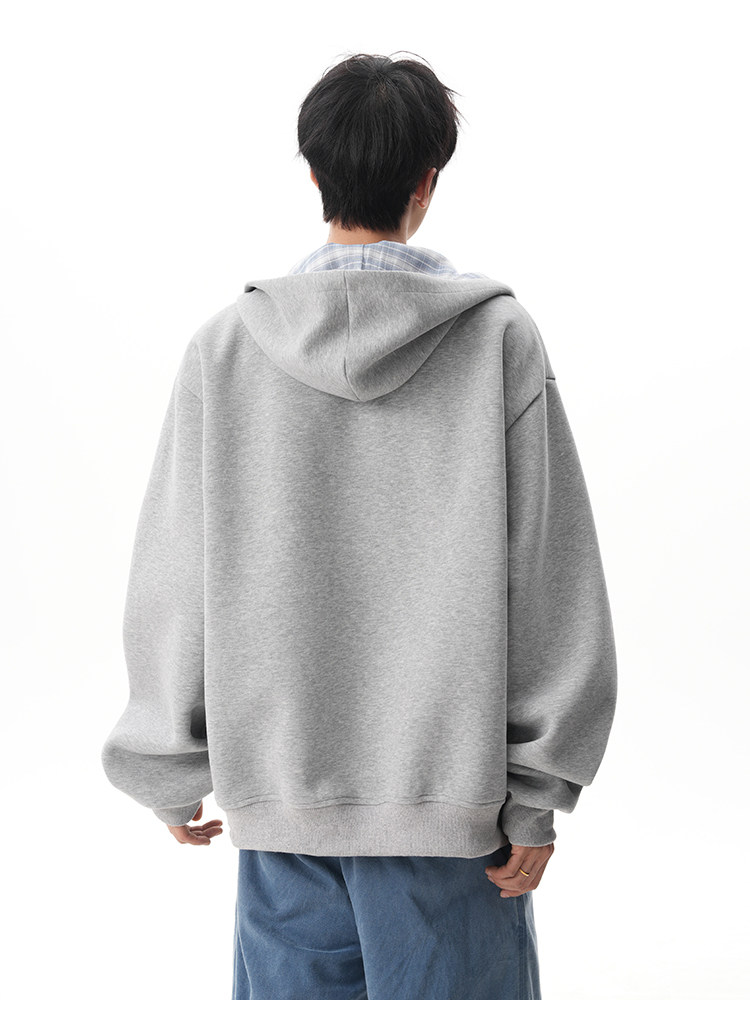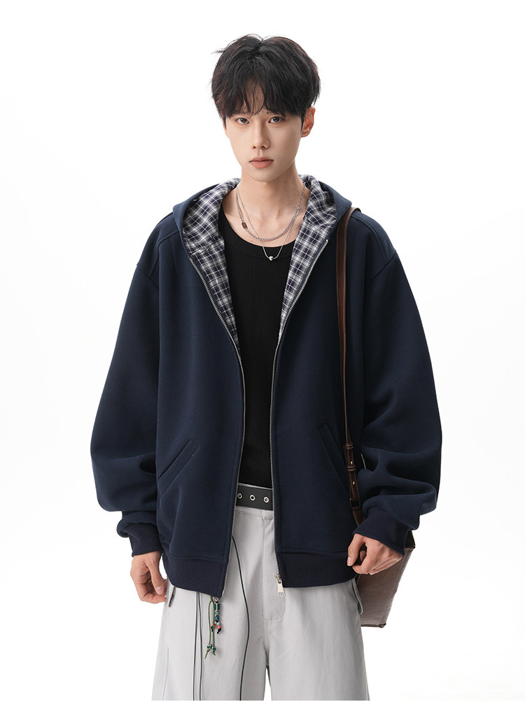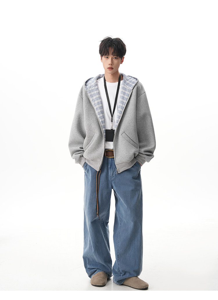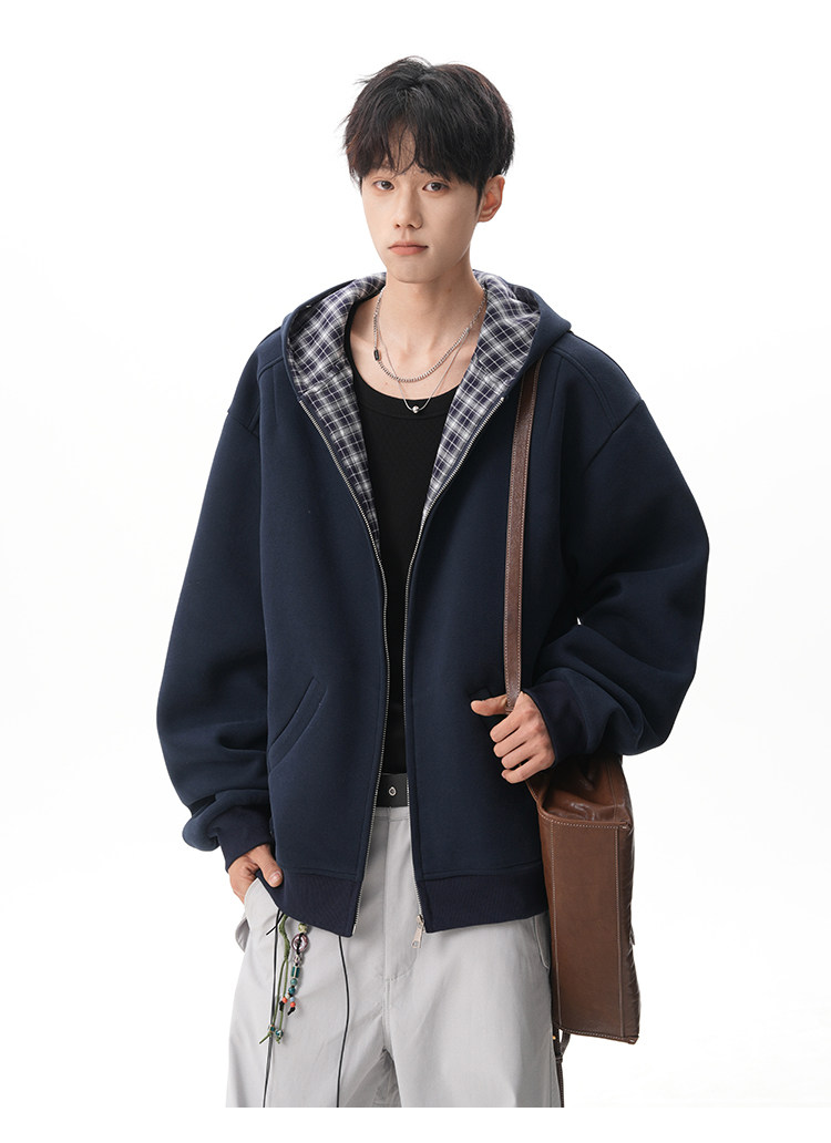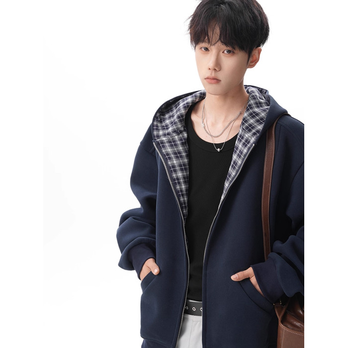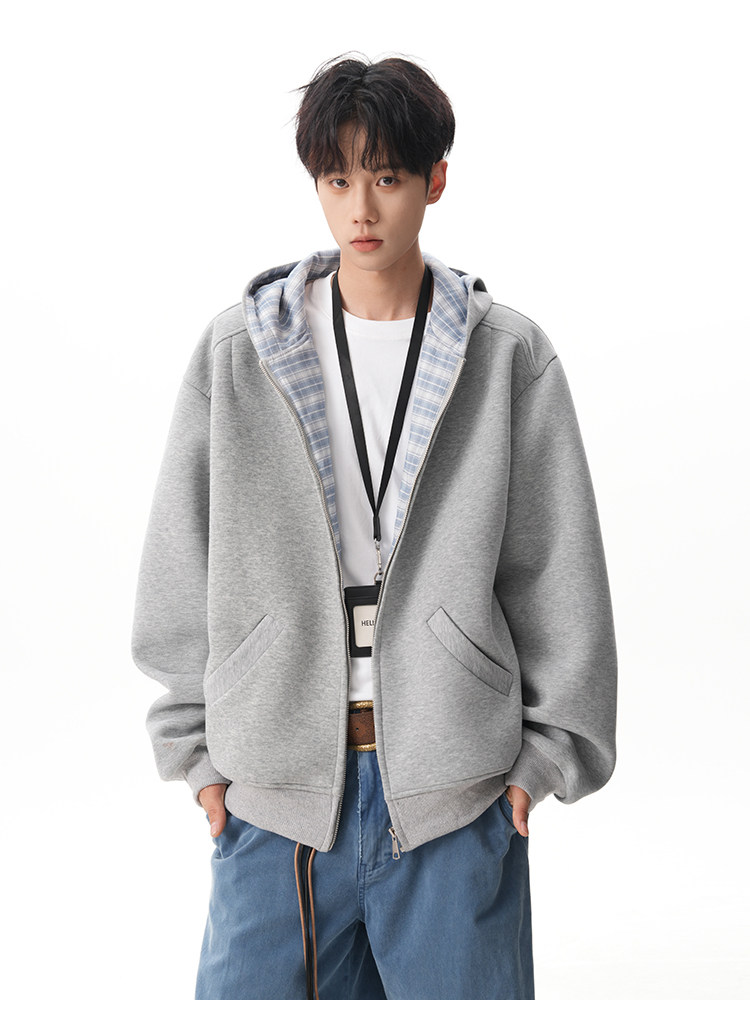 500G重磅美式格紋拼接連帽衛衣男秋季慵懶寬松外套休閒運動夾克