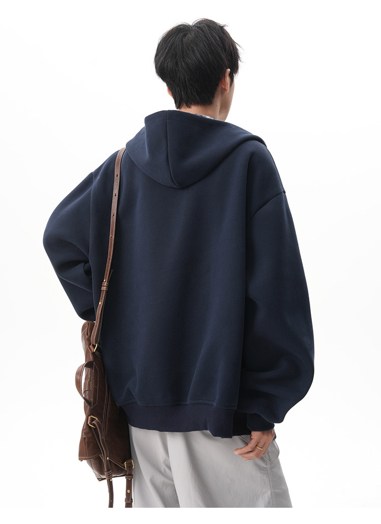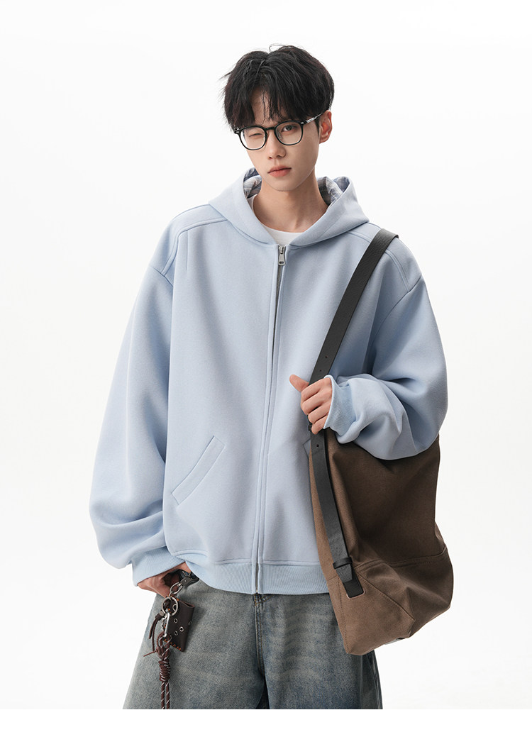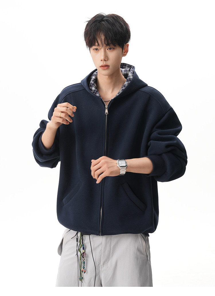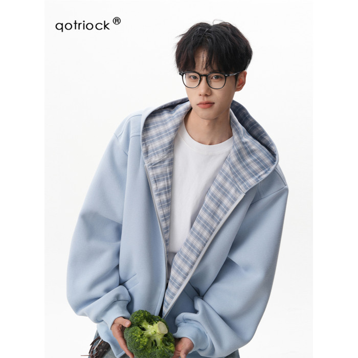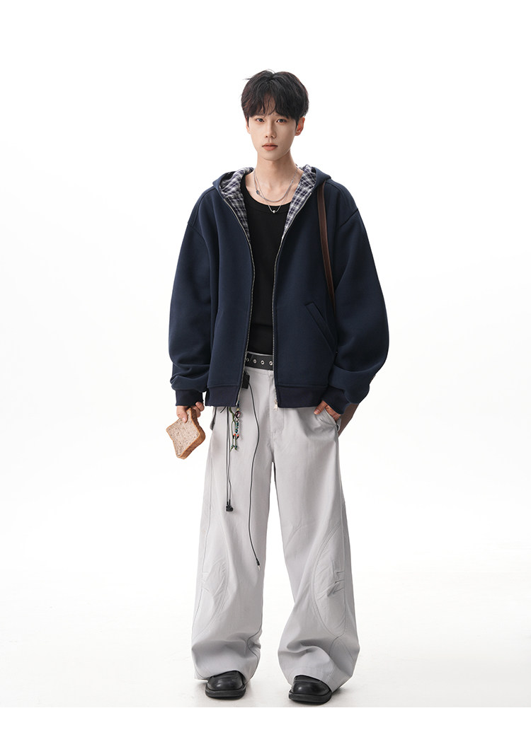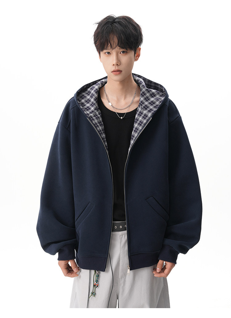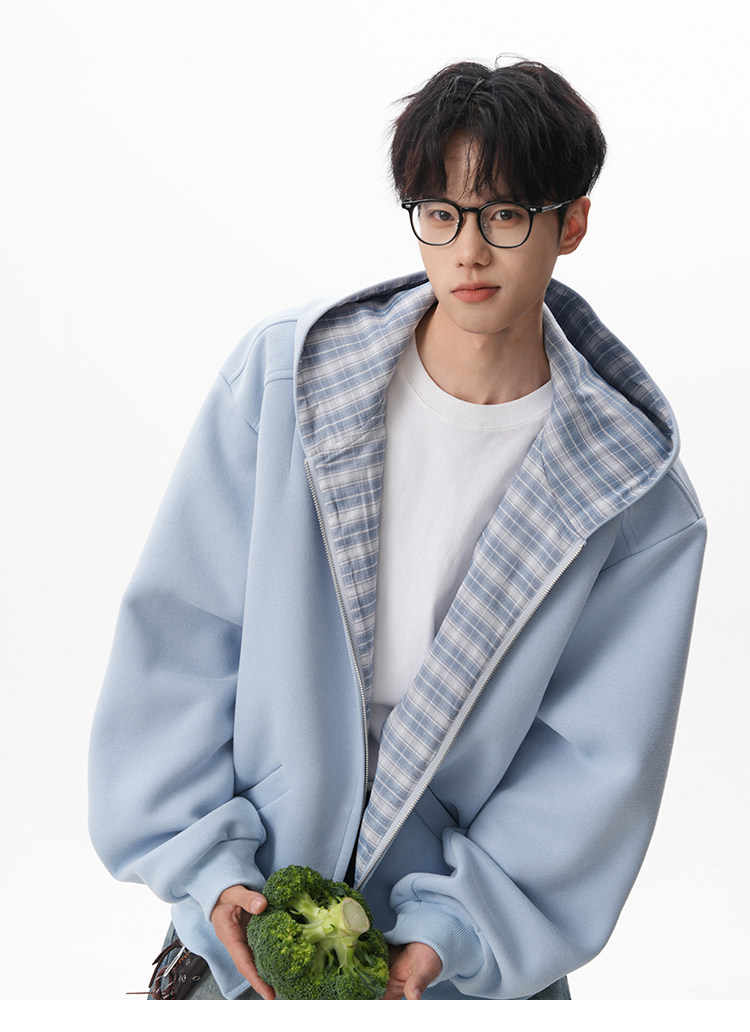 500G重磅美式格紋拼接連帽衛衣男秋季慵懶寬松外套休閒運動夾克