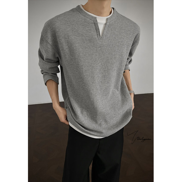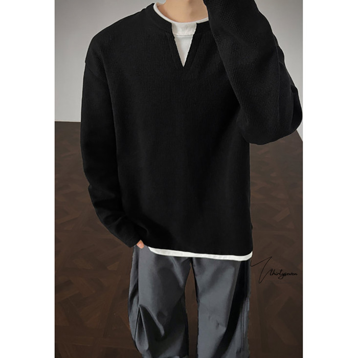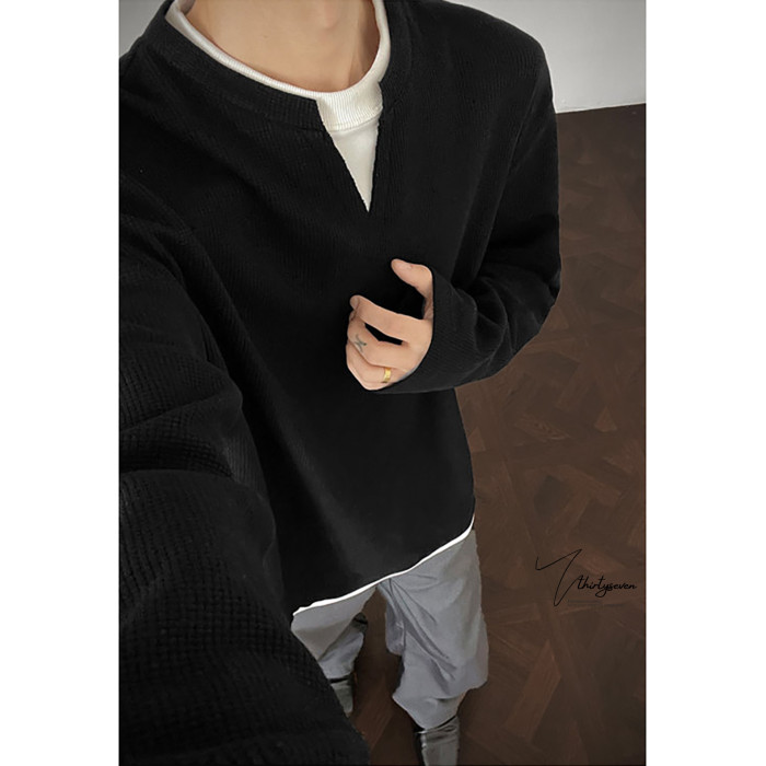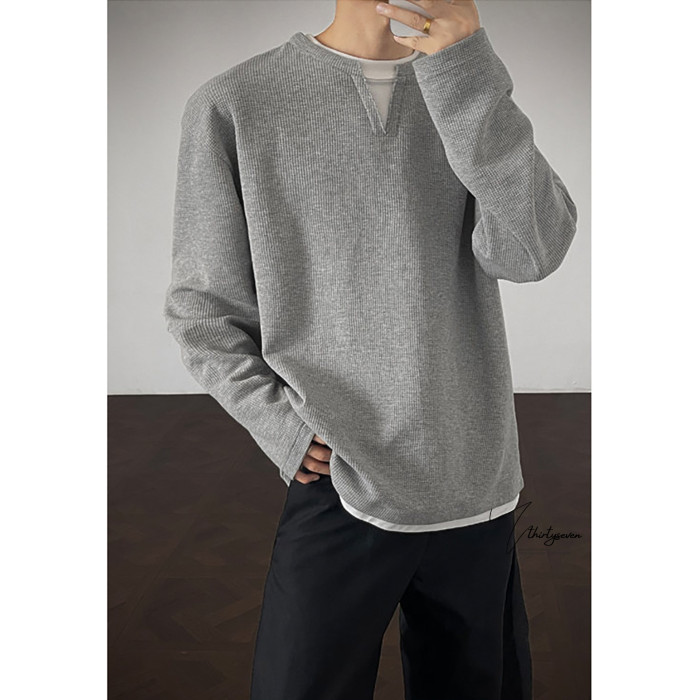 V37華夫格假兩件長袖T恤男秋美式純色V領打底衫高街休閒內搭上衣