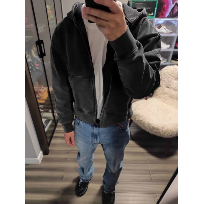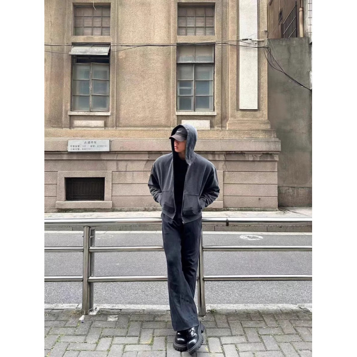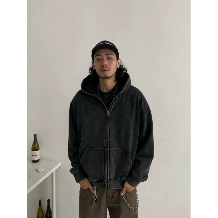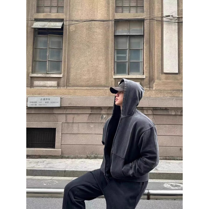美式復古春秋做舊廓形短款基礎水洗做舊落肩boxy連帽拉鍊衛衣男潮