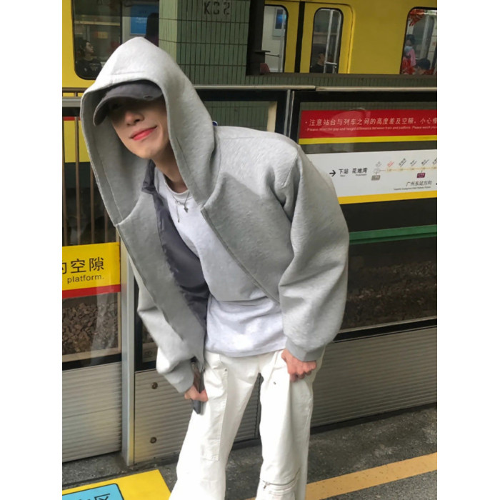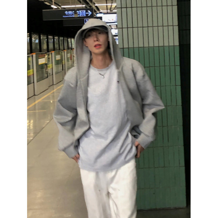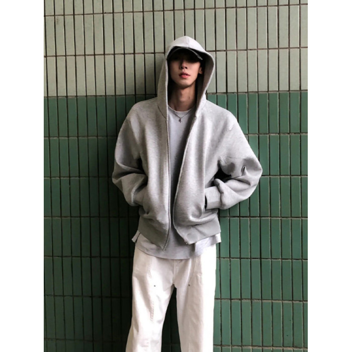 灰色美式復古重磅連帽衛衣開衫男春秋款潮牌高級感痞帥短款外套