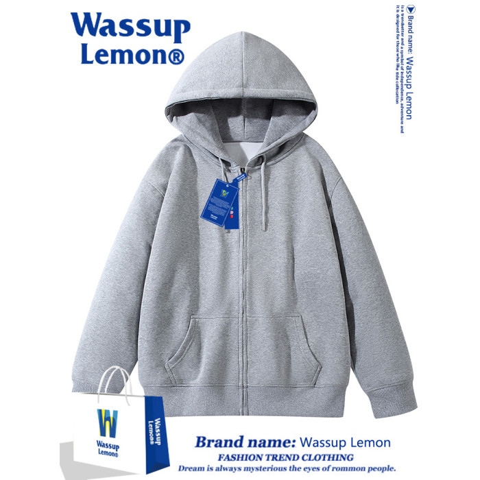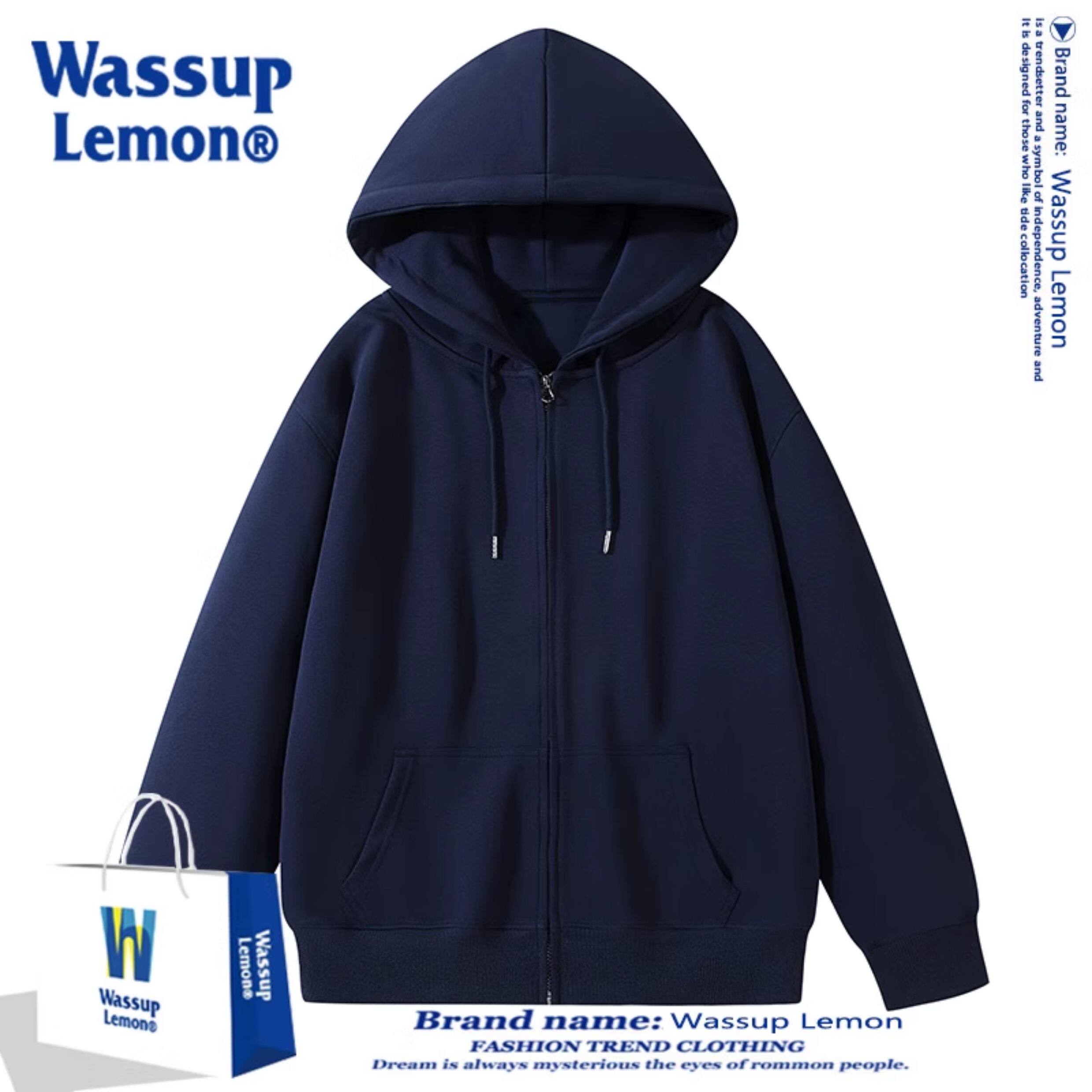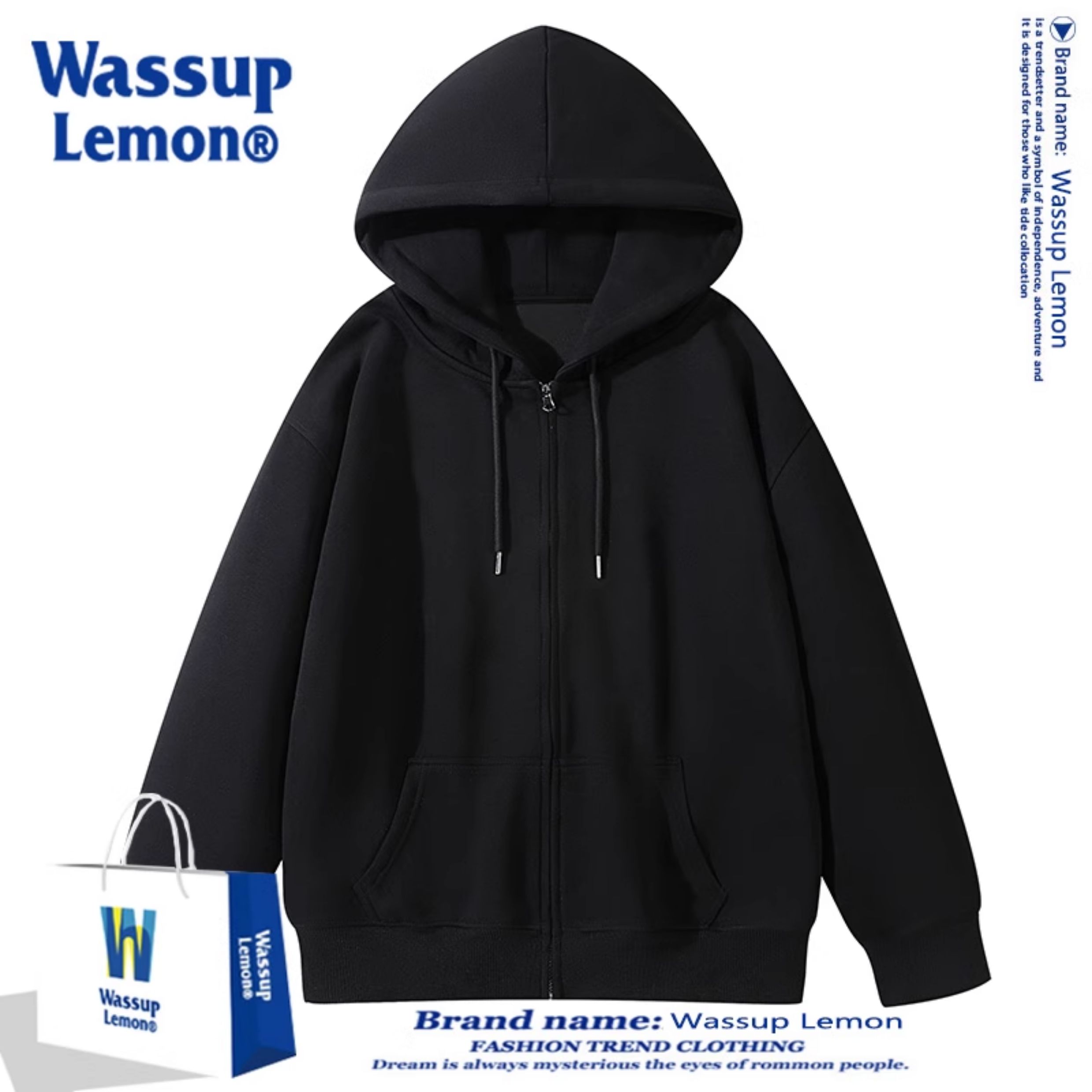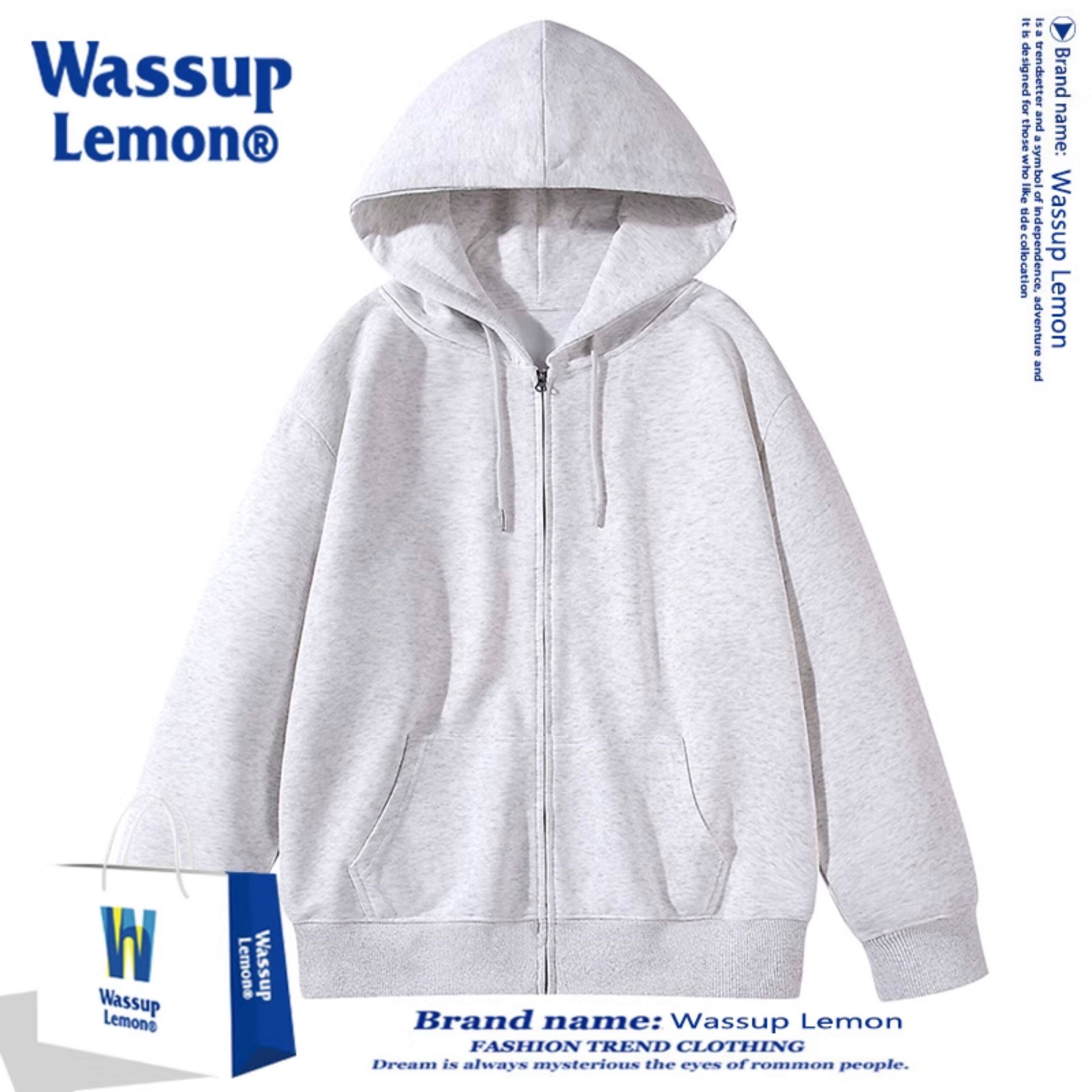 WASSUP LEMON連帽開衫oversize衛衣男女純色潮牌加絨厚休閒外套