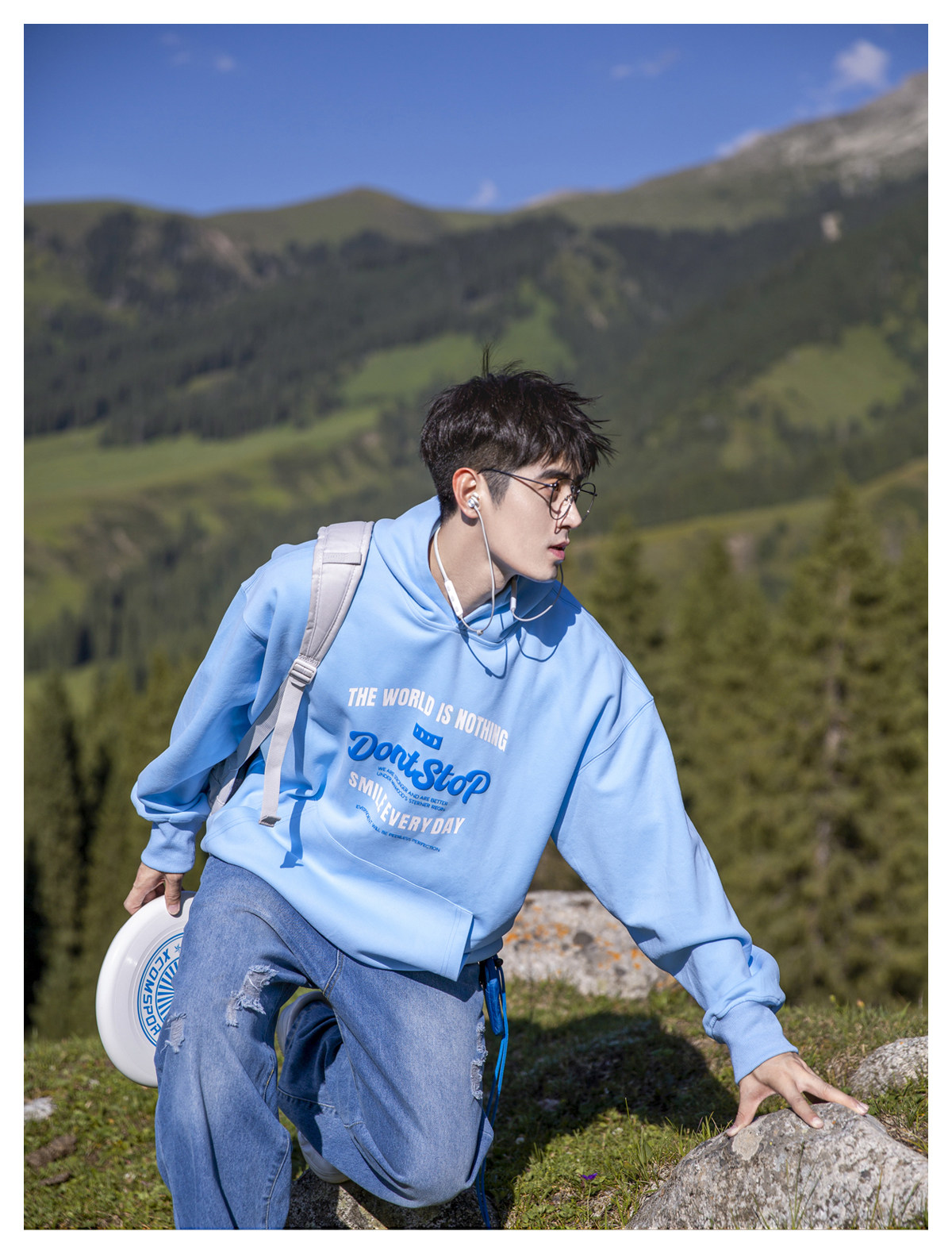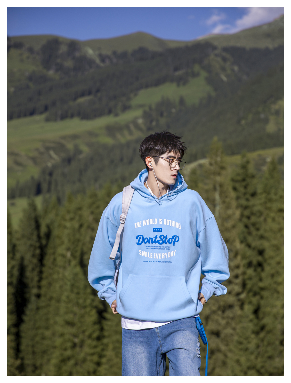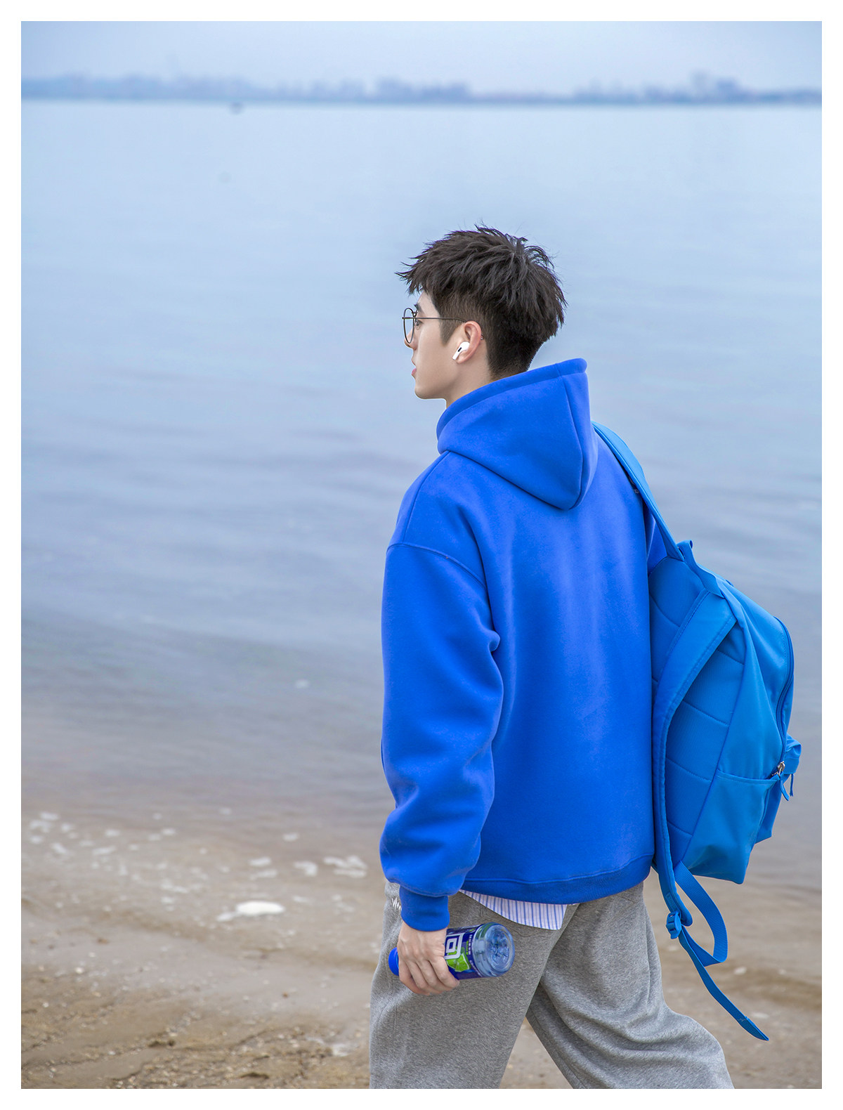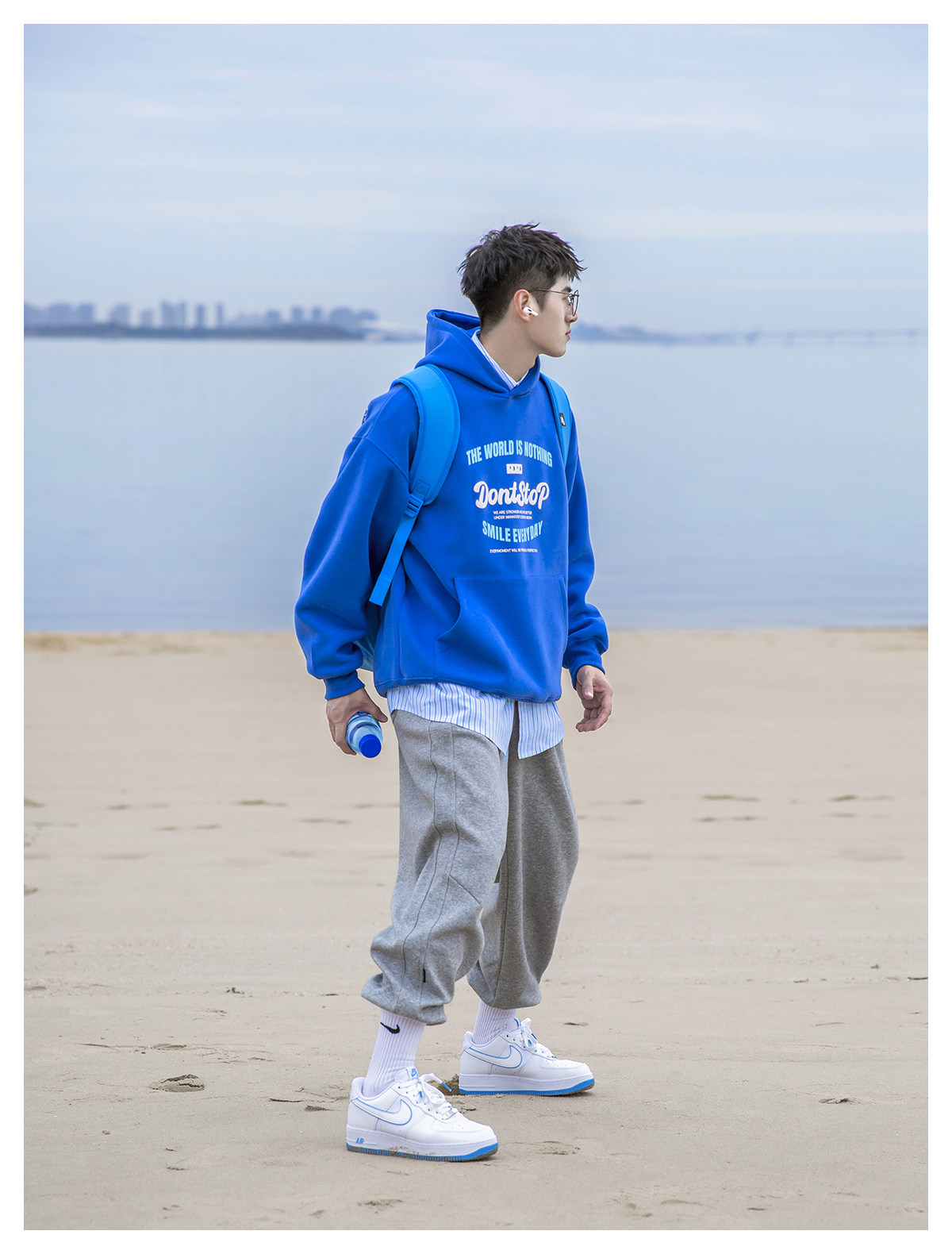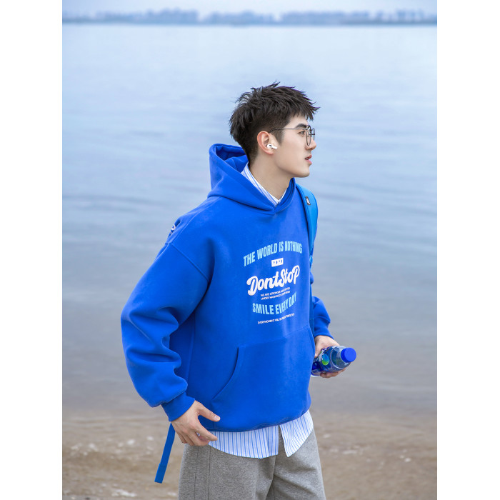 PD冰藍色重磅休閒連帽衛衣青少年感男日系字母落肩帽衫廓形上衣潮