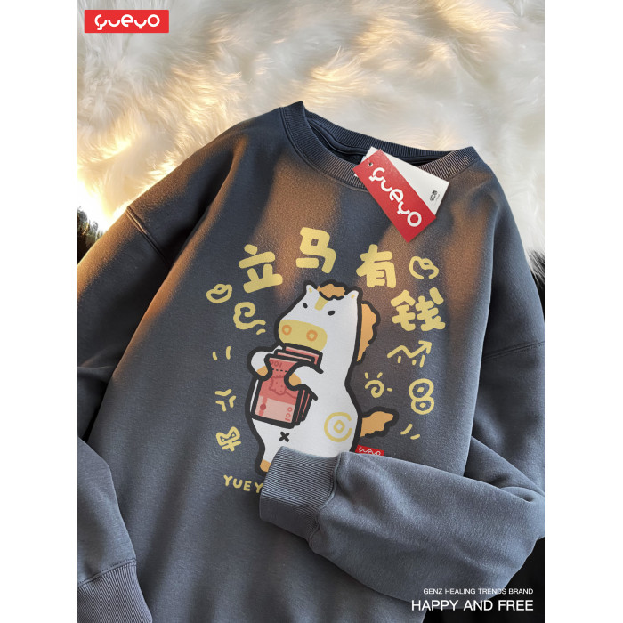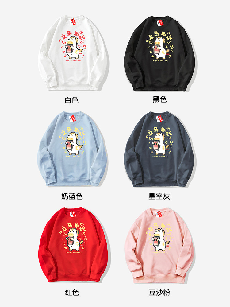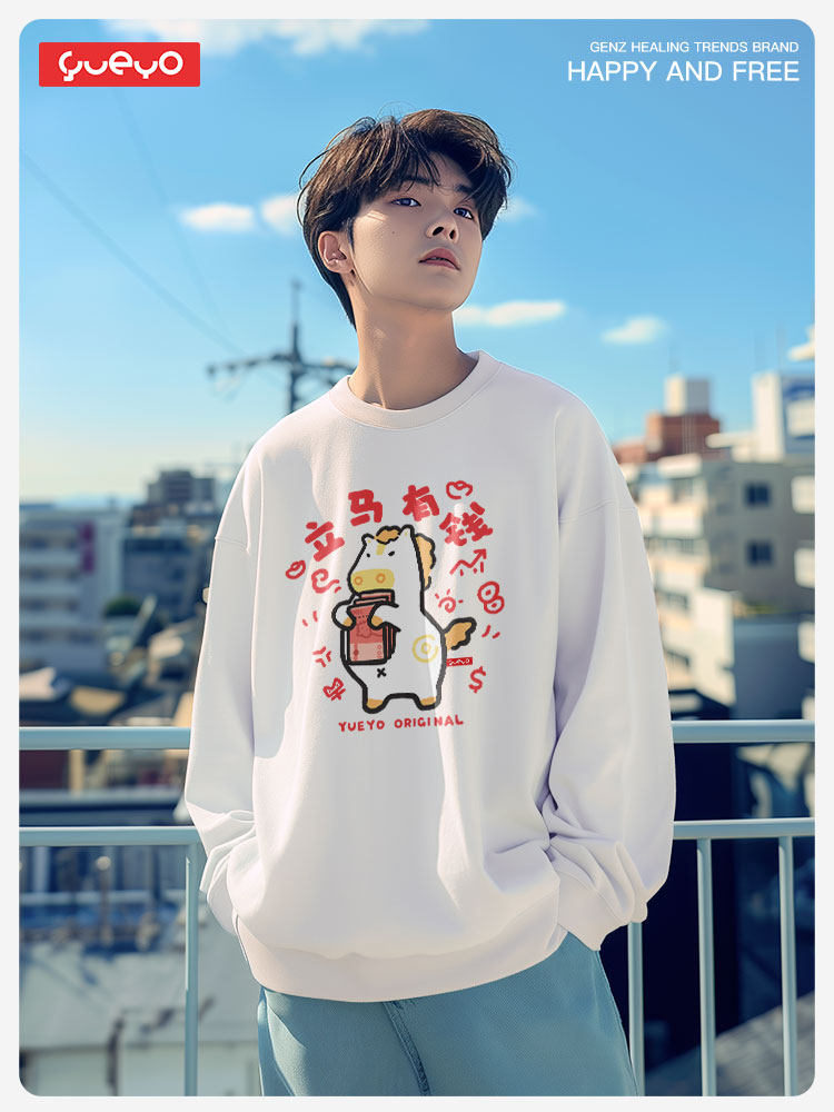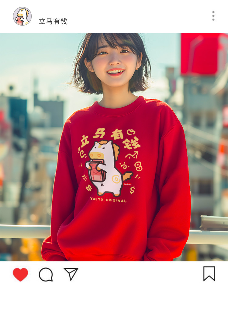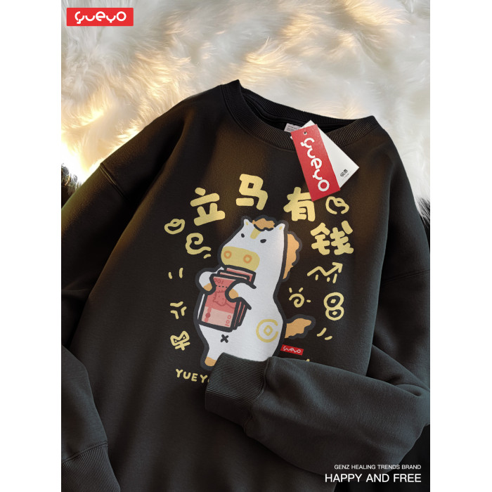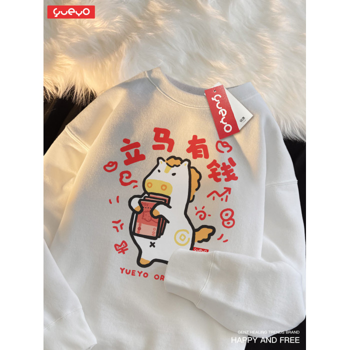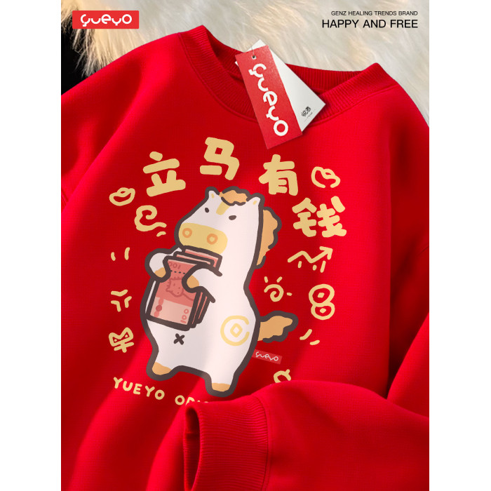 悅遊 立馬有錢 2026新年本命年冬季加絨圓領衛衣男潮流紅色趣味