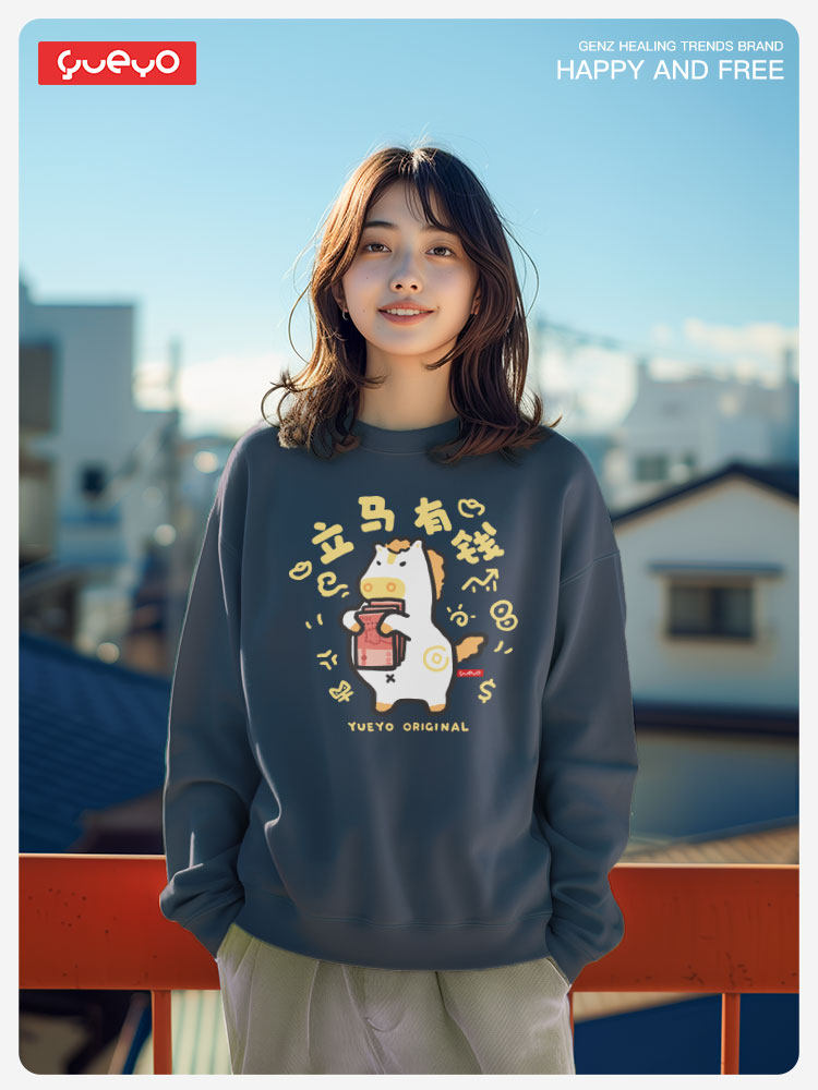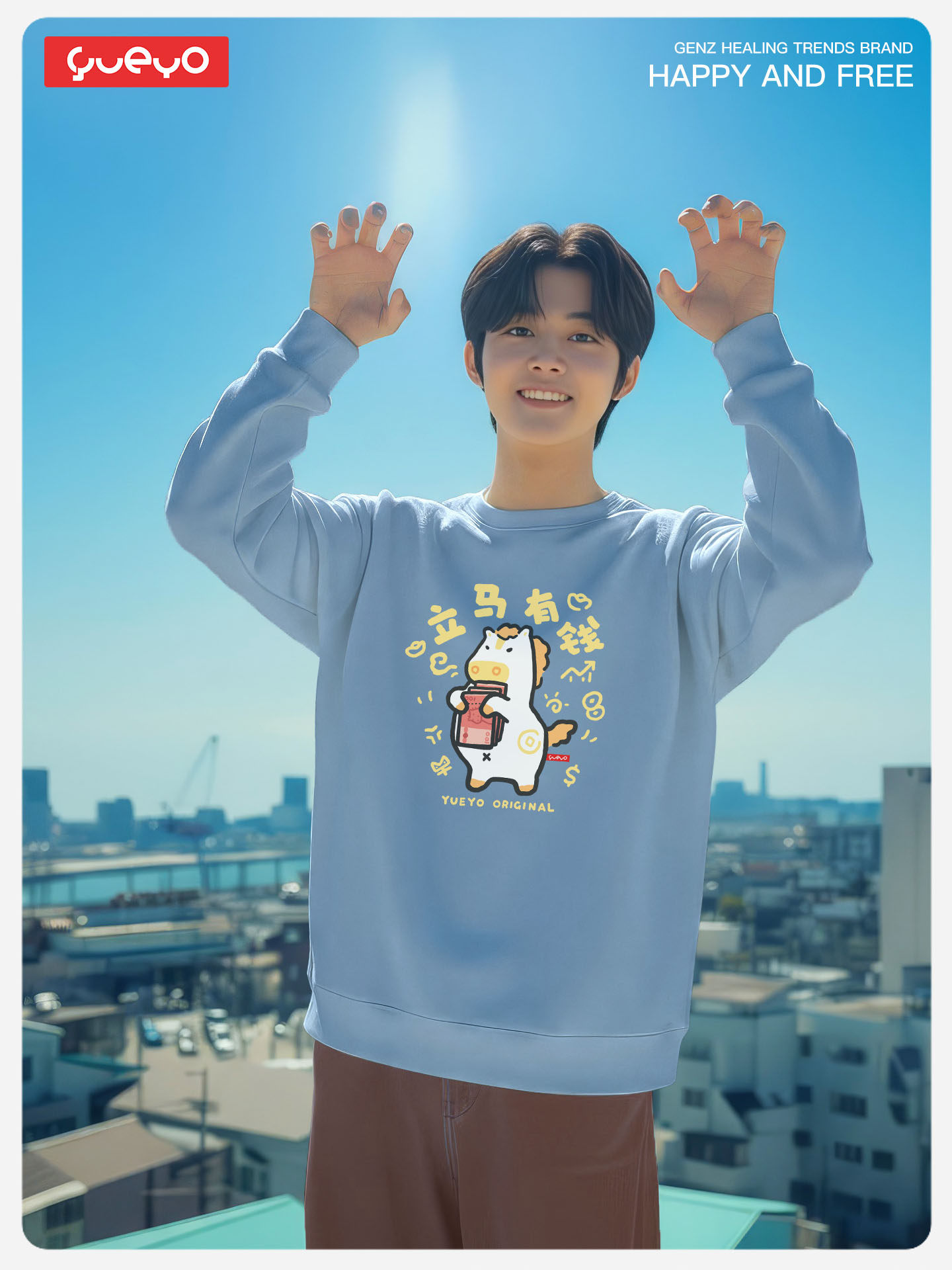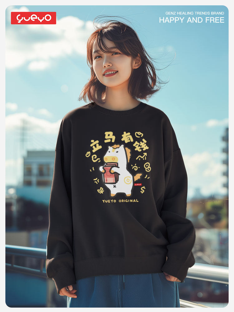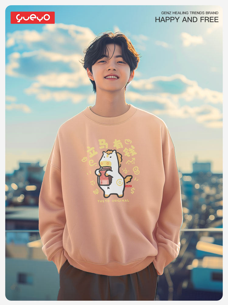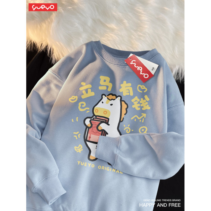 悅遊 立馬有錢 2026新年本命年冬季加絨圓領衛衣男潮流紅色趣味