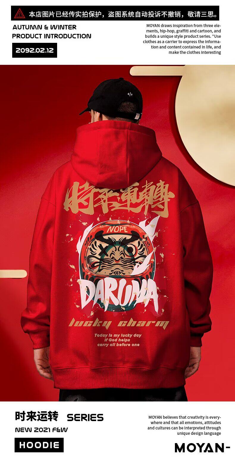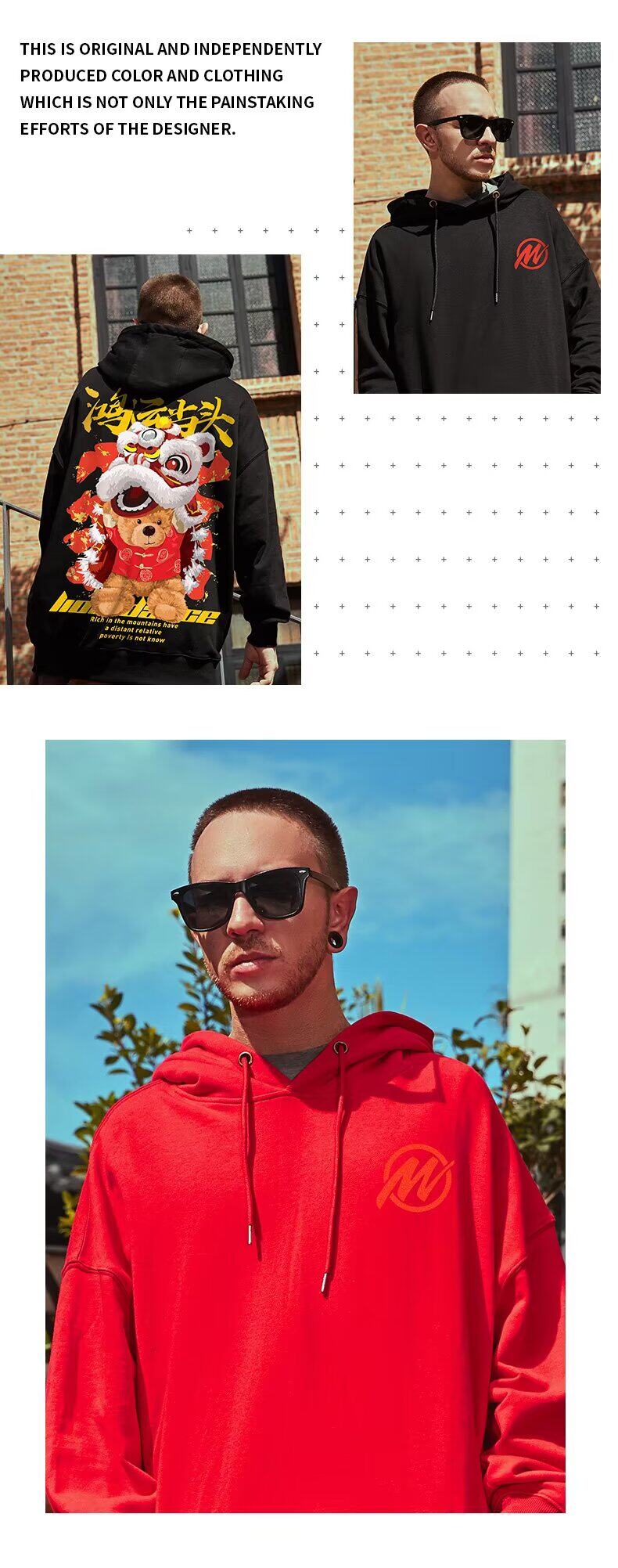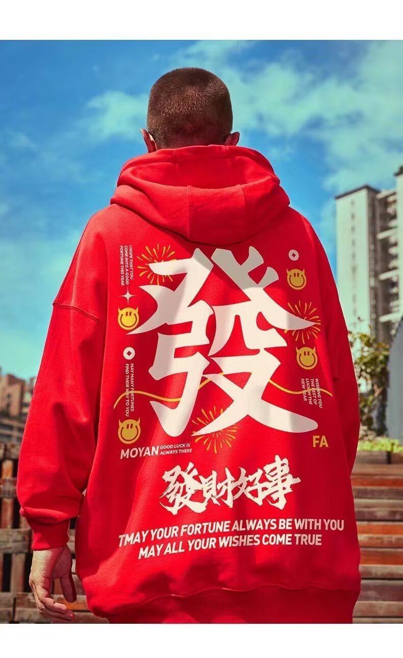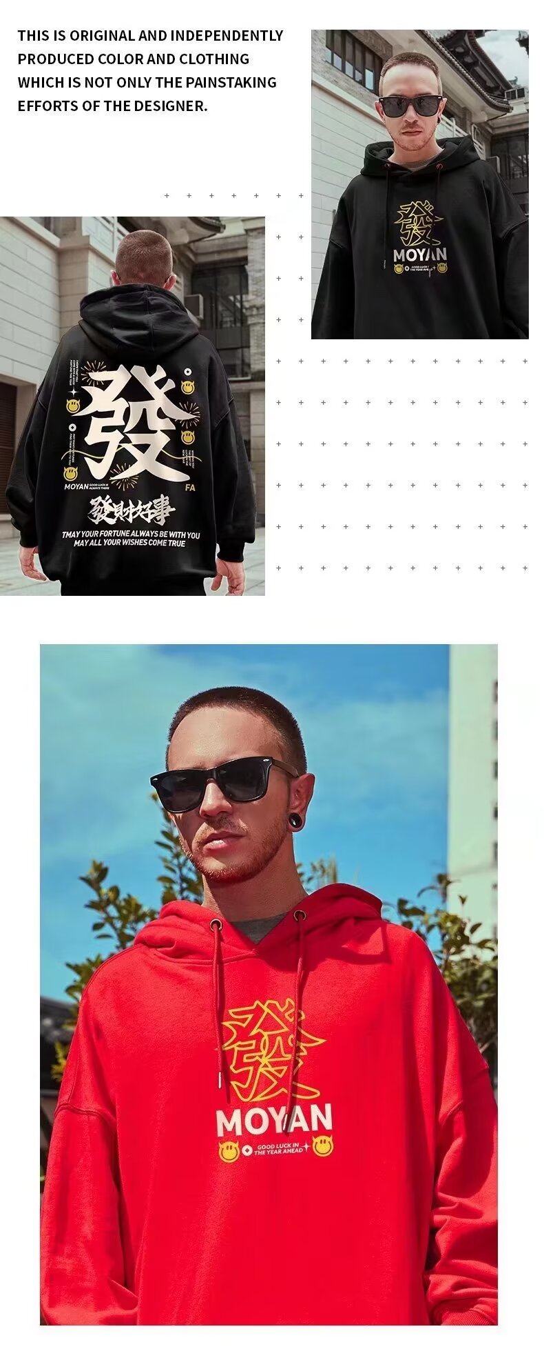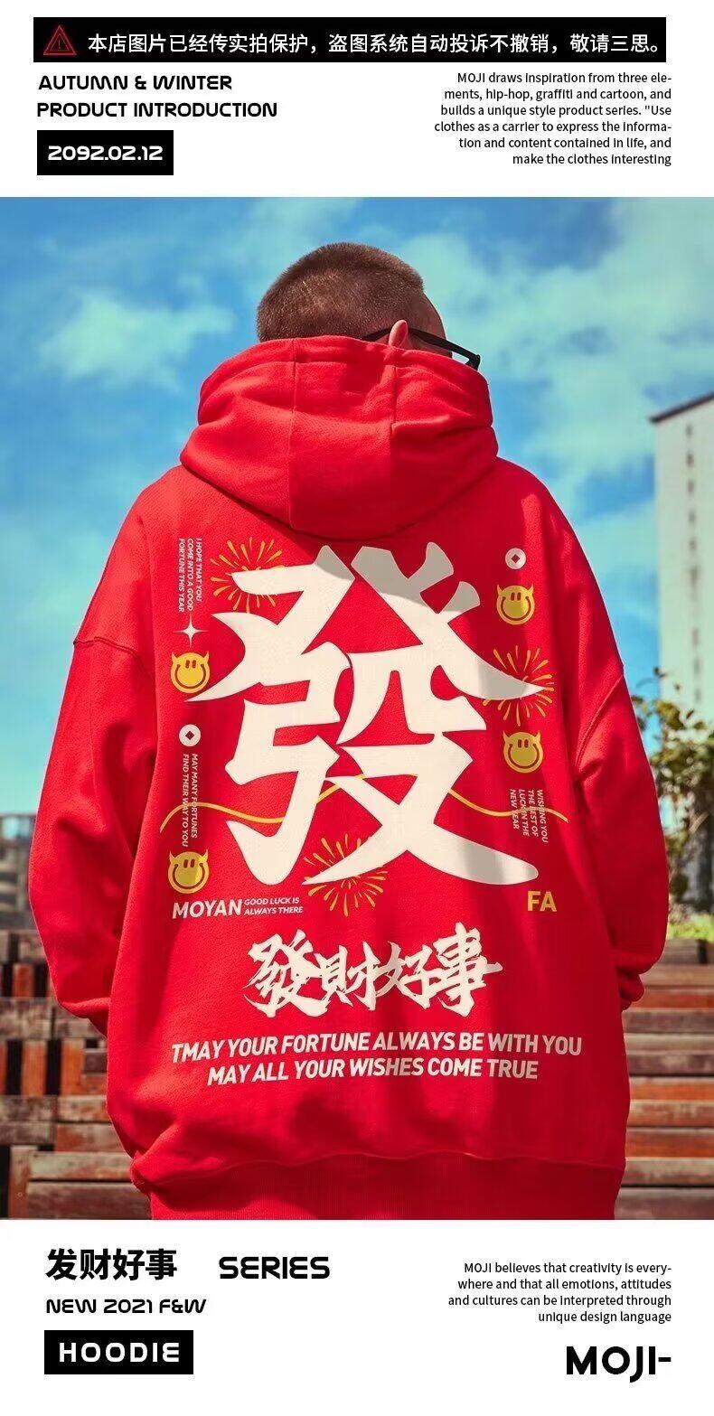 國潮發財風紅色本命年連帽套頭衛衣男寬鬆大加絨加厚新年外套