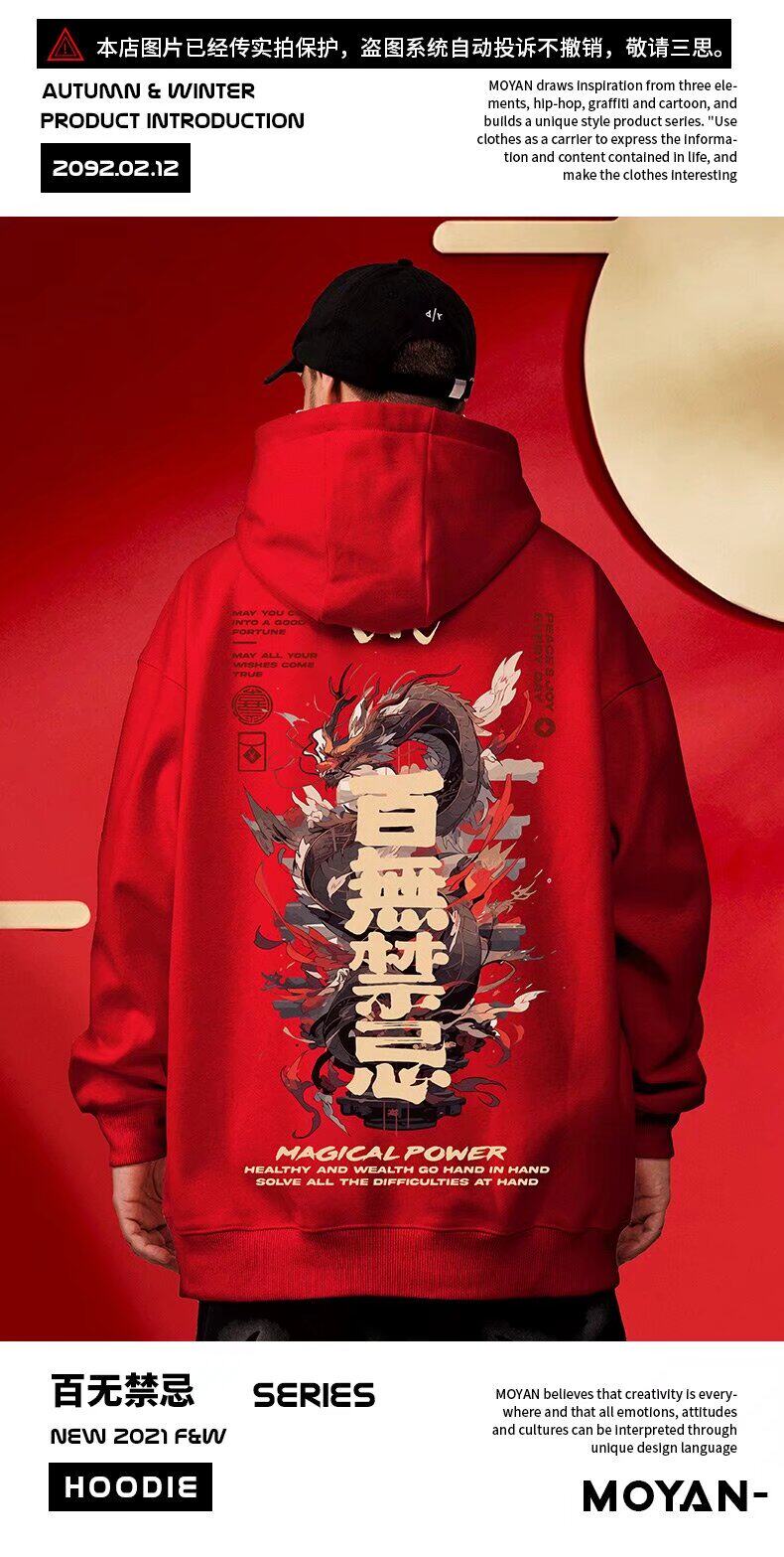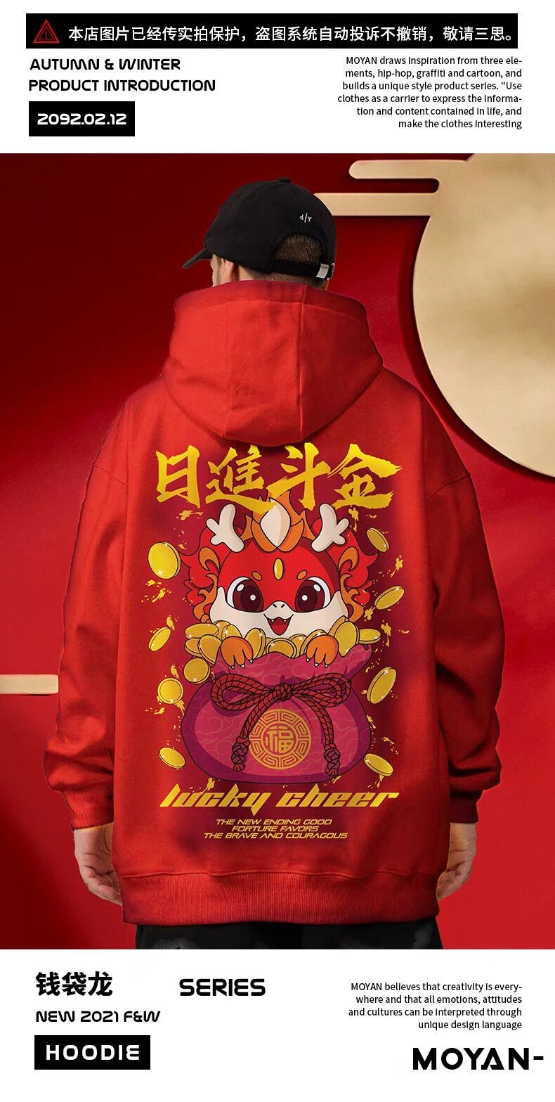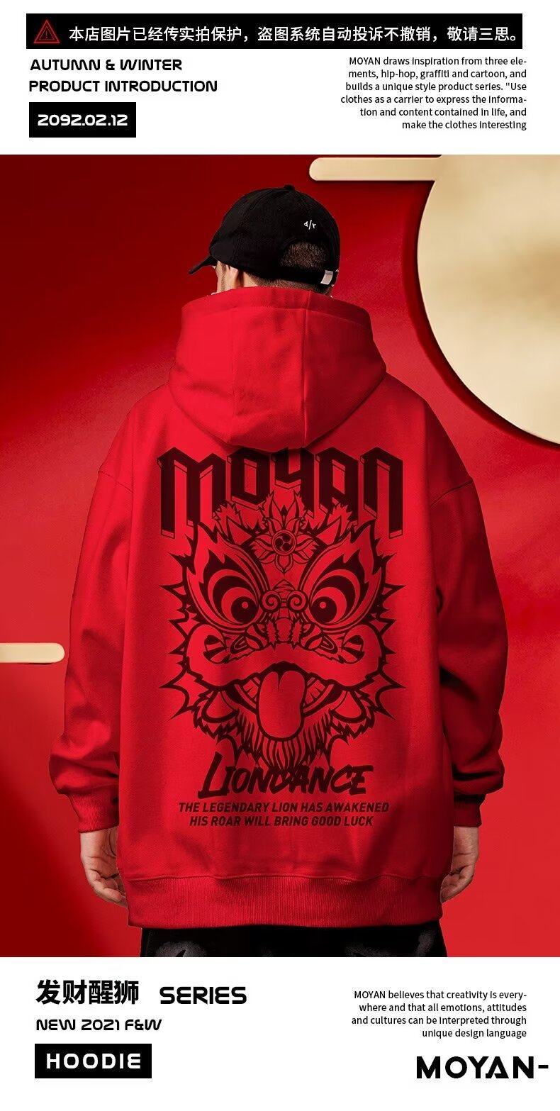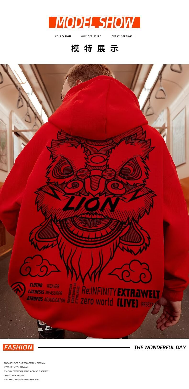 國潮發財風紅色本命年連帽套頭衛衣男寬鬆大加絨加厚新年外套