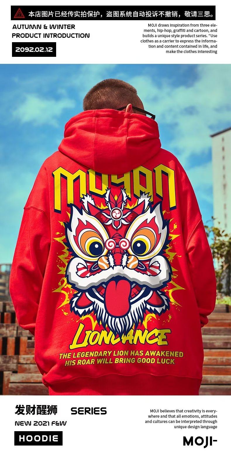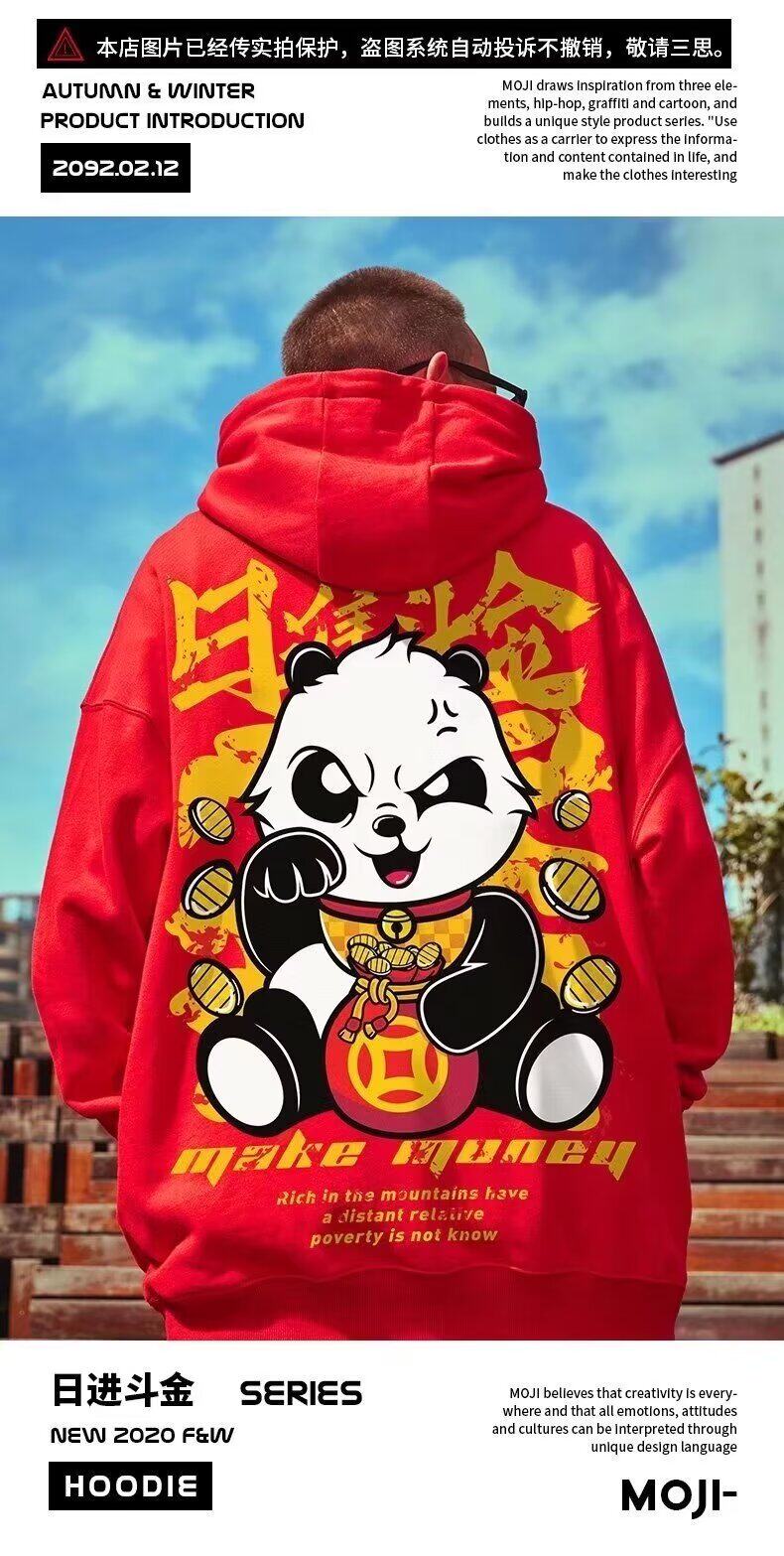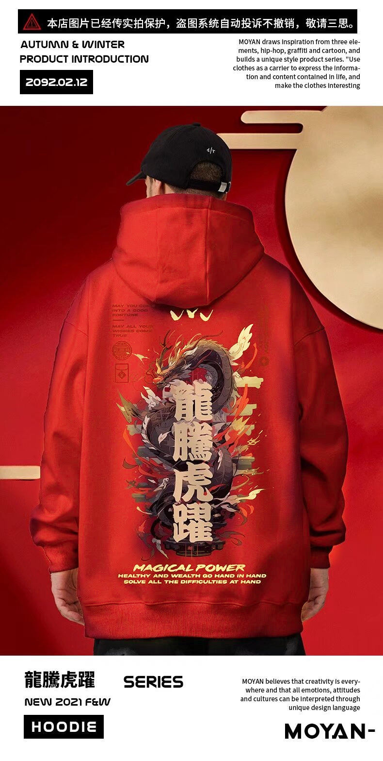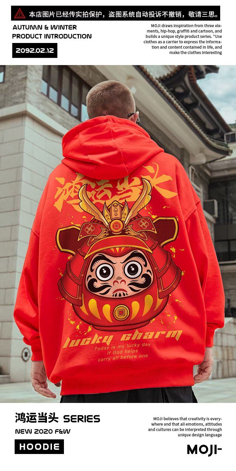 國潮發財風紅色本命年連帽套頭衛衣男寬鬆大加絨加厚新年外套