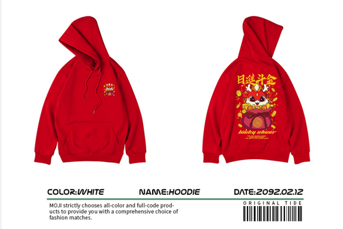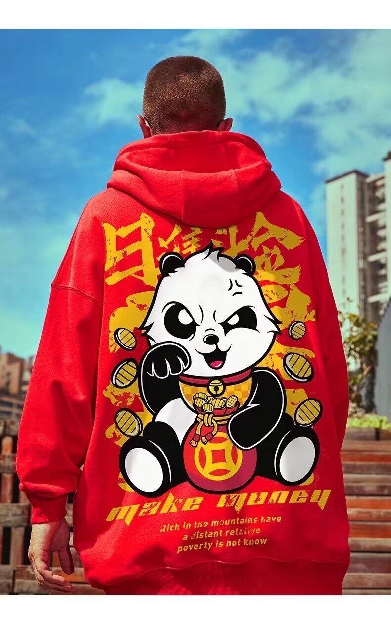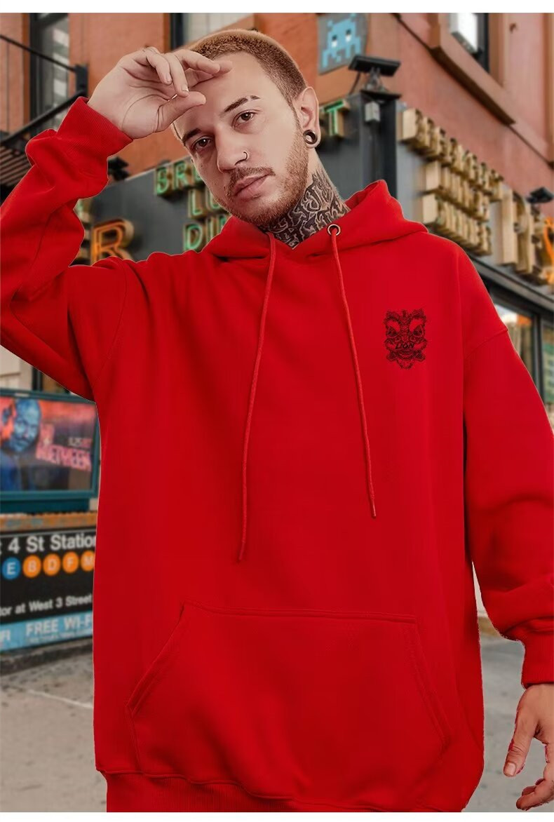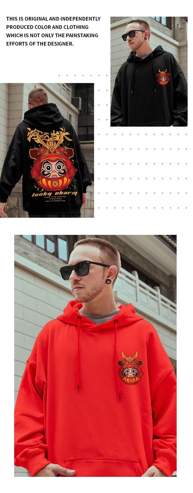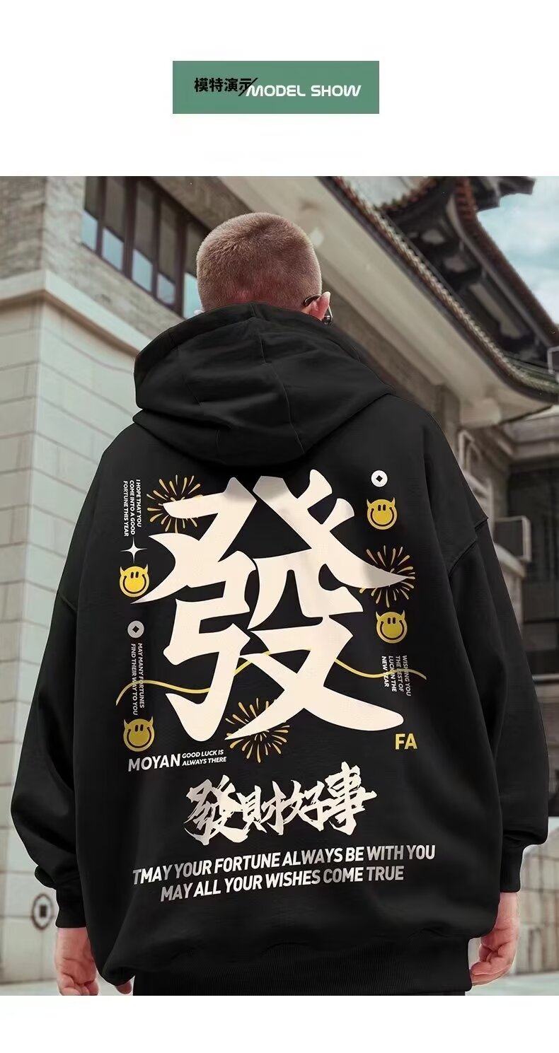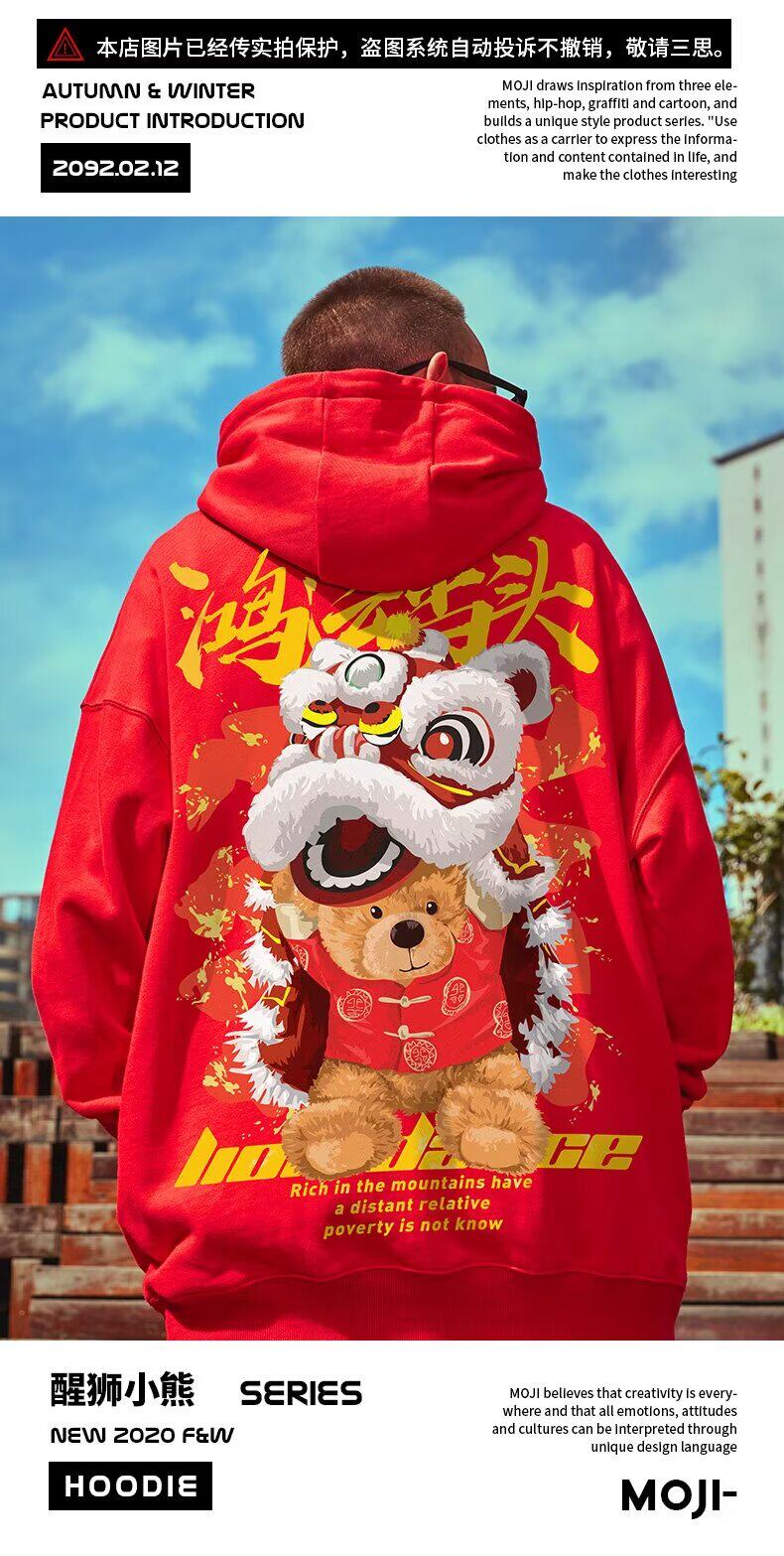 國潮發財風紅色本命年連帽套頭衛衣男寬鬆大加絨加厚新年外套
