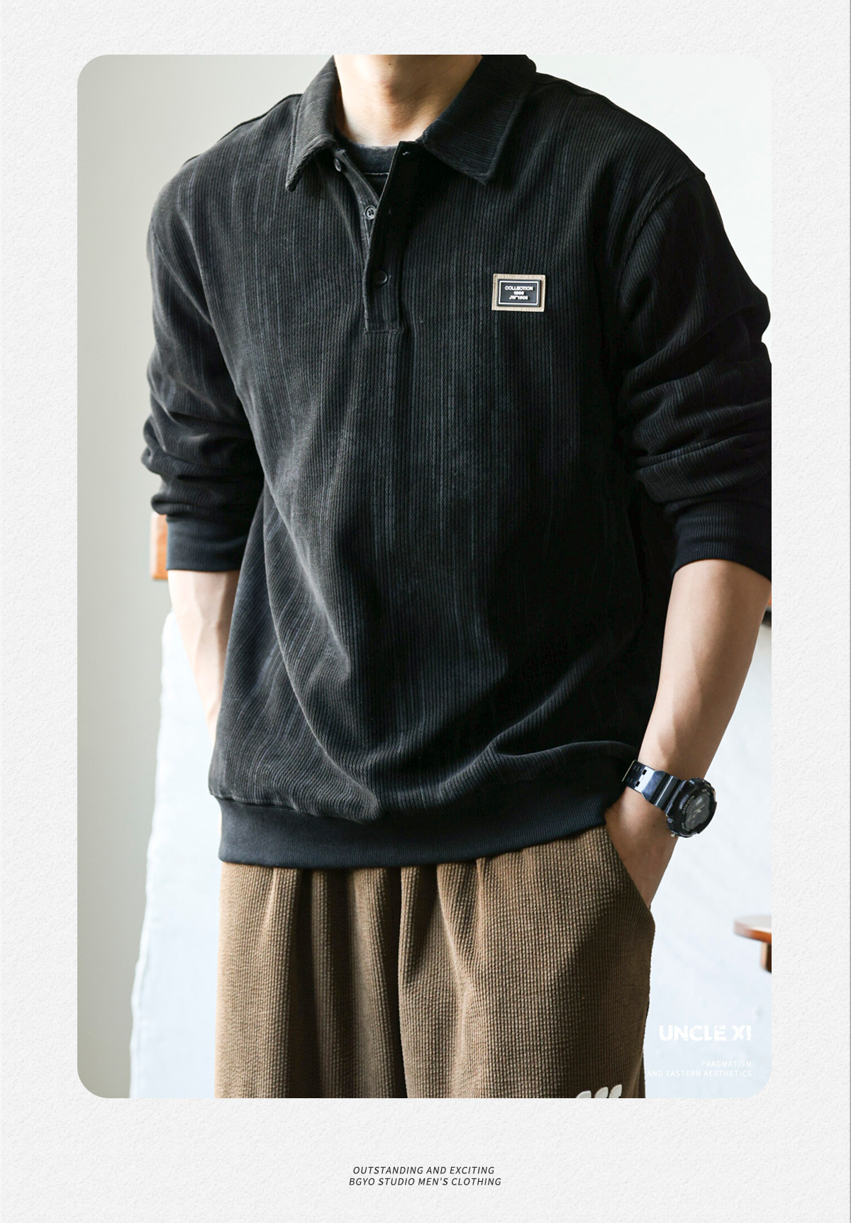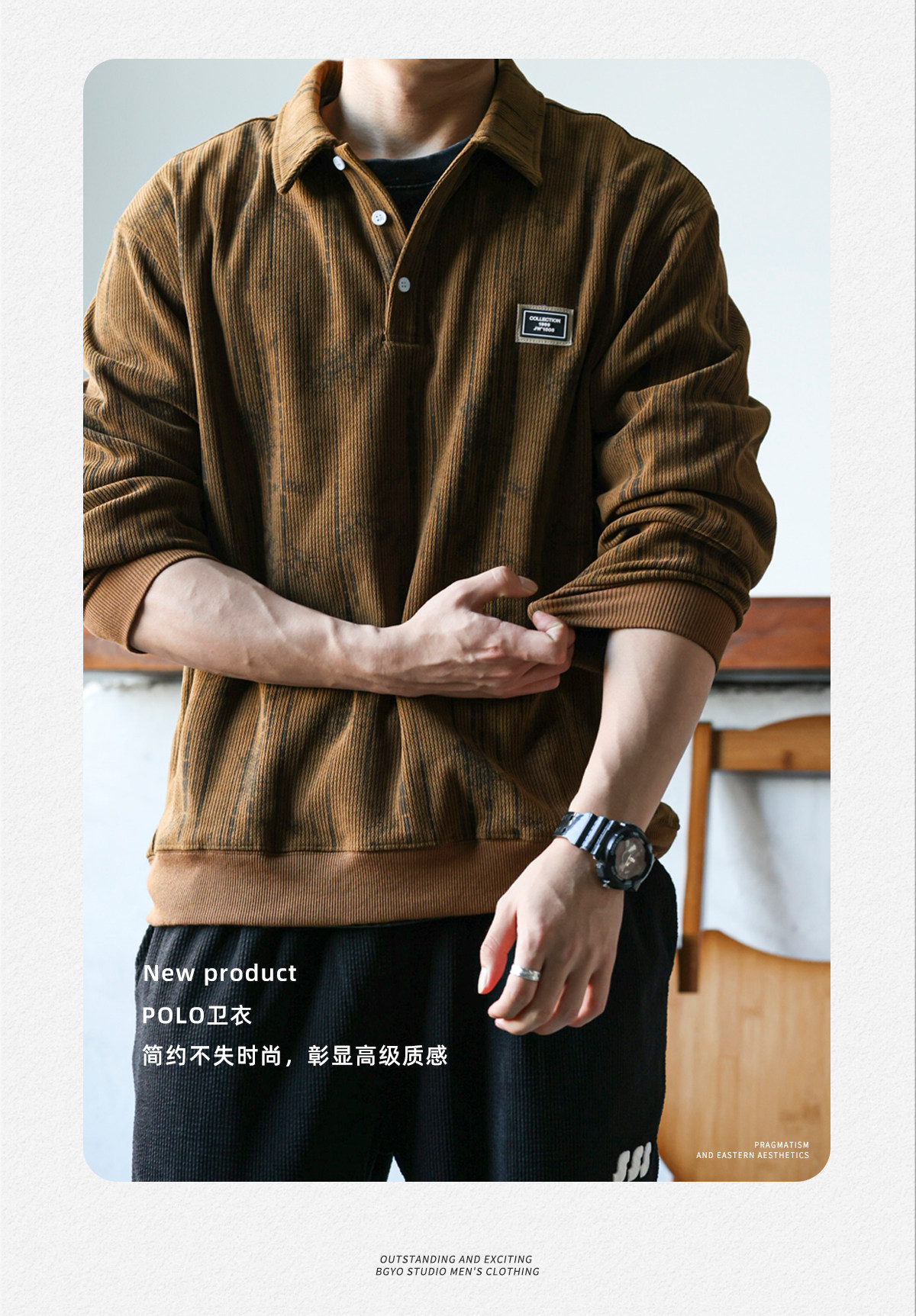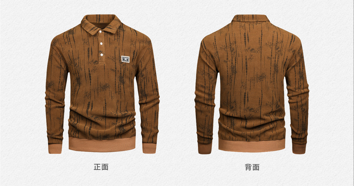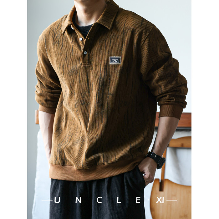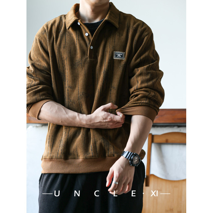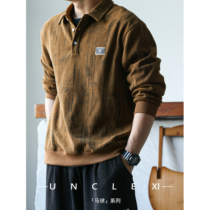 休閒美式重磅400g長袖繙領肌理感polo衫男士寬鬆衛衣復古打底衫春