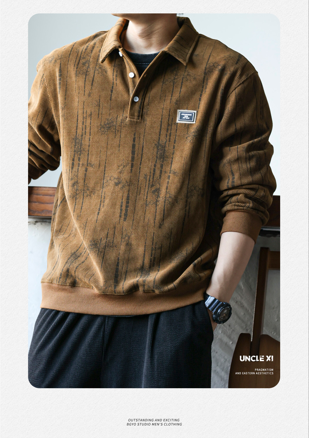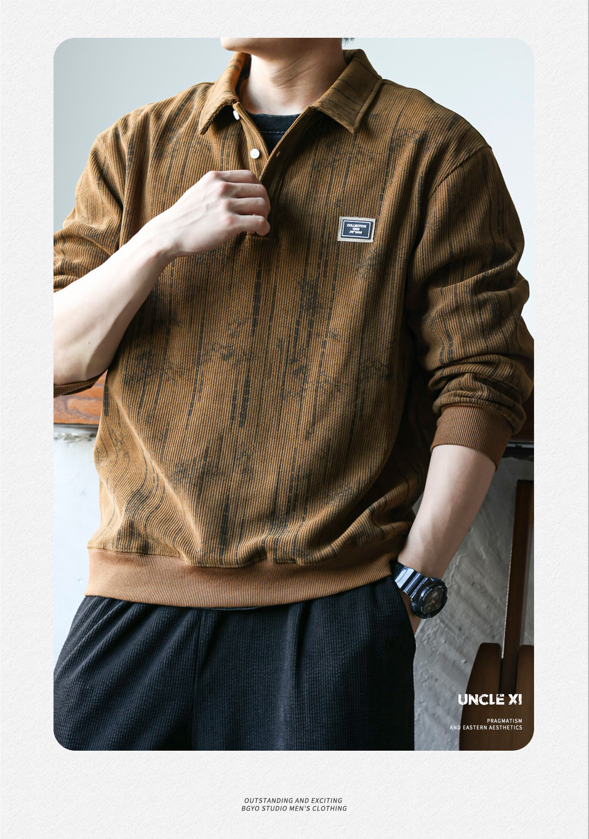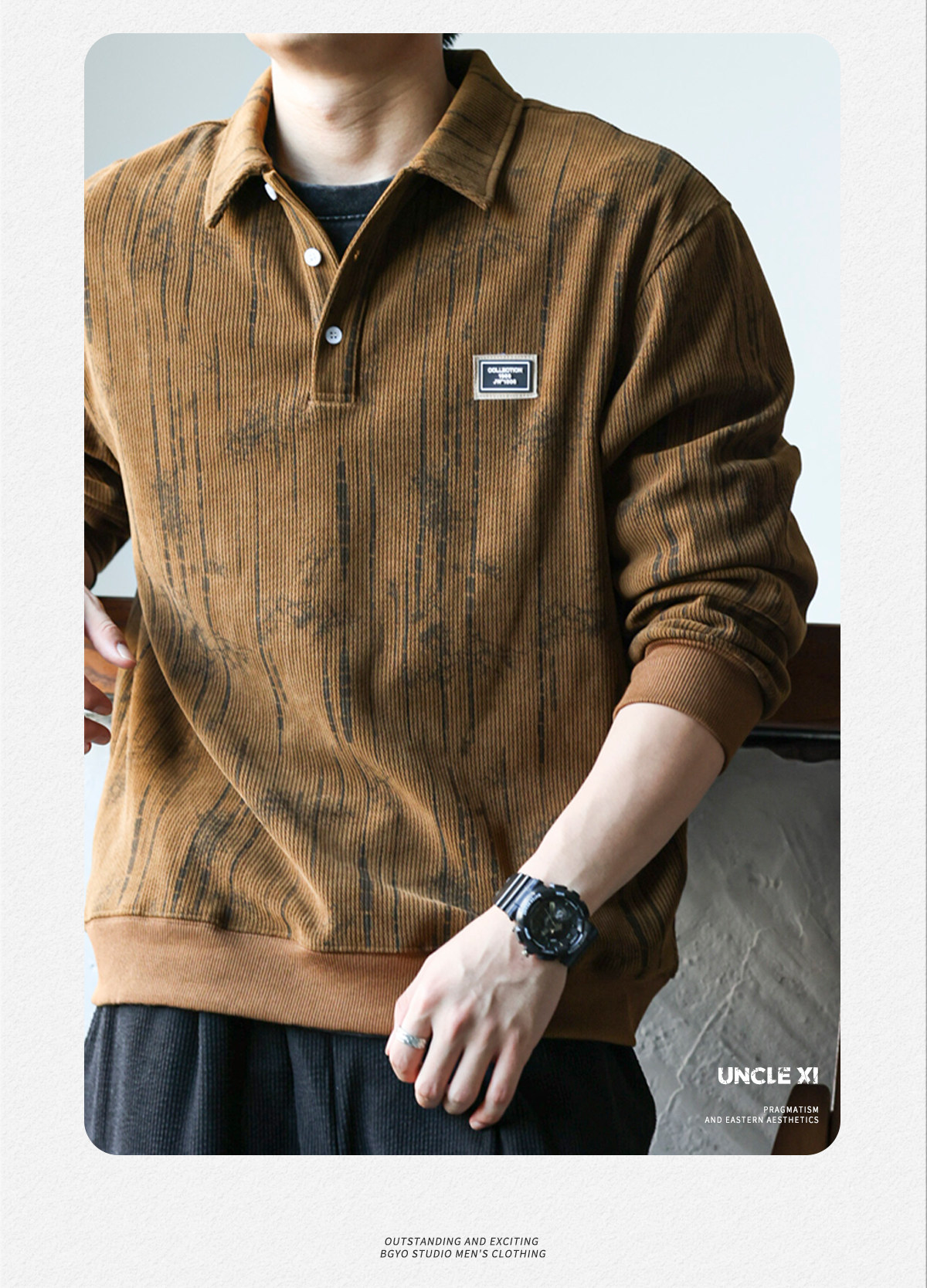 休閒美式重磅400g長袖繙領肌理感polo衫男士寬鬆衛衣復古打底衫春