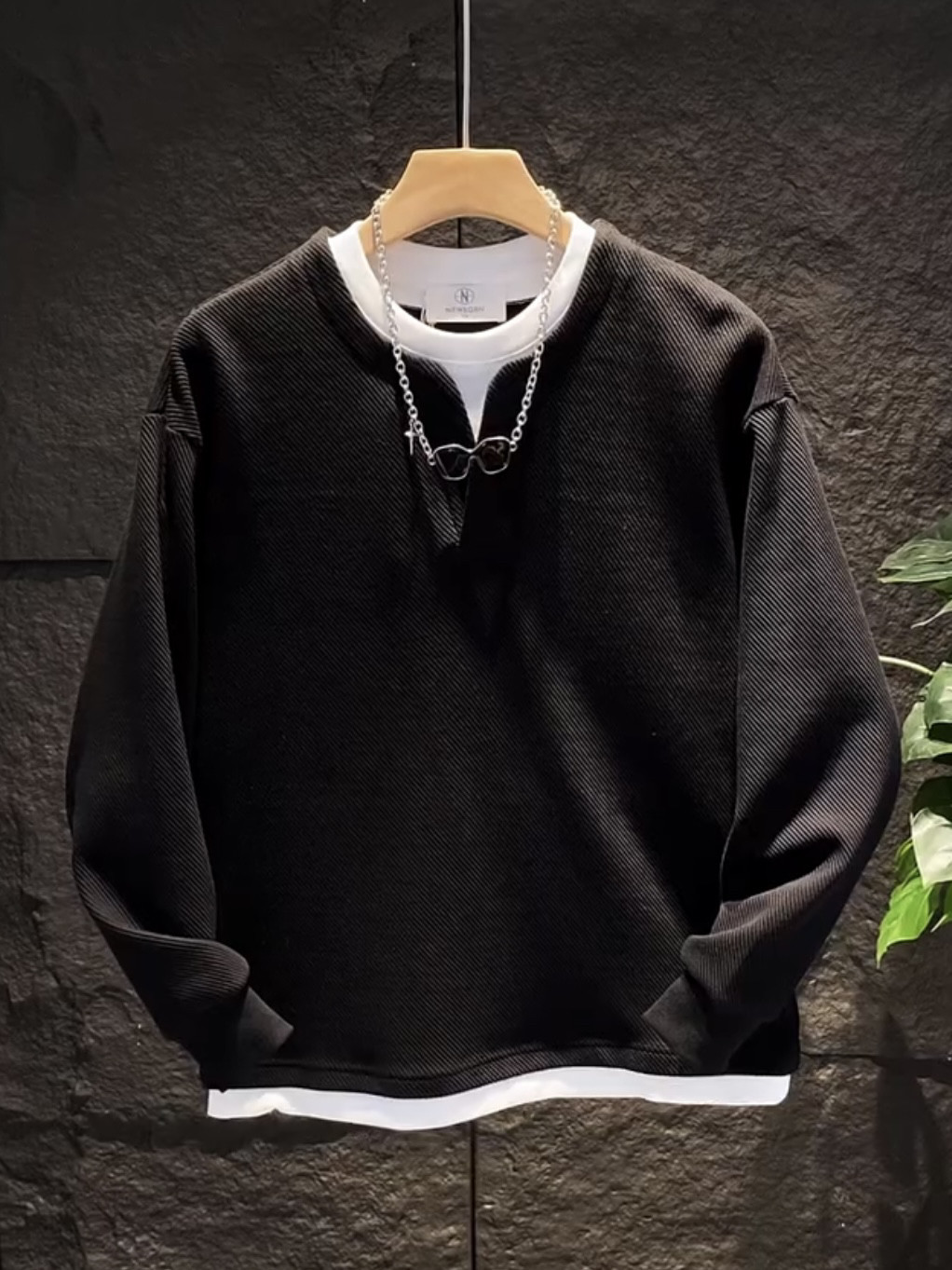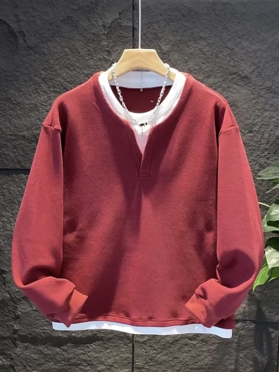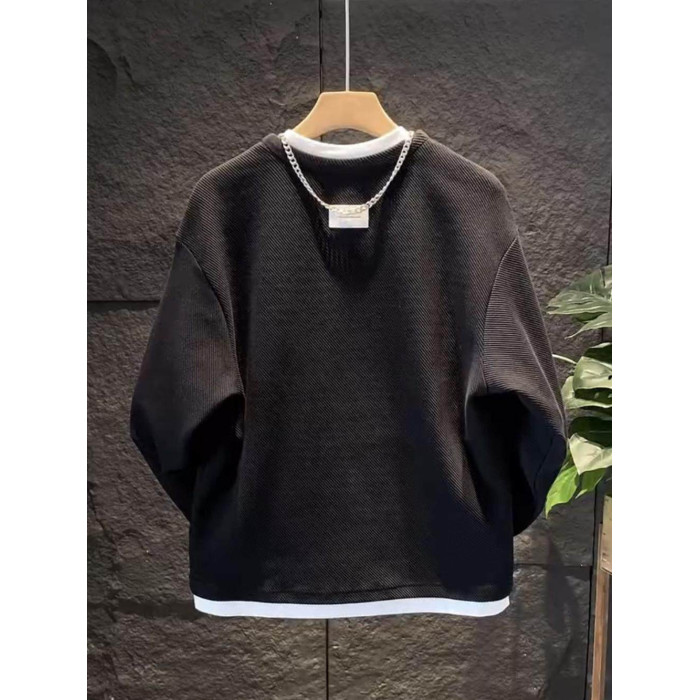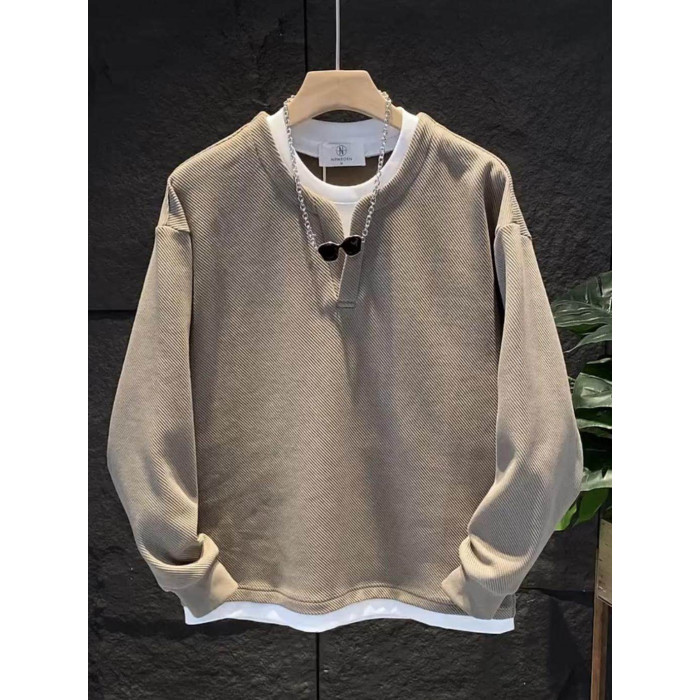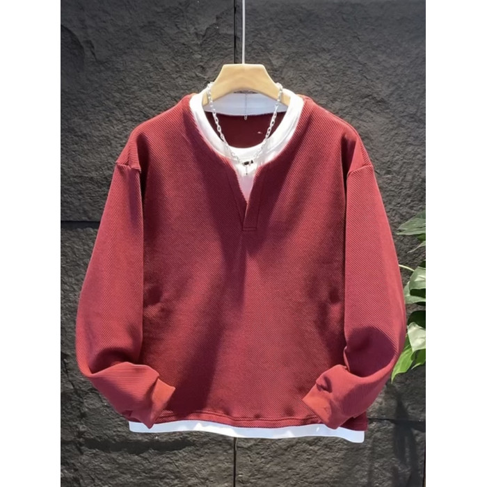 假兩件拼接慵懶風V圓領衛衣男潮流高級寬鬆百搭情侶長袖T恤打底衫