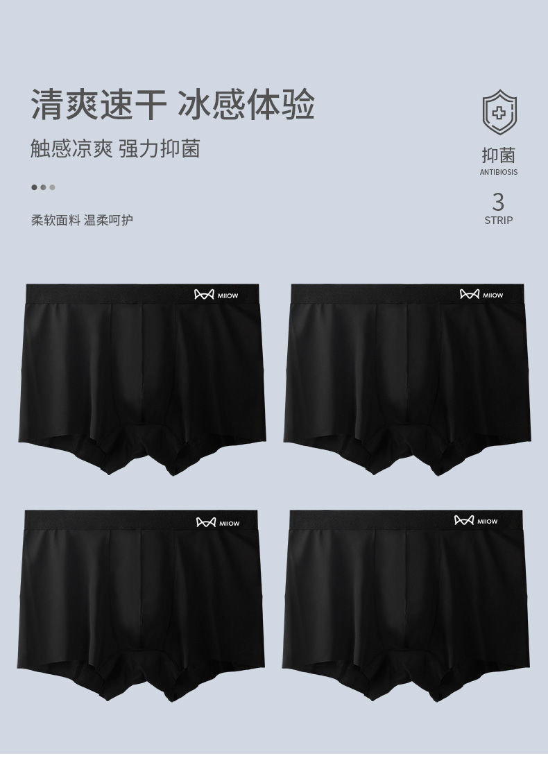 貓人男士內褲黑色冰絲石墨烯抗菌透氣平角男夏季速乾運動四角短褲