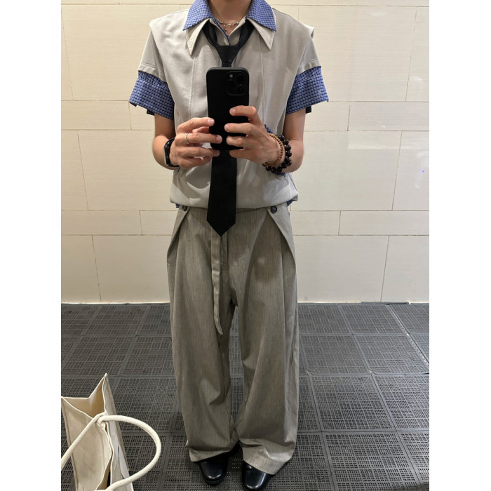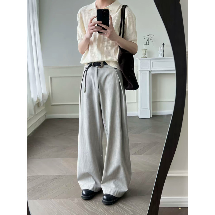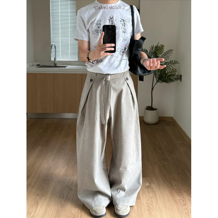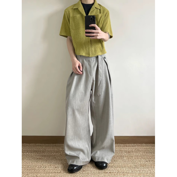 NO7YAN 亞麻紋休閒羊毛混紡坐禪西褲輕薄夏季A字版濶腿褲