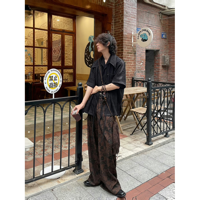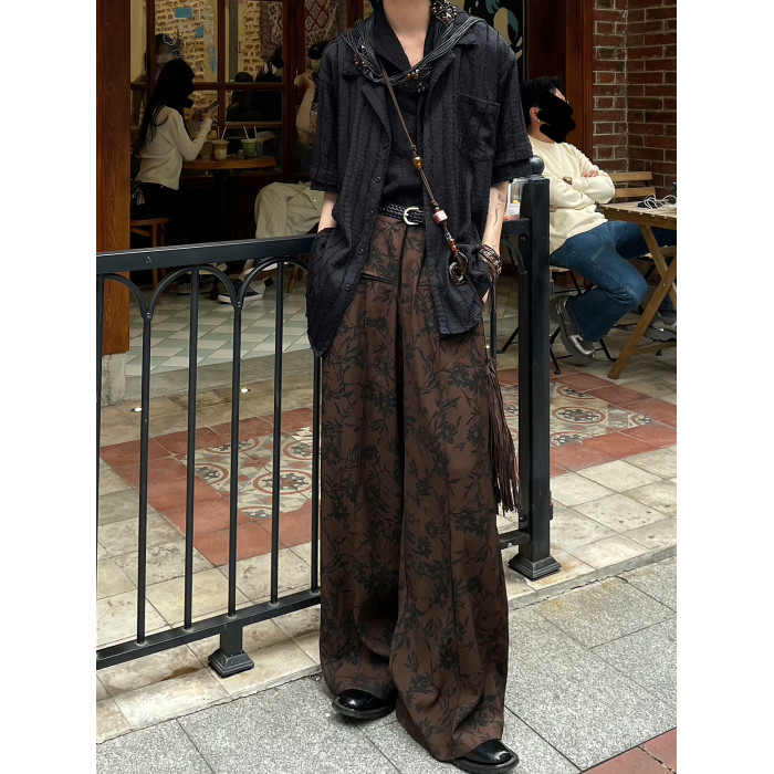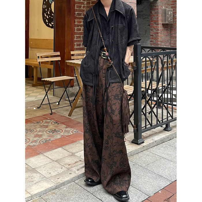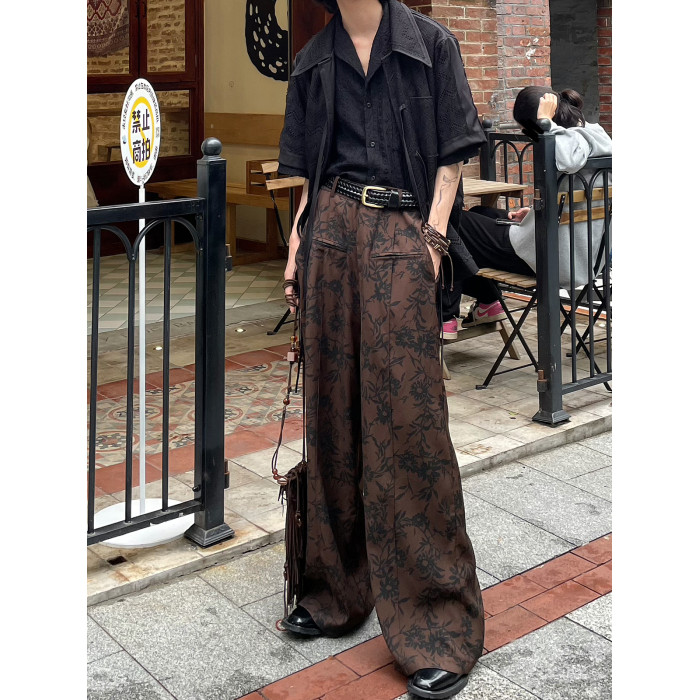 以休眠 復古小衆新中式日系水墨花卉濶腿褲拖地堆曡西褲休閒長褲