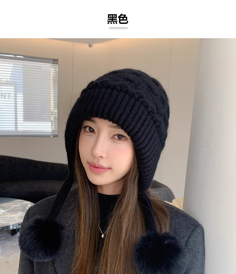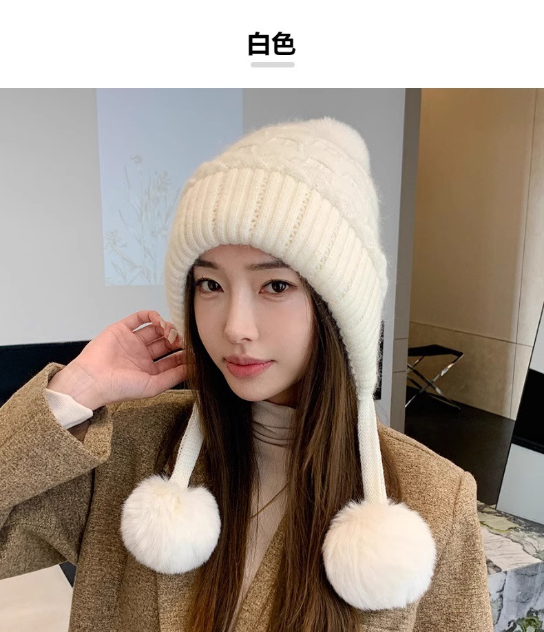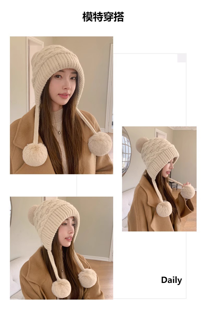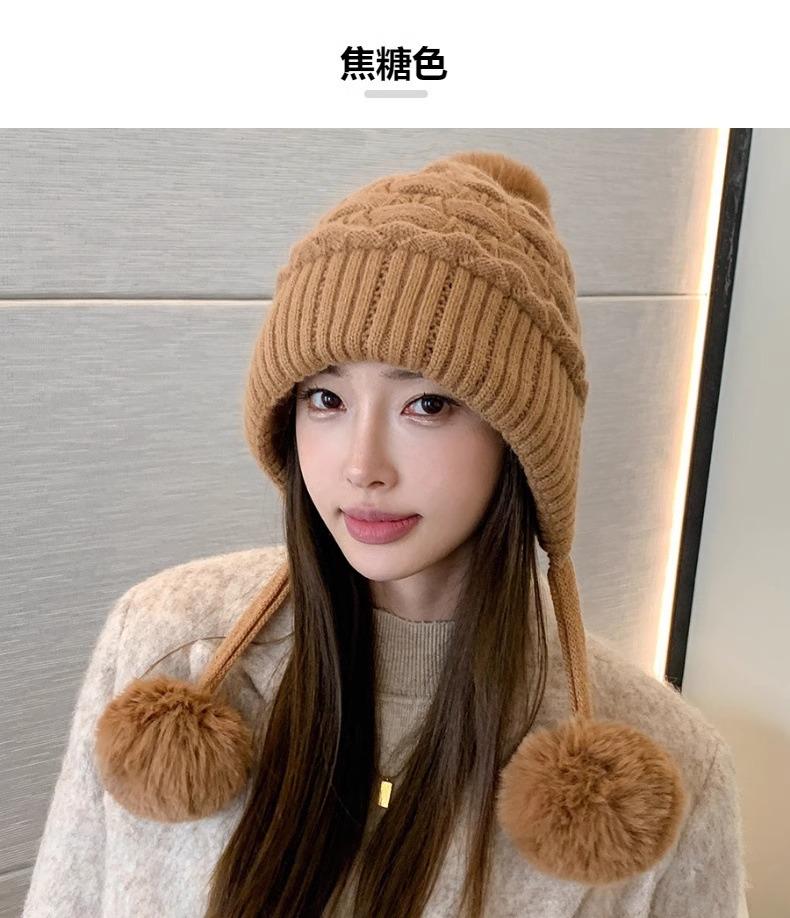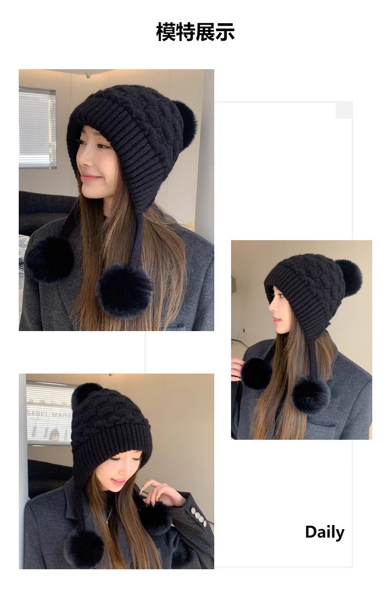 慵懶風加厚雙層護耳防寒三毛球兔毛帽子女冬季加絨護臉針織毛線帽