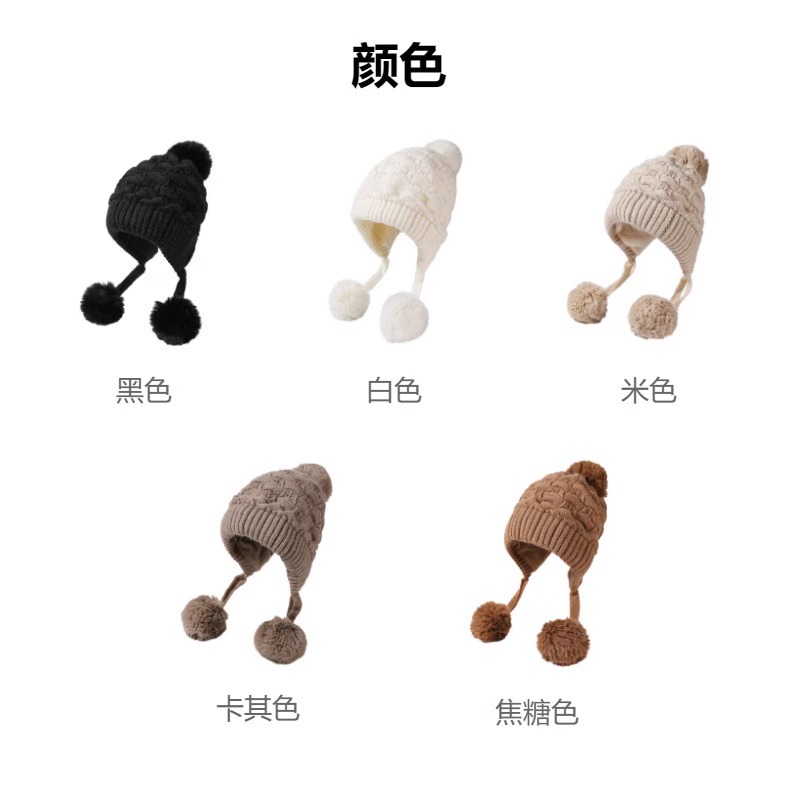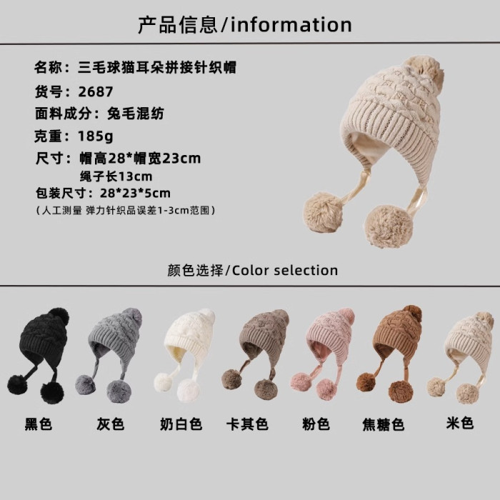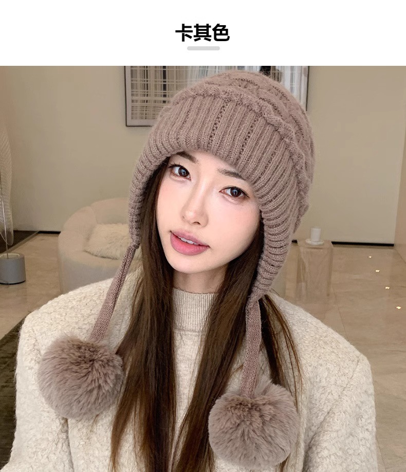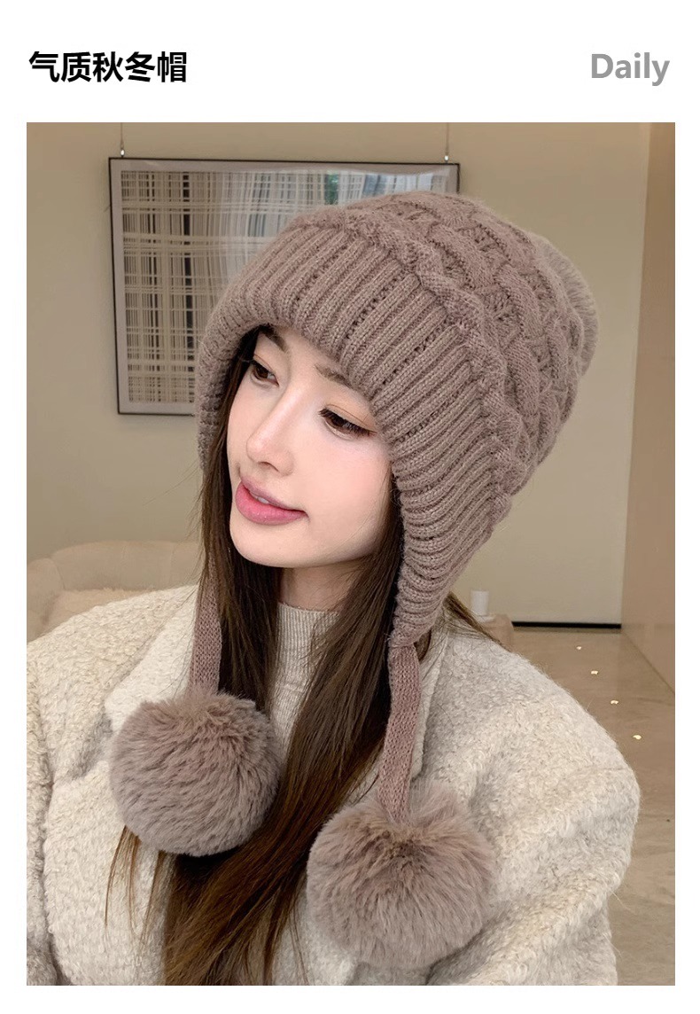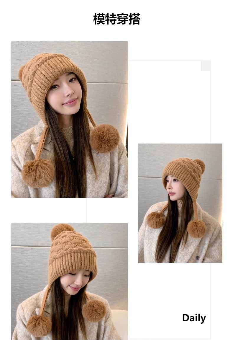 慵懶風加厚雙層護耳防寒三毛球兔毛帽子女冬季加絨護臉針織毛線帽