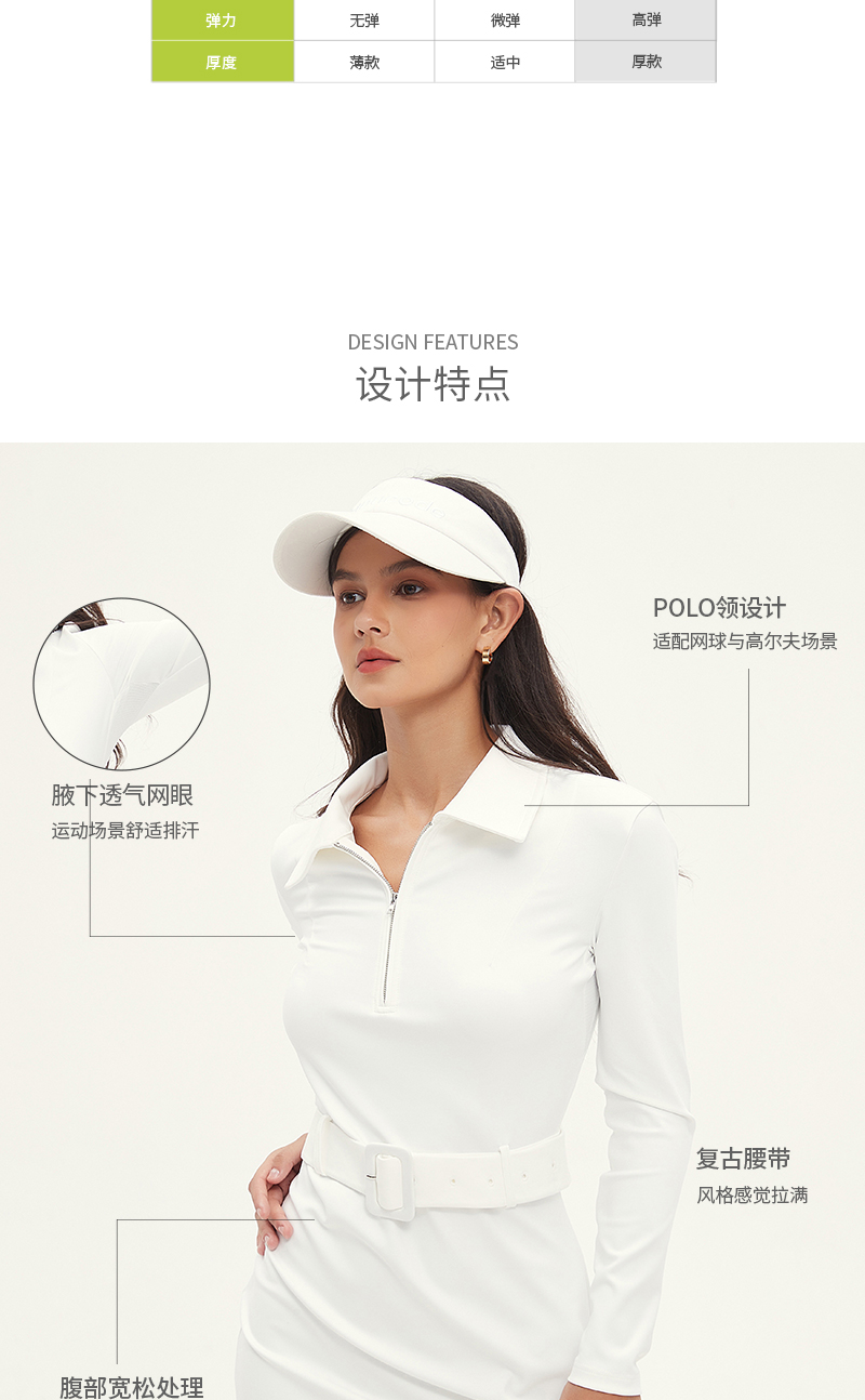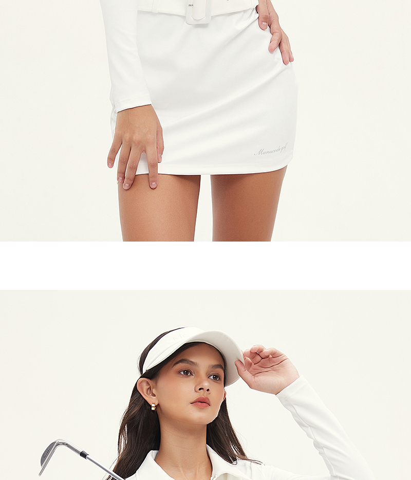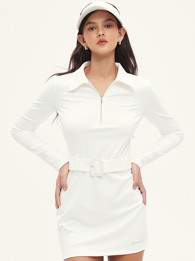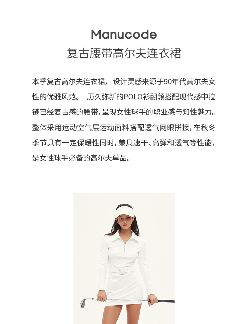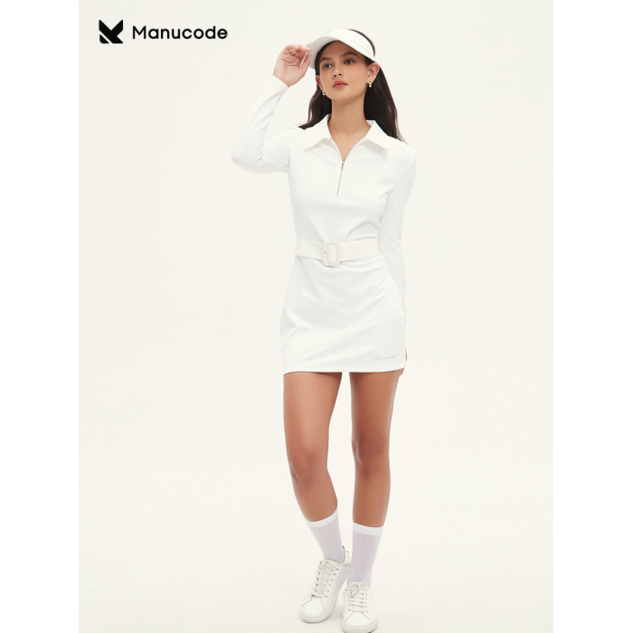 Manucode春秋新款復古腰帶連衣裙POLO翻領長袖包臀裙白高爾夫女裝