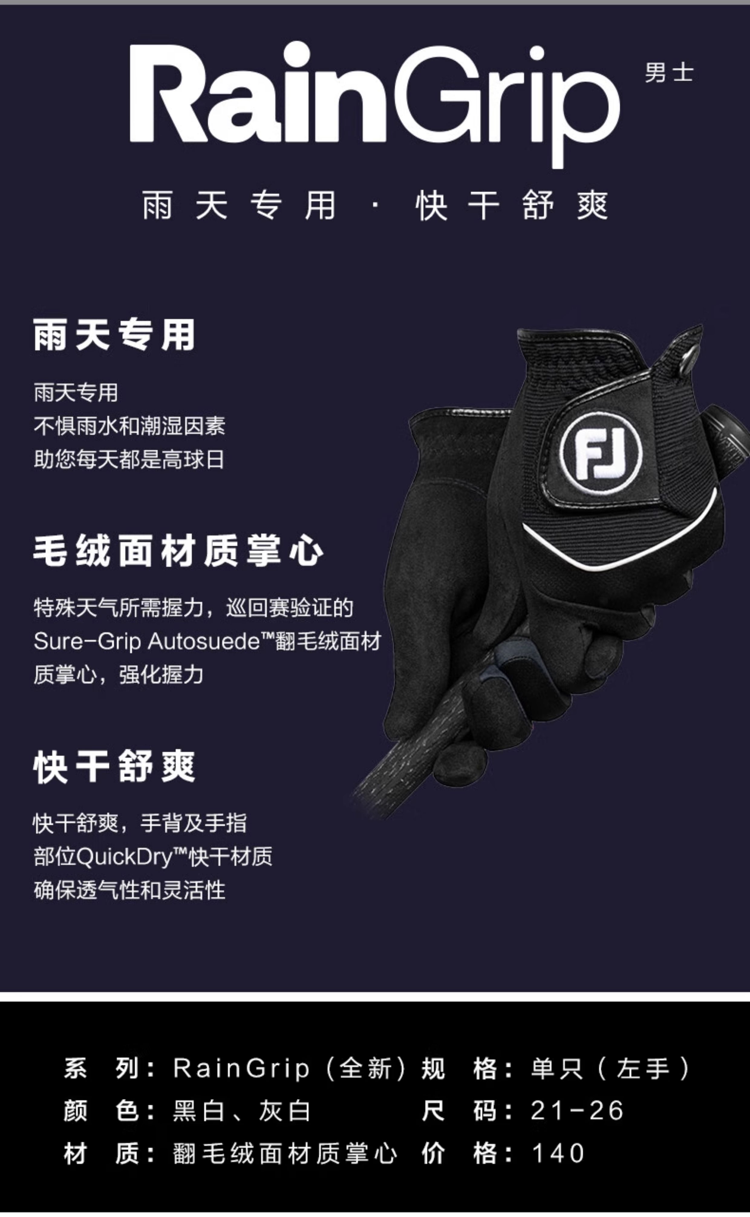 FootJoy高爾夫球手套男士RAINGRIP雨天防滑透氣耐磨FJ布手套