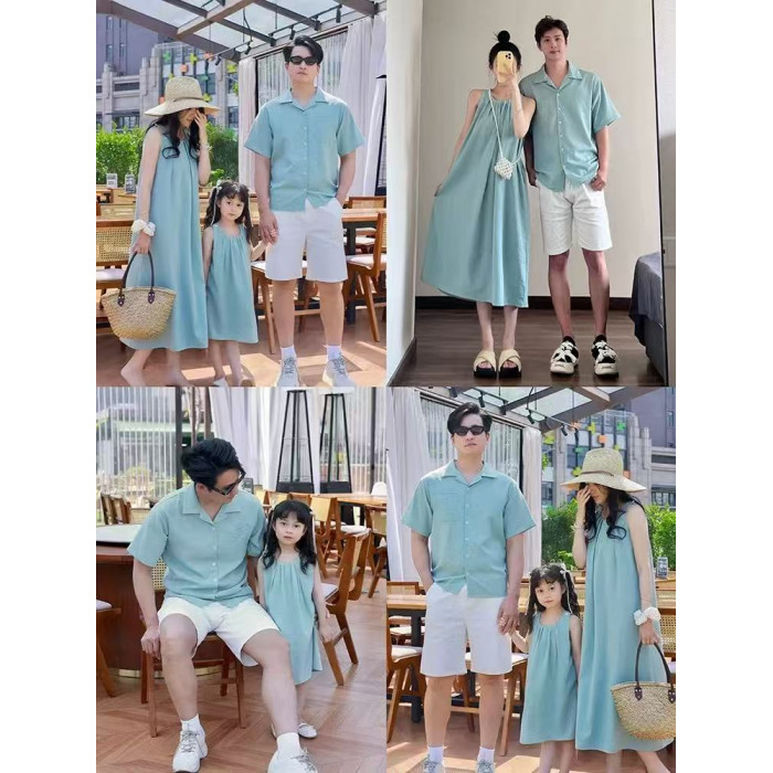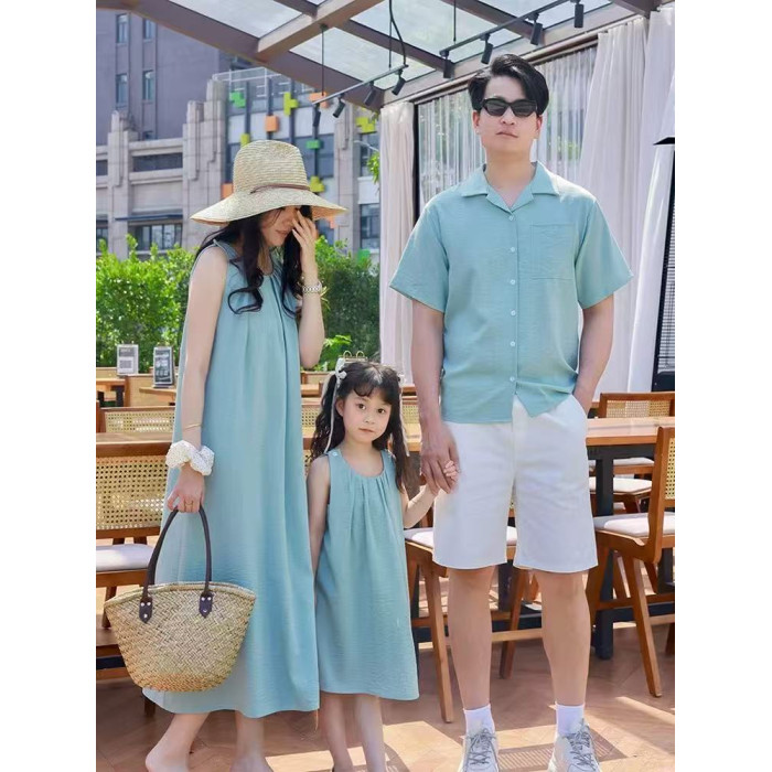 法式親子裝夏季高級一家三口全家裝襯衫三亞海邊度假母女連衣裙