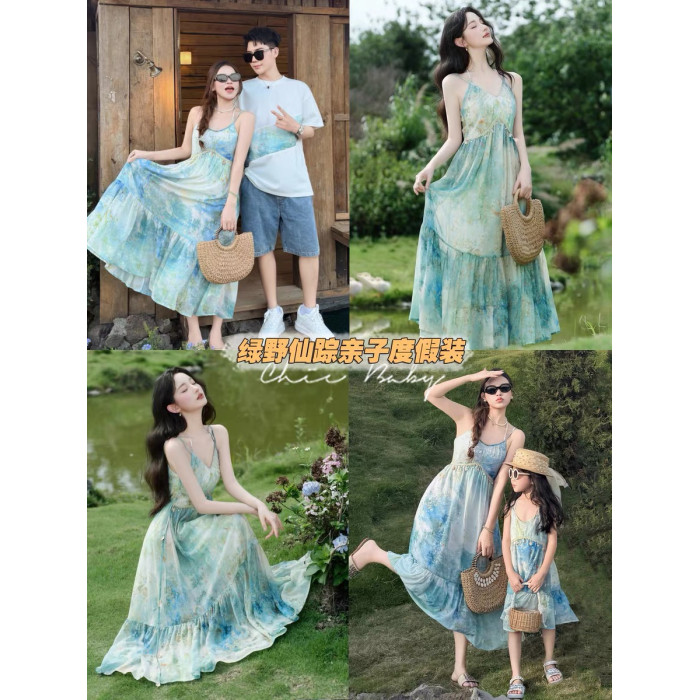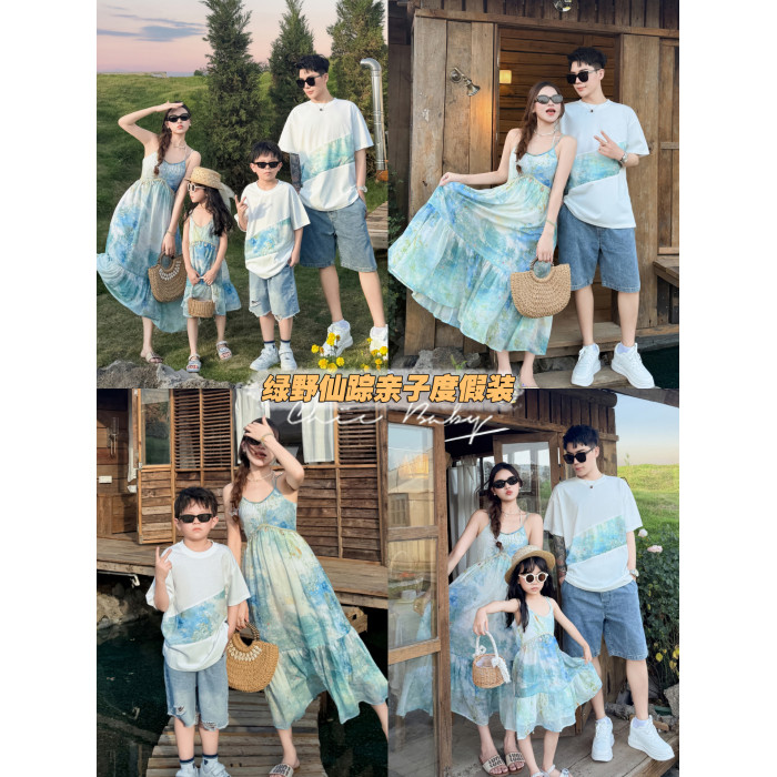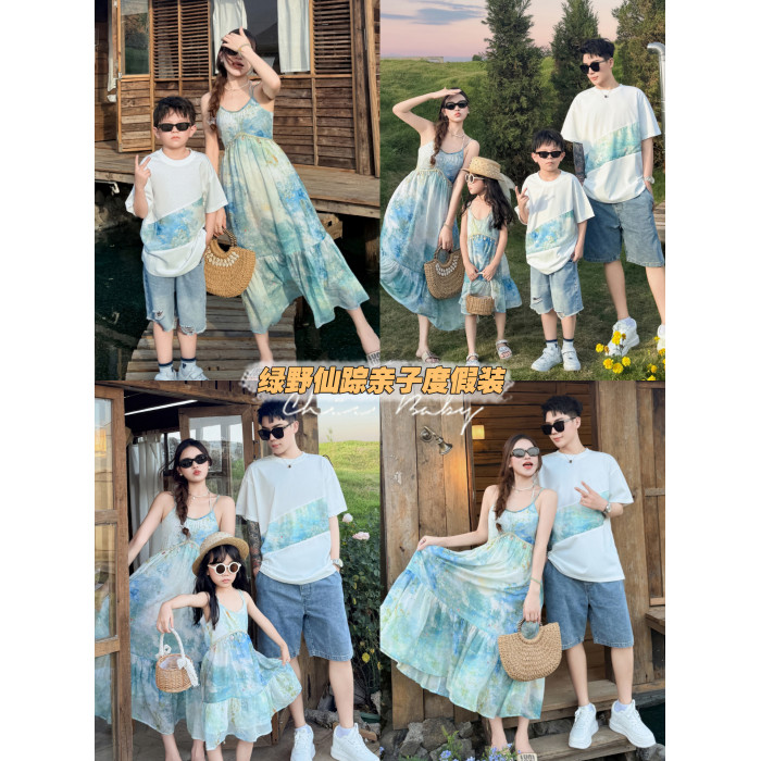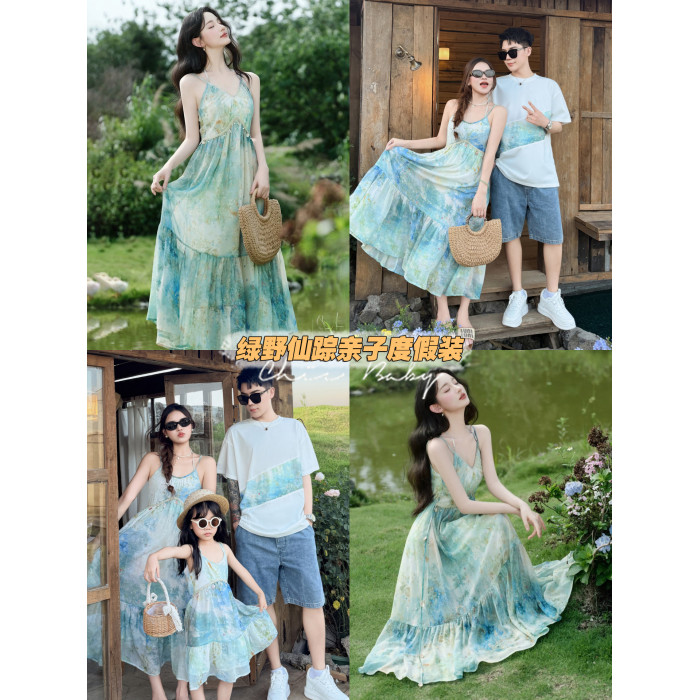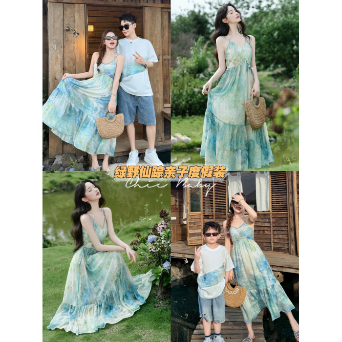 度假親子裝一家三口仙美母女吊帶暈染連衣長裙三亞海邊母子短袖T