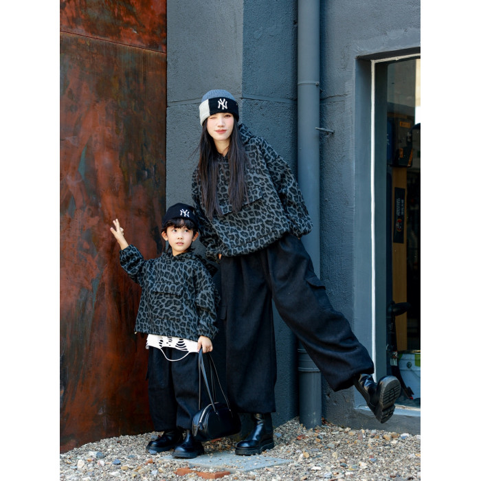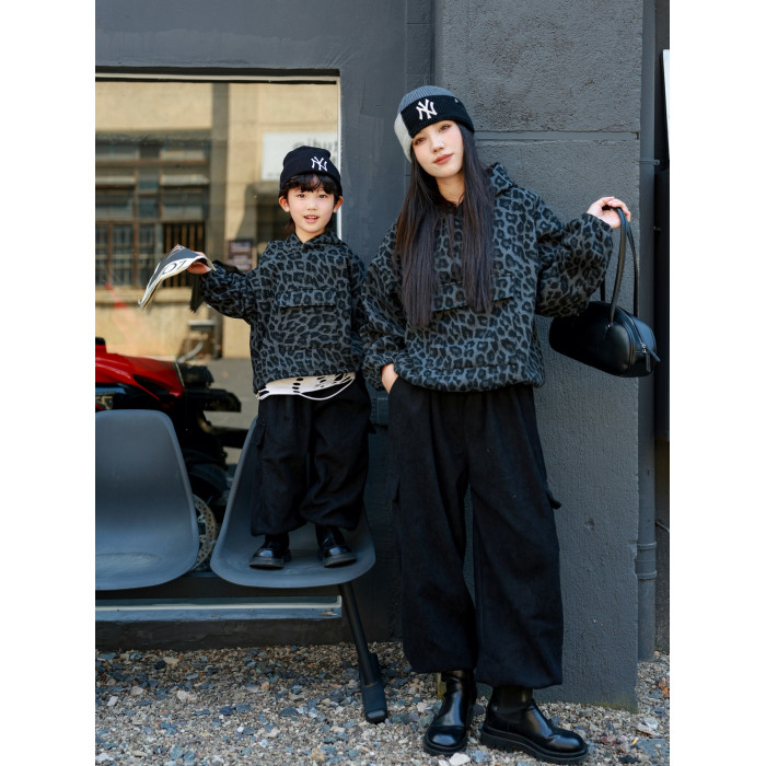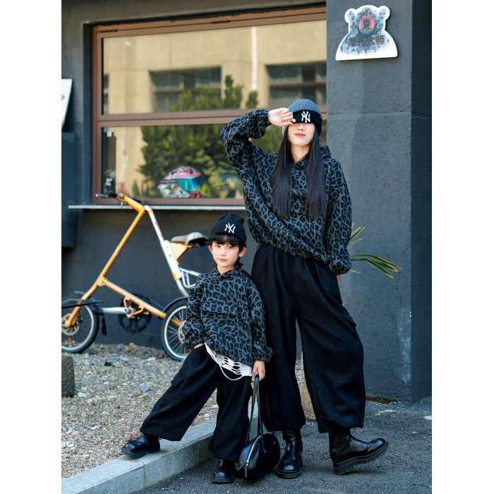 又酷又颯親子裝母子港風復古豹紋衛衣冬季兒童洋氣時髦連帽外套潮