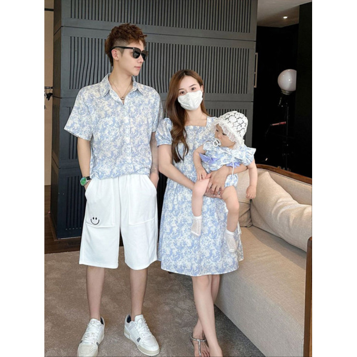 三亞親子裝夏款短袖父子裝襯衫一家三口四口女寶嬰兒母女裝碎花裙