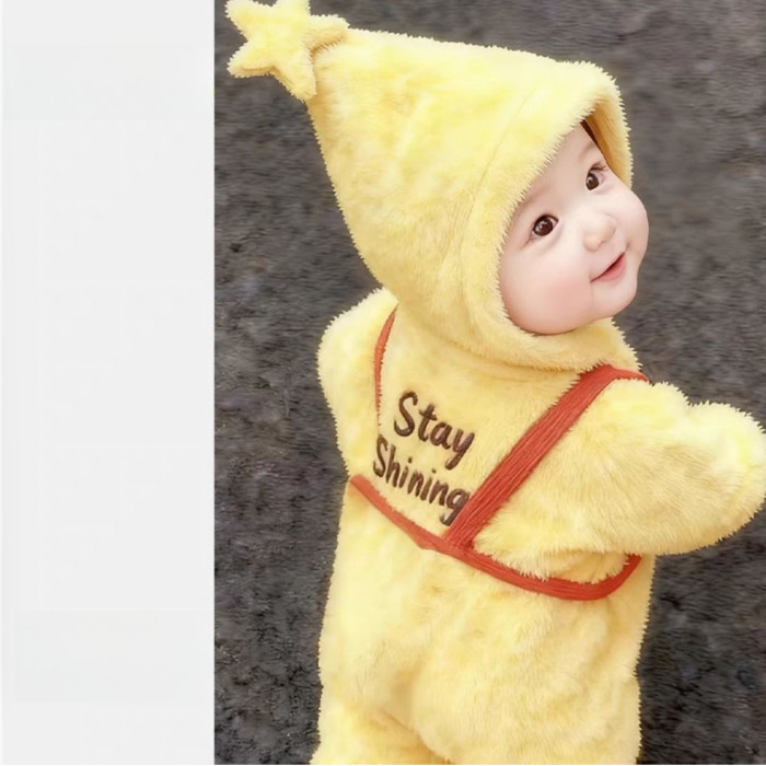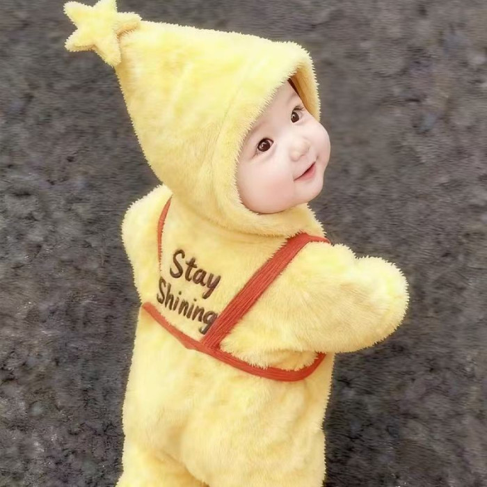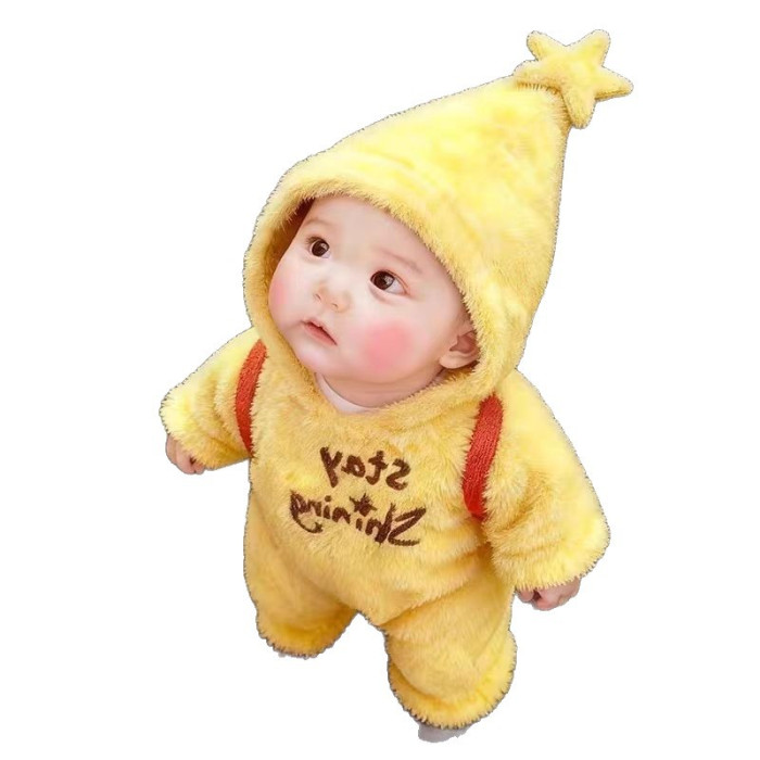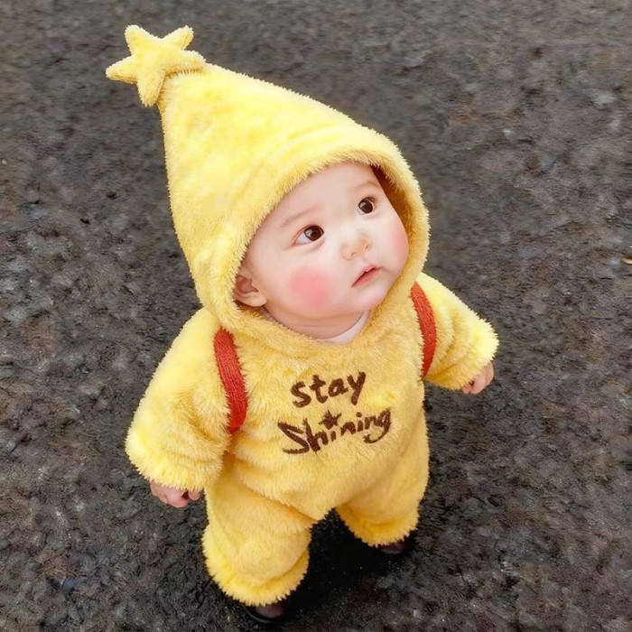 嬰兒冬裝黃色星星人兒童可愛超萌連體衣寶寶加絨厚外出爬服