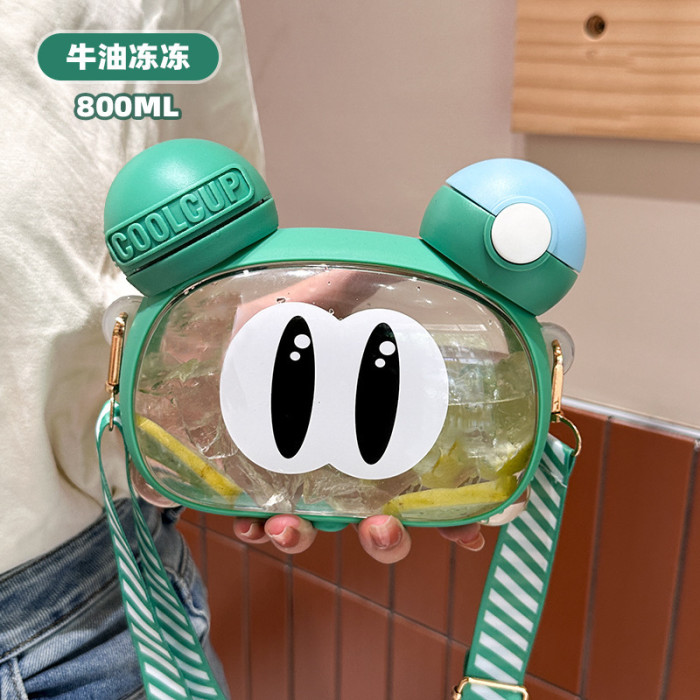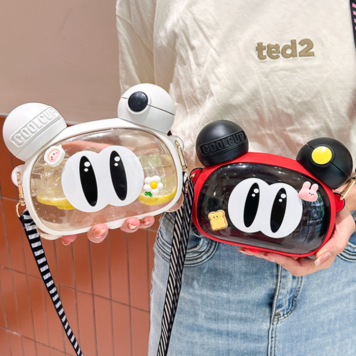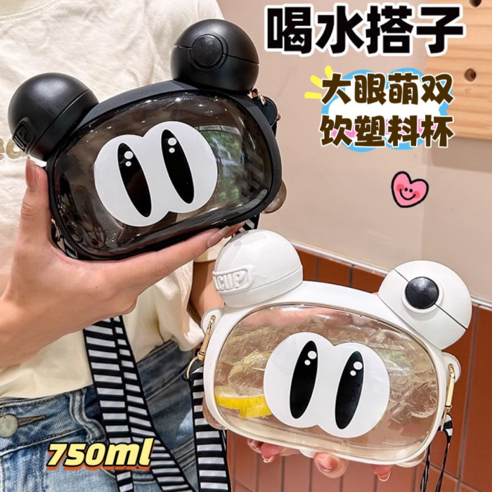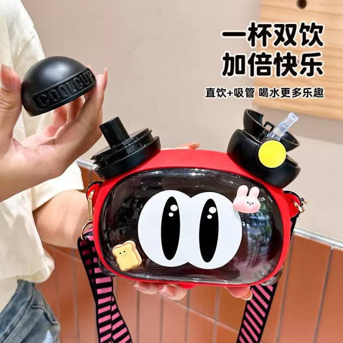 夏季大眼萌萌水杯創意雙飲杯高顔值帶吸管塑膠杯子學生戶外可攜式杯