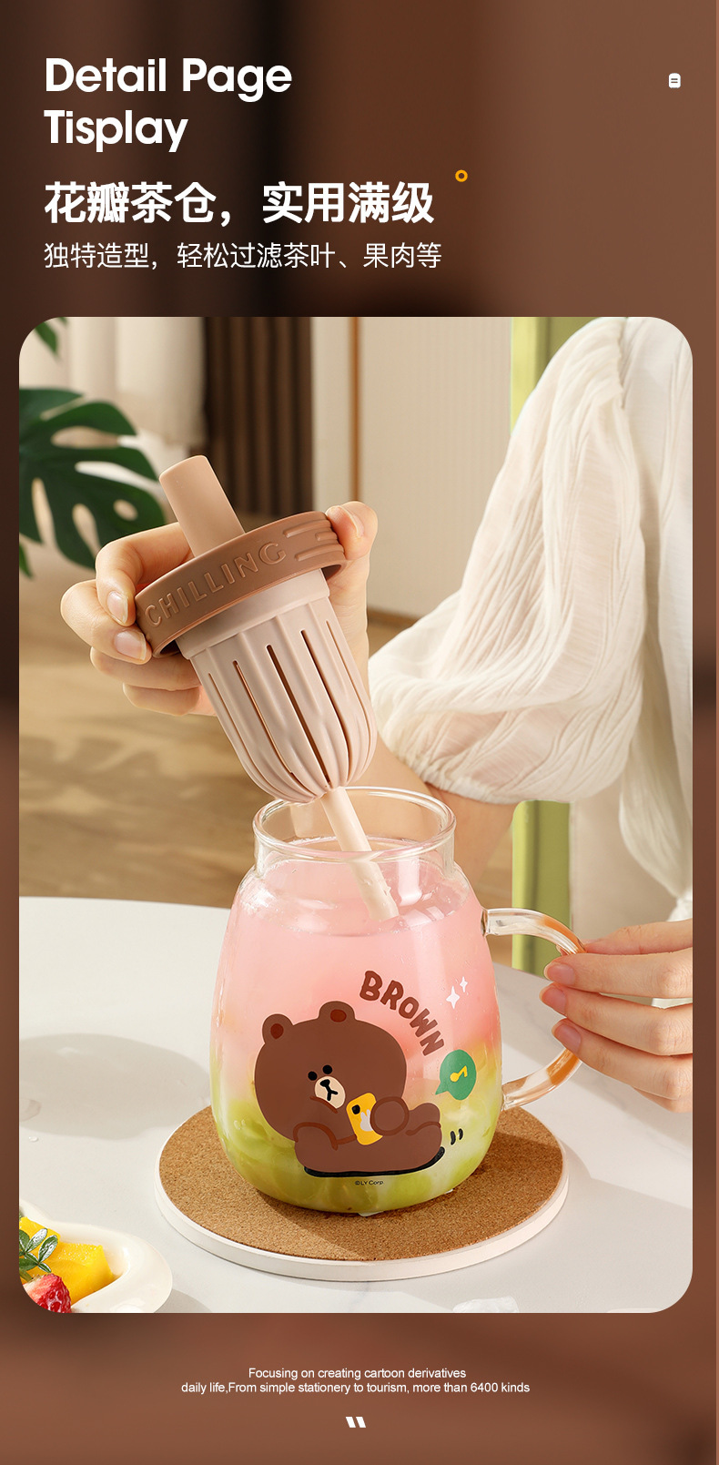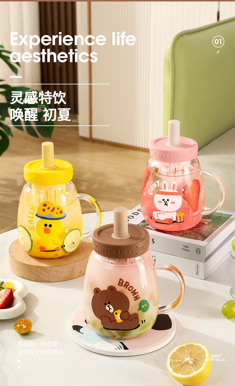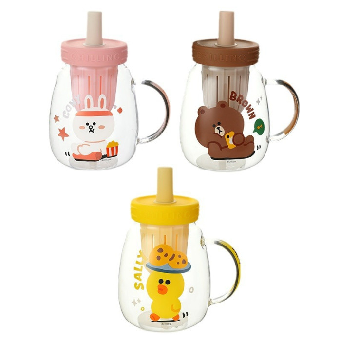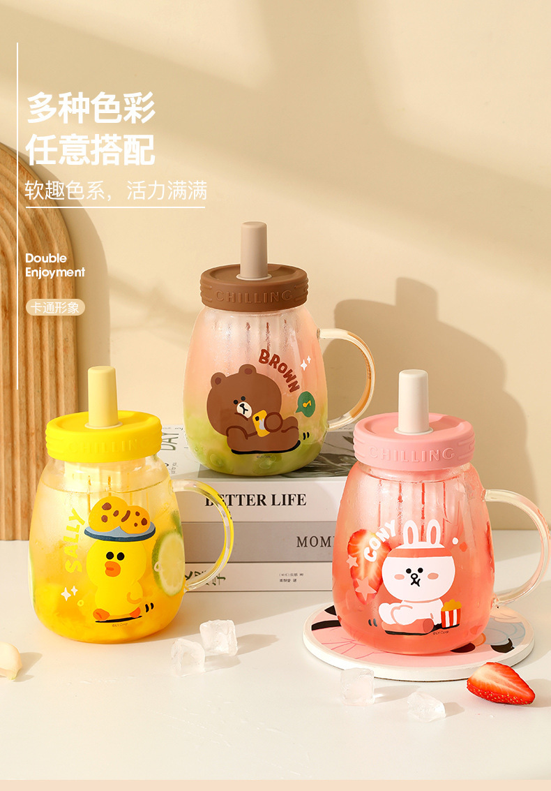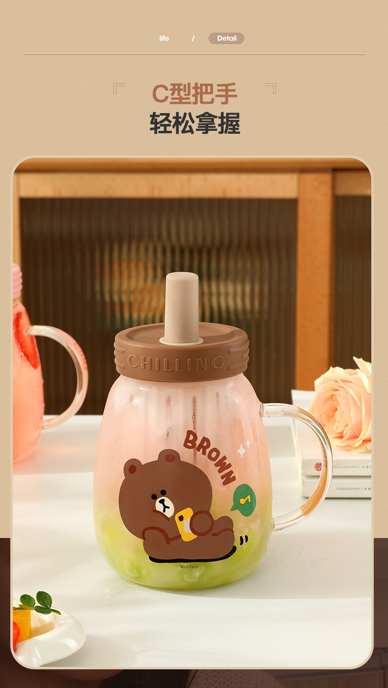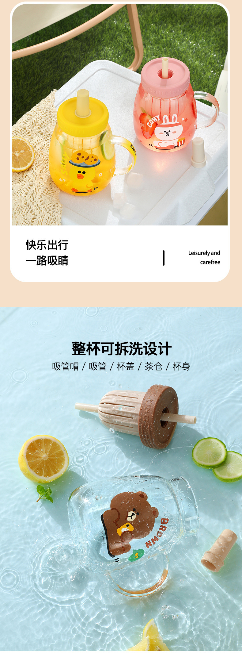 LINE FRIENDS玻璃杯茶水分離水杯大容量泡茶杯高顔值女吸管直飲杯