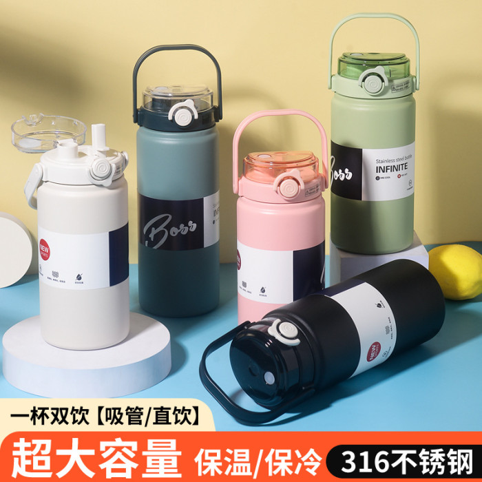 雙飲保溫杯大容量水壺女學生高顔值316不鏽鋼水杯男可攜式吸管杯子