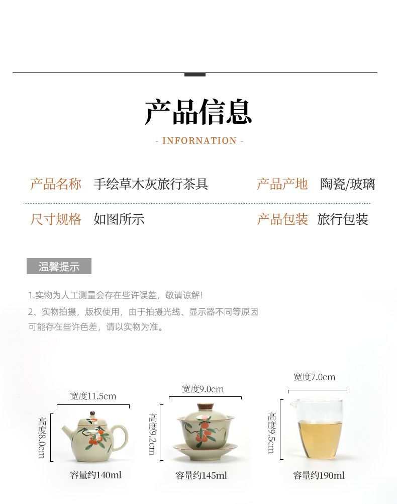 | 容量 | 草木灰山水蓋碗旅行套裝(瀝水磐) |