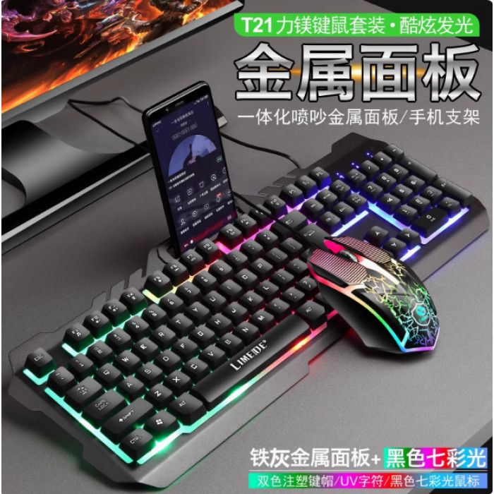 力美T21有線發光金屬鍵盤滑鼠套裝機械手感懸浮遊戯鍵鼠套裝