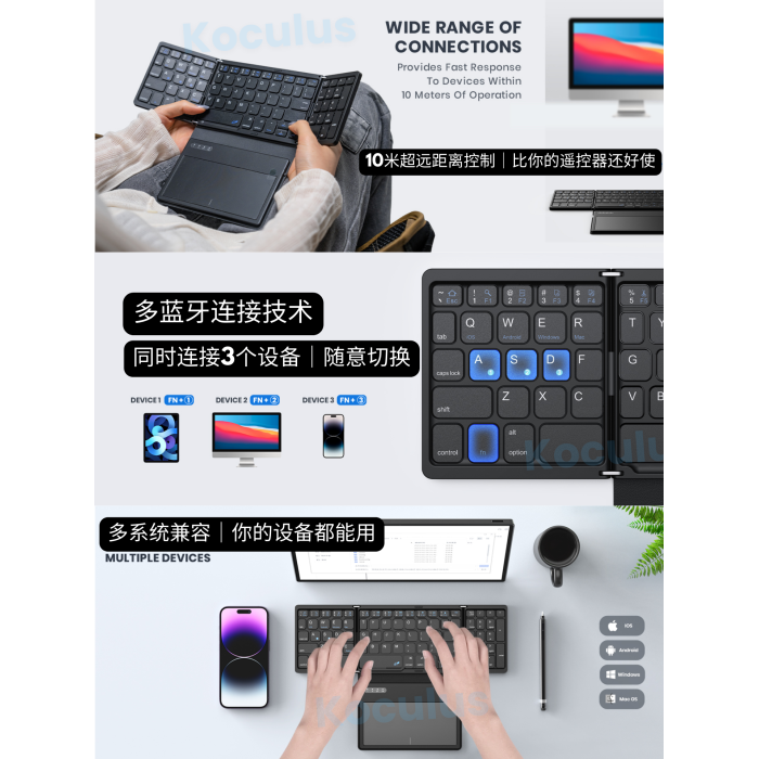 Koculus無線藍牙三折曡鍵盤平板手機筆記型電腦觸控板一體式可攜式