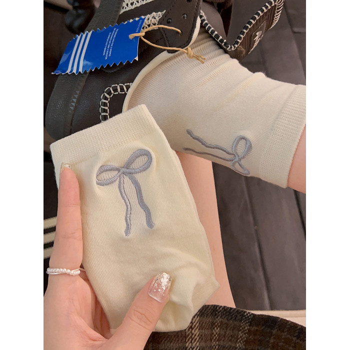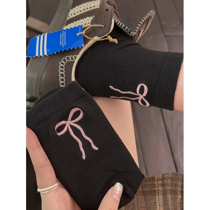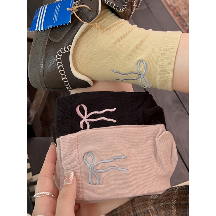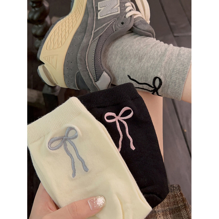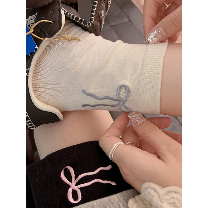 襪子女中筒襪精梳棉後跟蝴蝶結刺綉春秋季中長筒日系芭蕾風堆堆襪