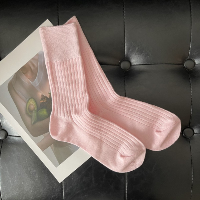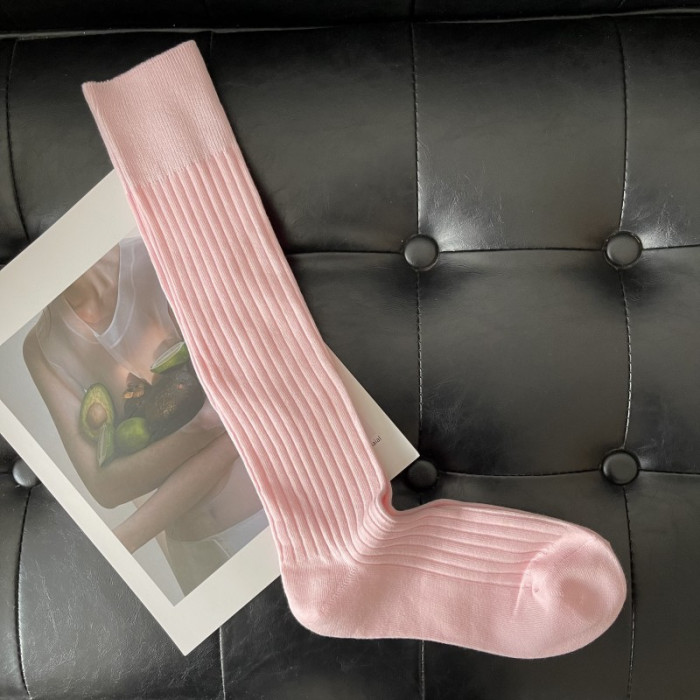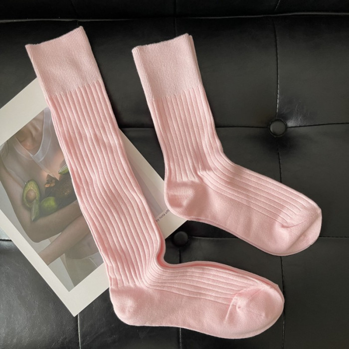 高羅口雙針寬條淡粉長襪日系純色女襪