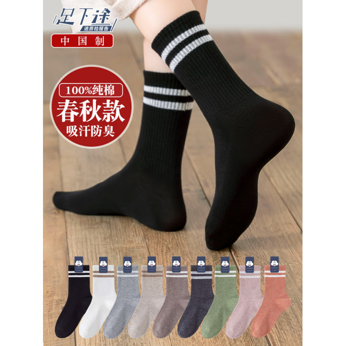 春秋季100%純棉襪子女中筒夏季薄款黑色運動防臭秋冬白色條紋長襪