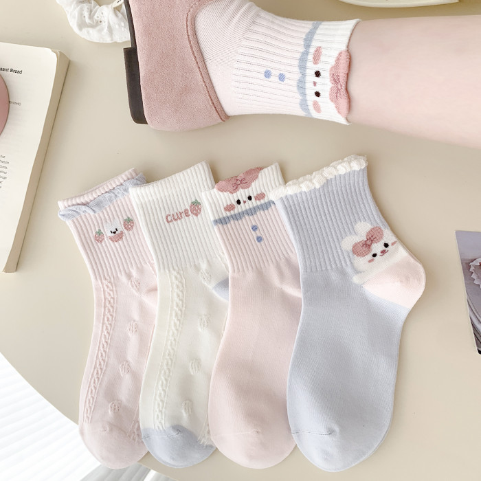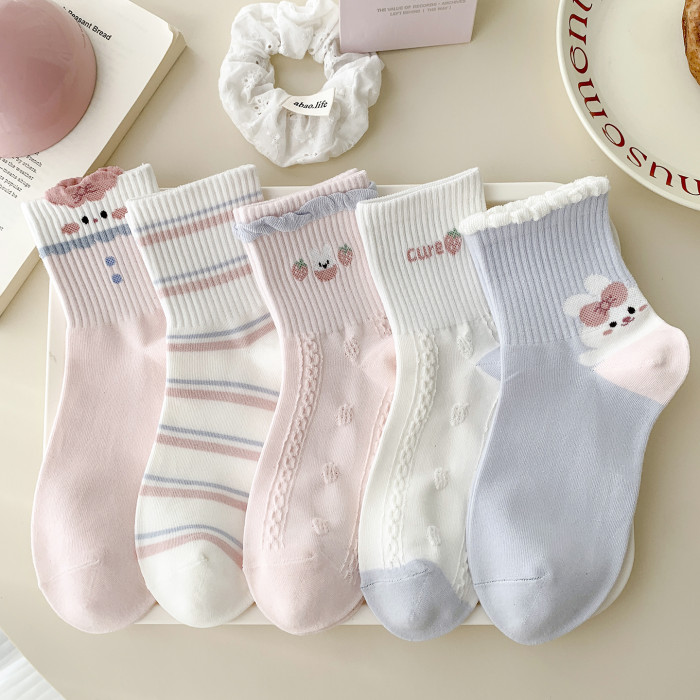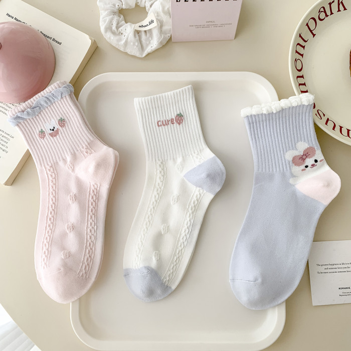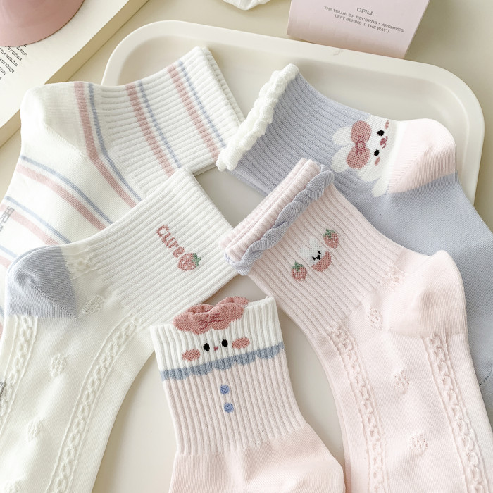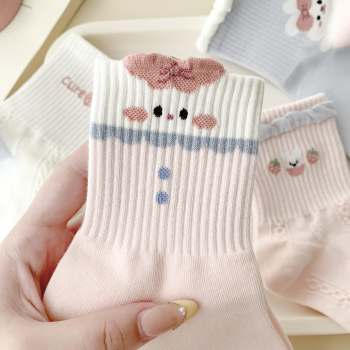 兔子草莓粉色襪子女春秋中筒襪精梳棉透氣藍色韓版卡通反織運動風