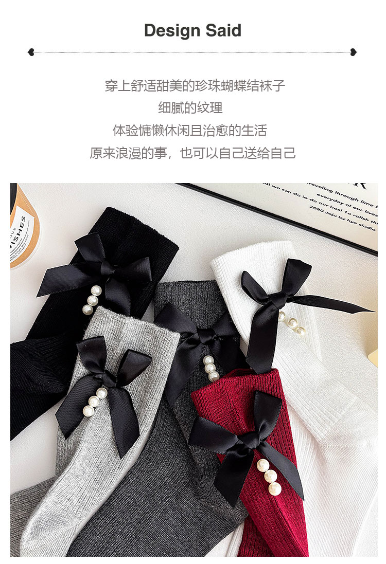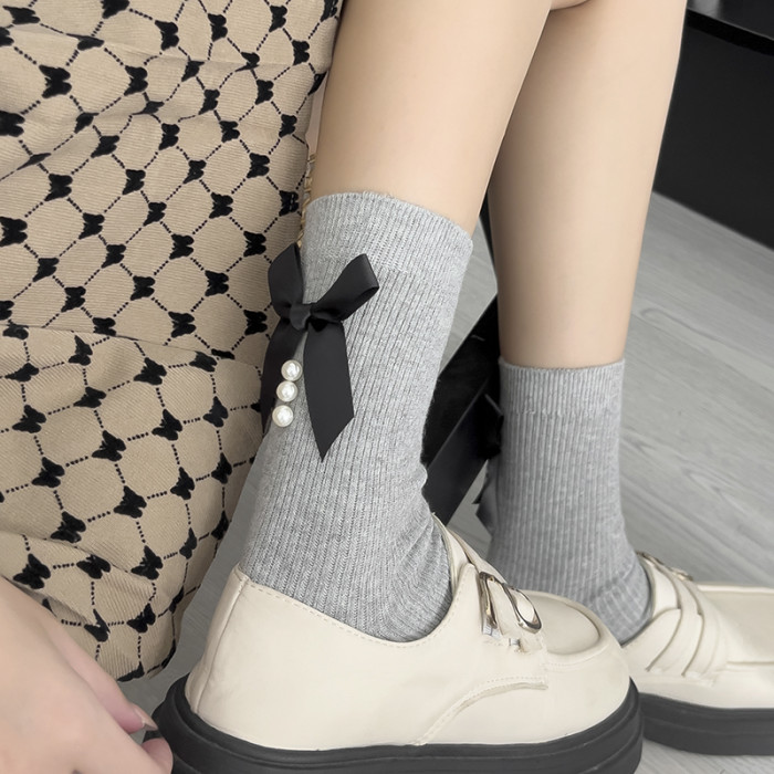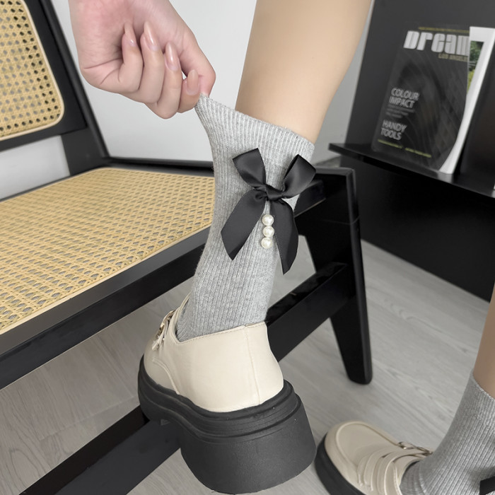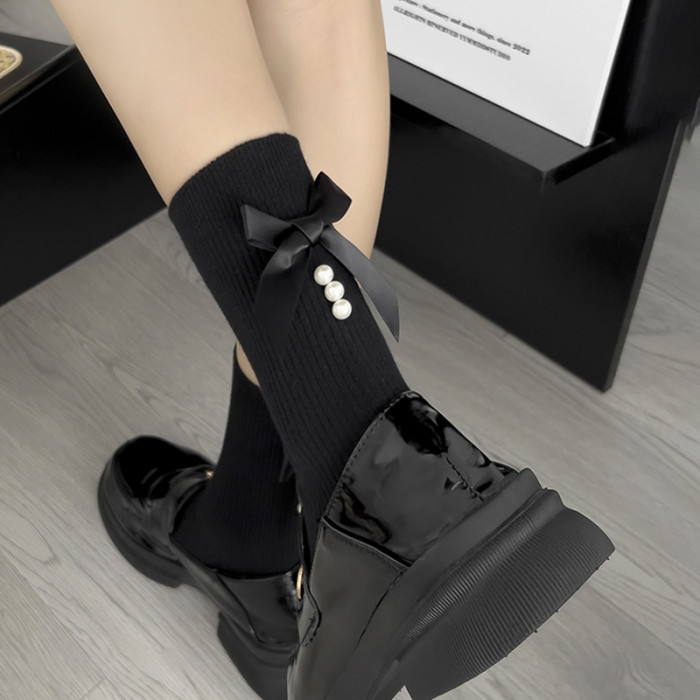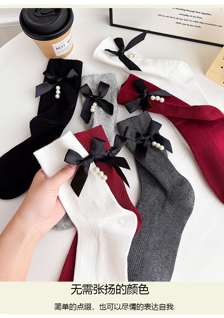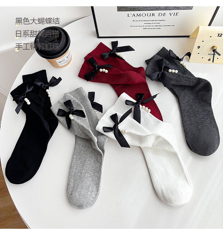 後跟蝴蝶結襪子女秋冬新款日系可愛甜美學院風珍珠中筒襪外穿ins