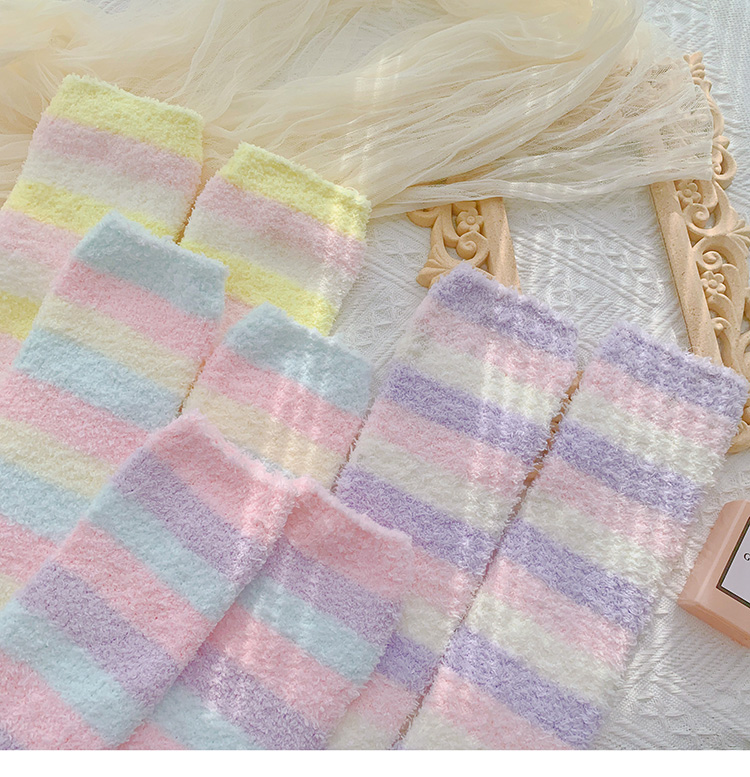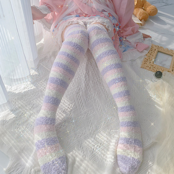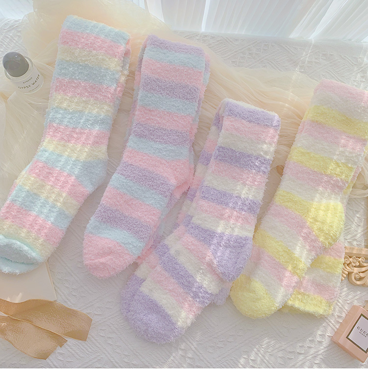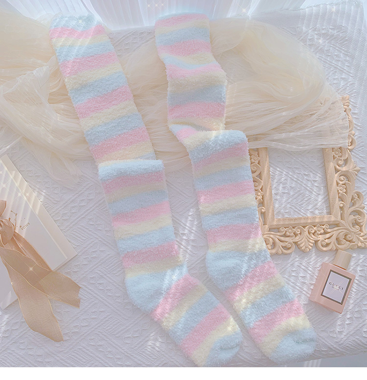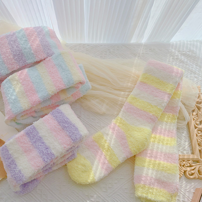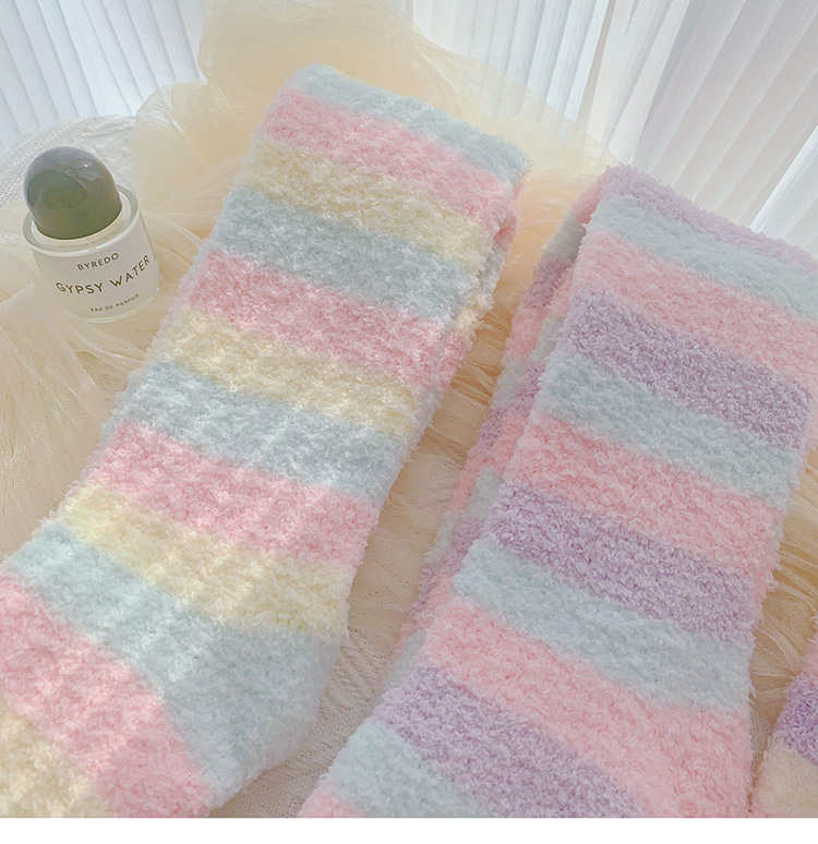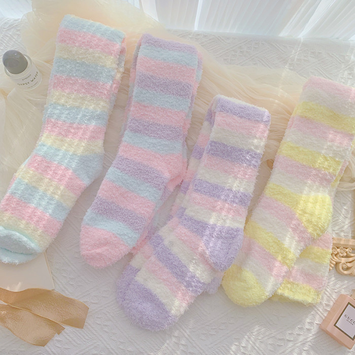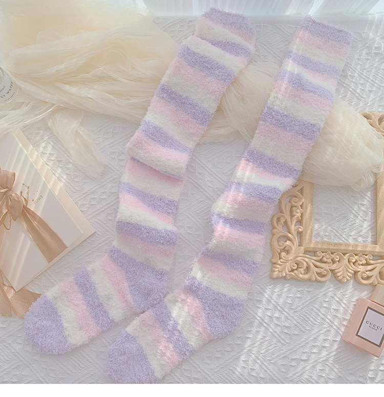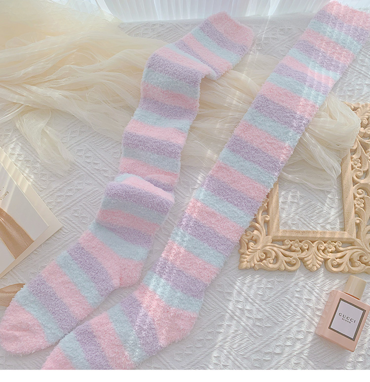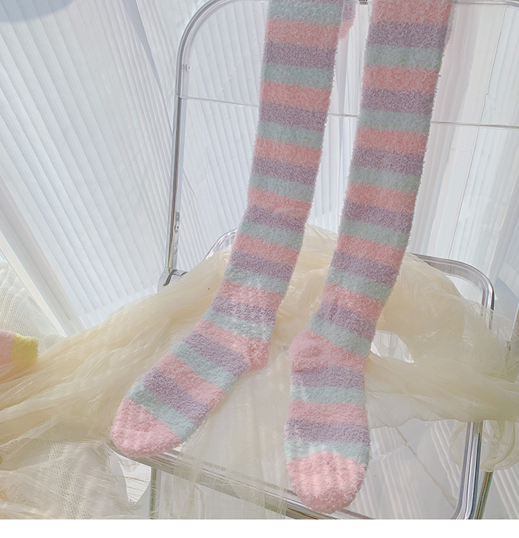 冰淇淋色珊瑚絨女過膝高筒襪地板襪軟綿綿毛絨保暖長筒襪睡眠襪子
