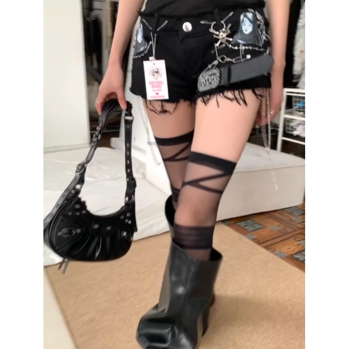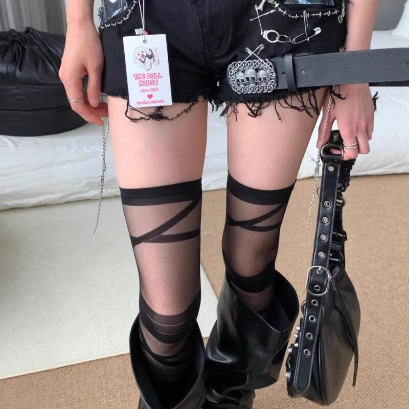 y2k哥特風繃帶過膝襪女亞文化辣妹龐克純欲JK長筒襪性感黑絲襪薄