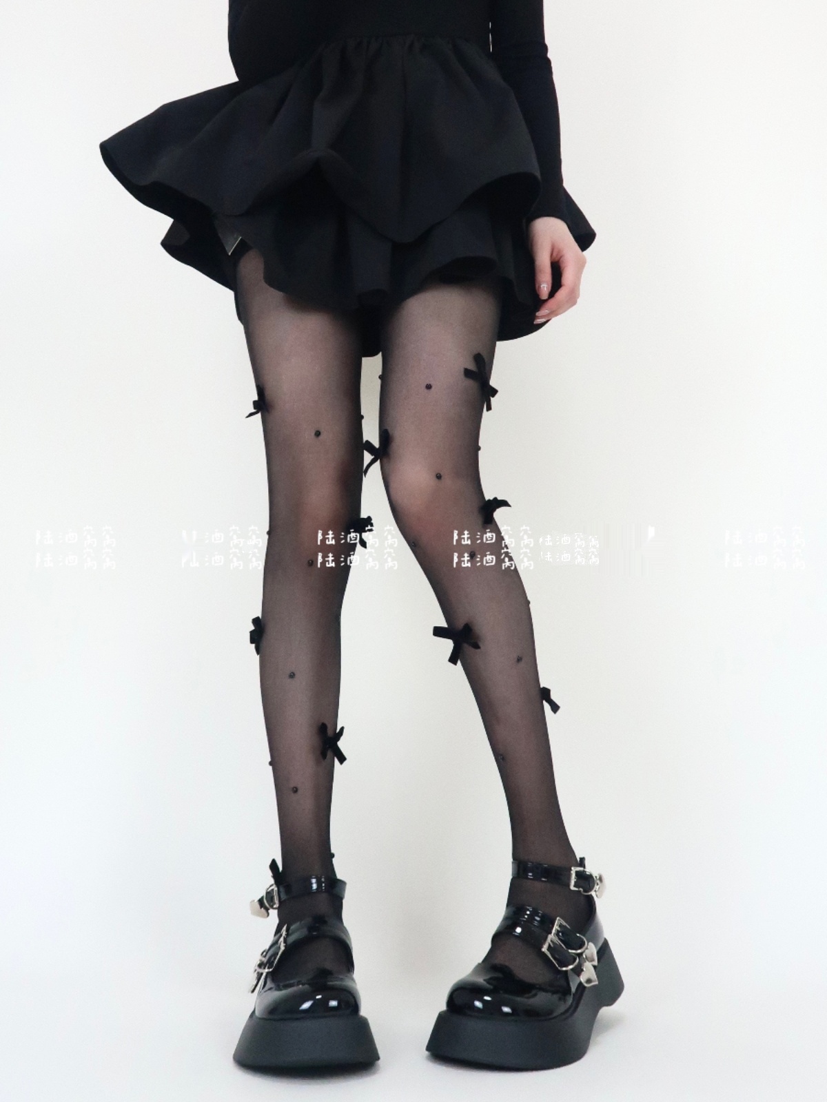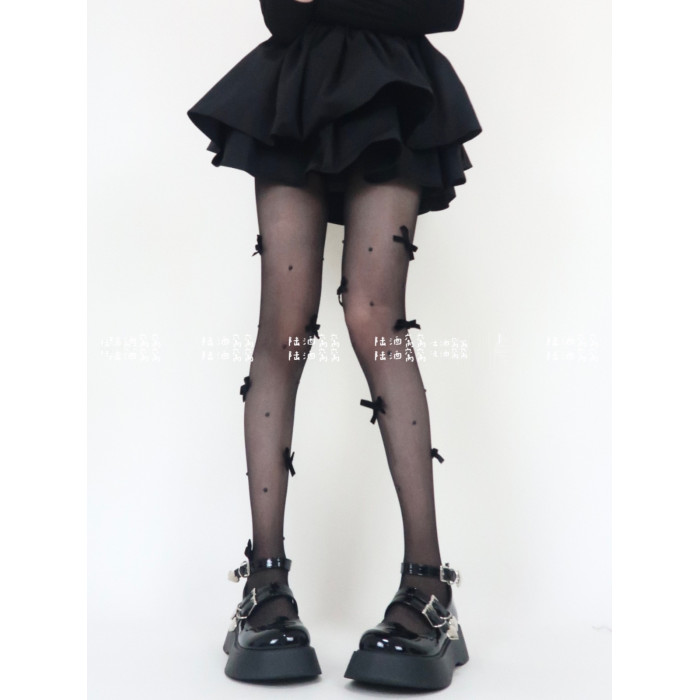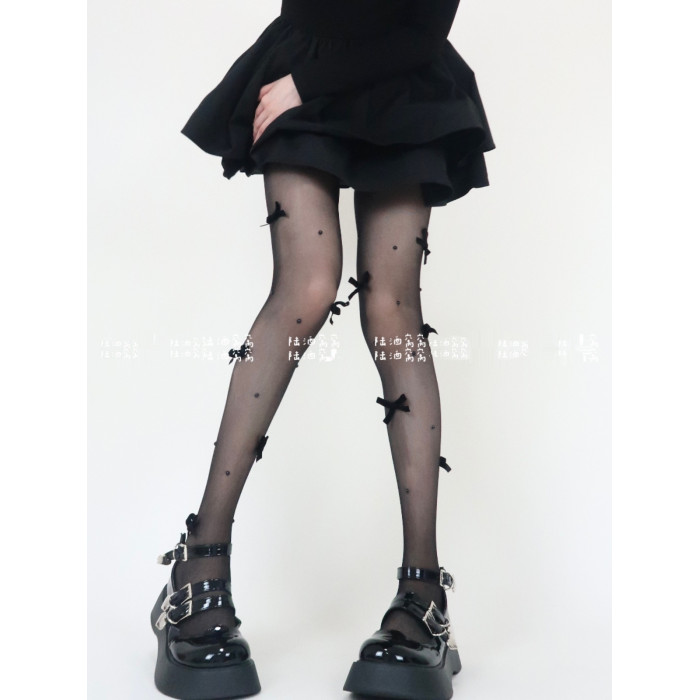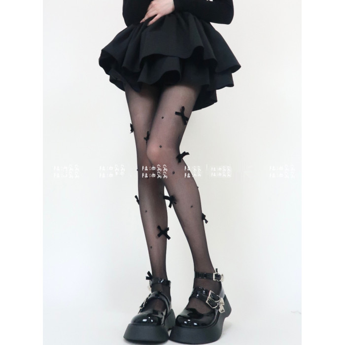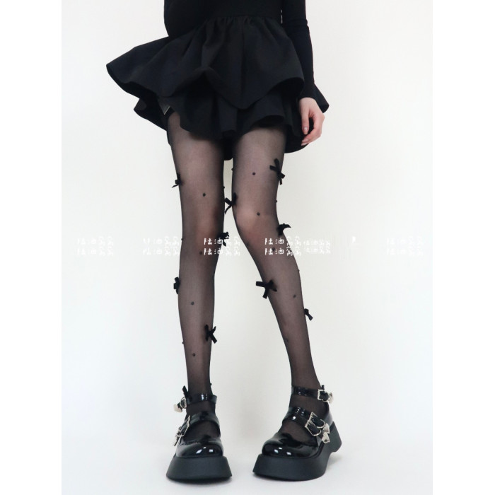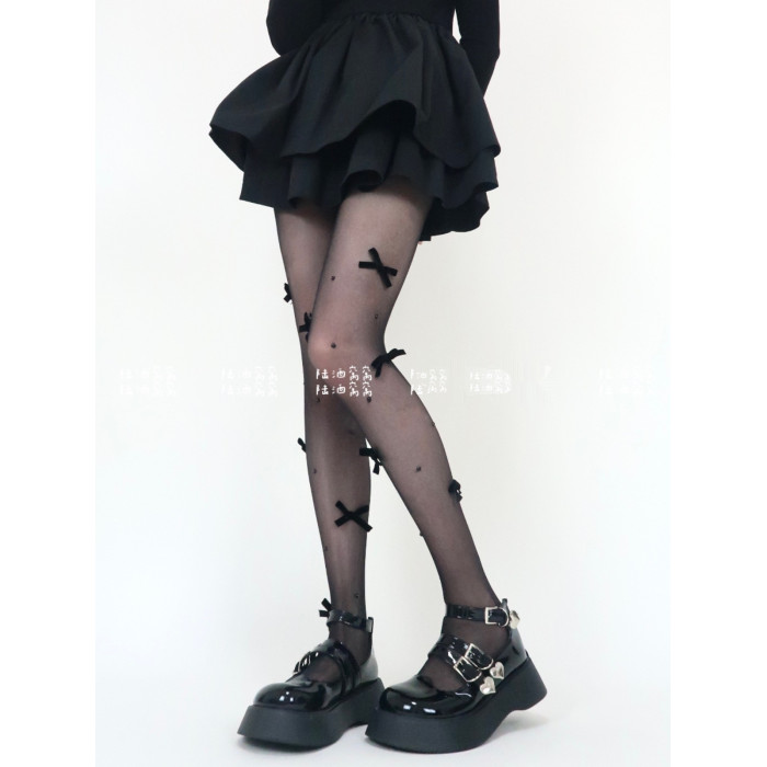 陸酒窩窩 春夏新品黑絲少女心絲絨蝴蝶結珍珠任意剪連體襪女