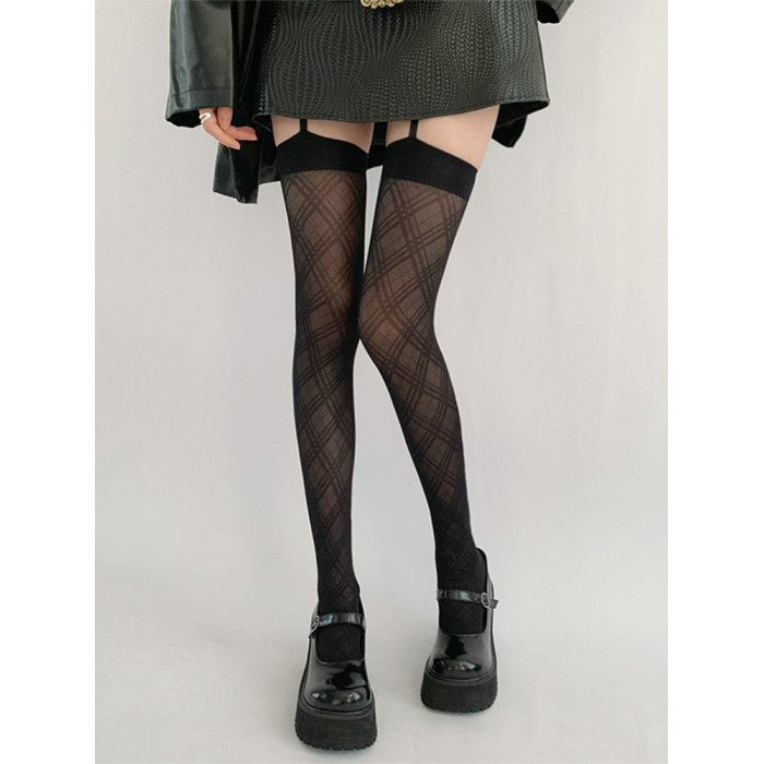 夜間教習室吊帶絲襪一體式性感菱格黑色長筒襪子女夏季jk黑絲