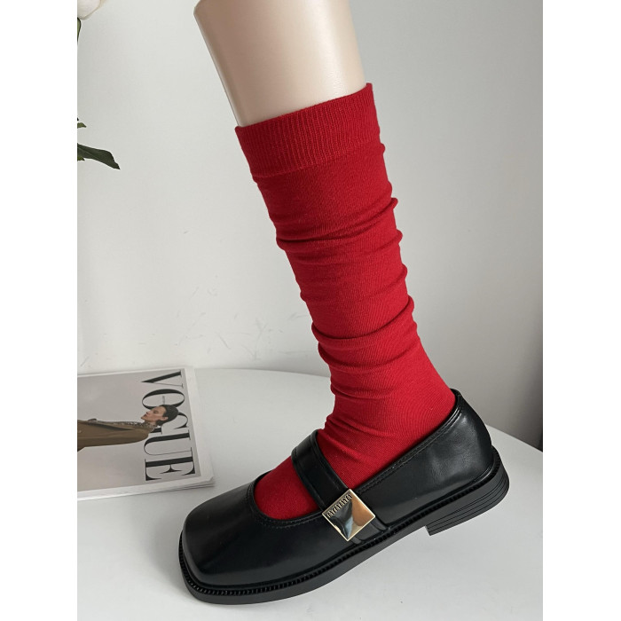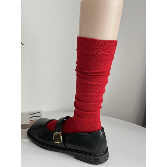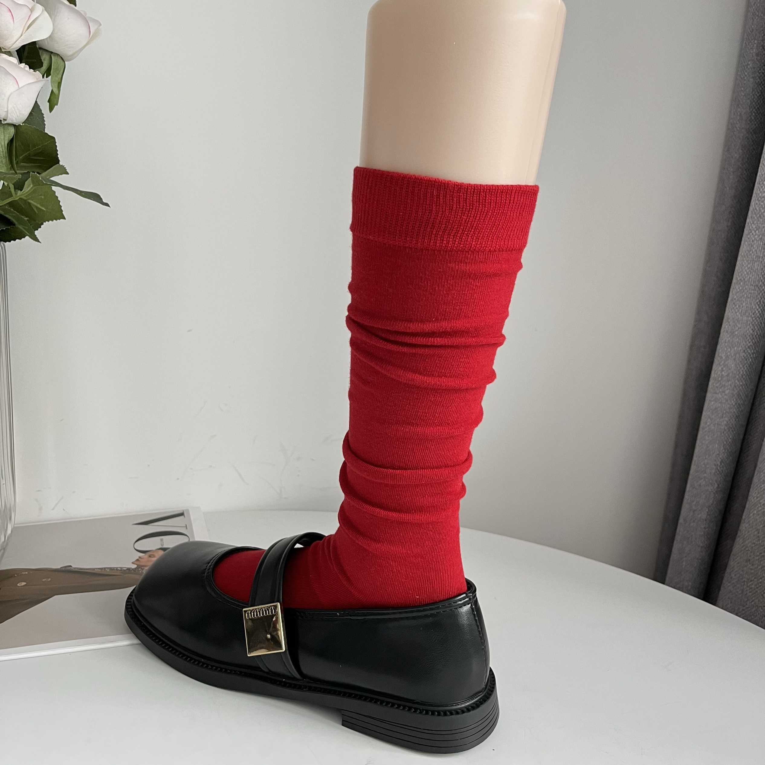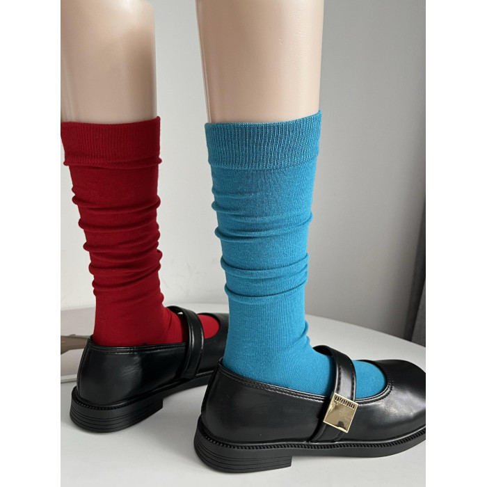 大紅色純棉小腿襪ins潮時髦復古藍色堆曡中筒襪女春秋季薄款不透