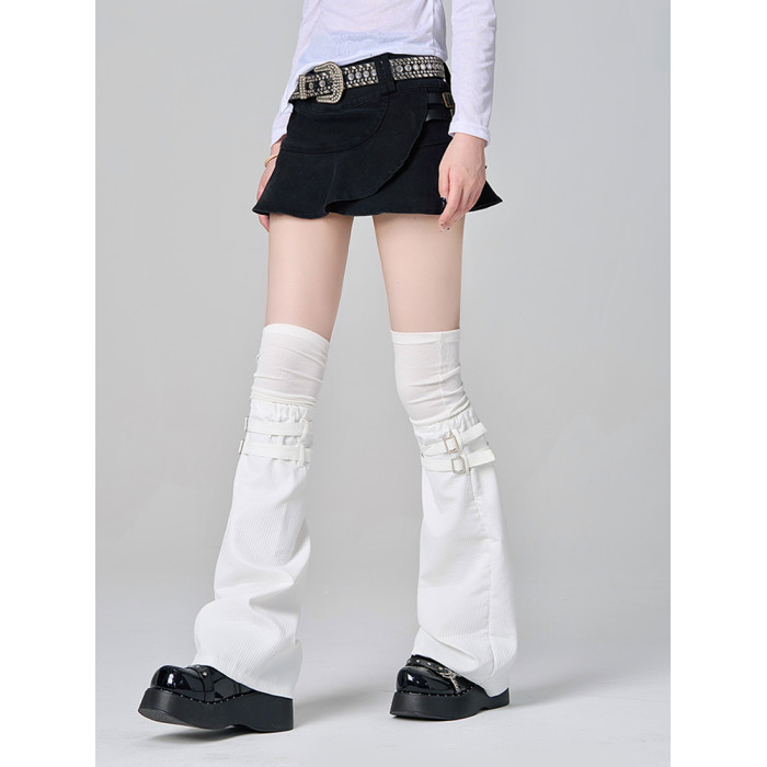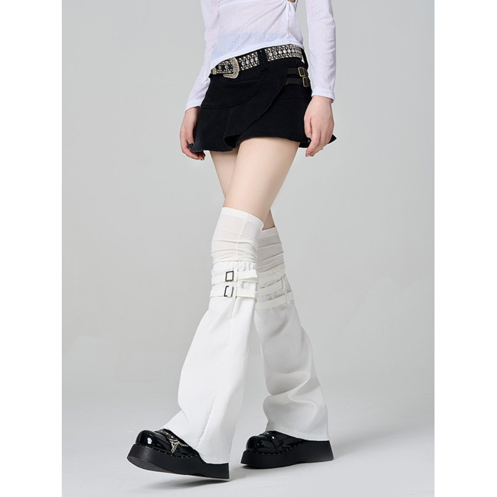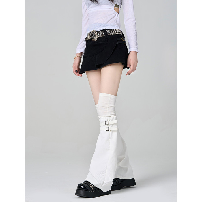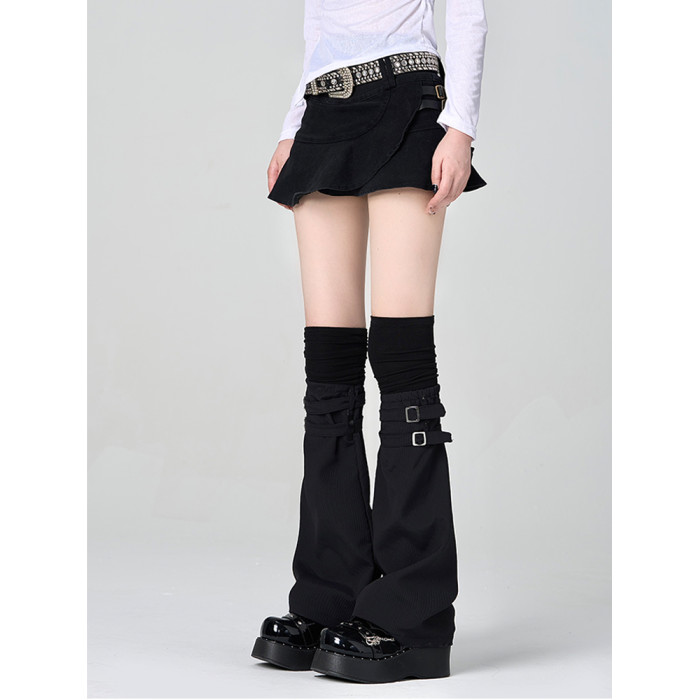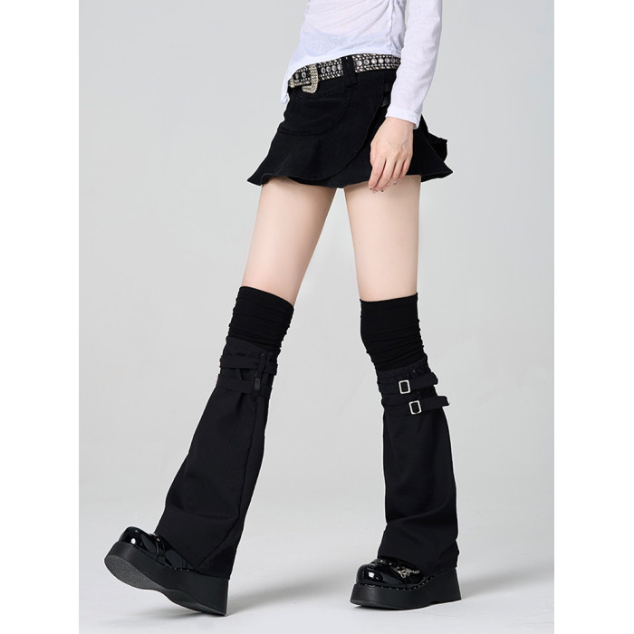 黑色高級拼接假兩件過膝腿套個性堆堆大腿襪亞文化皮釦濶腿襪套薄