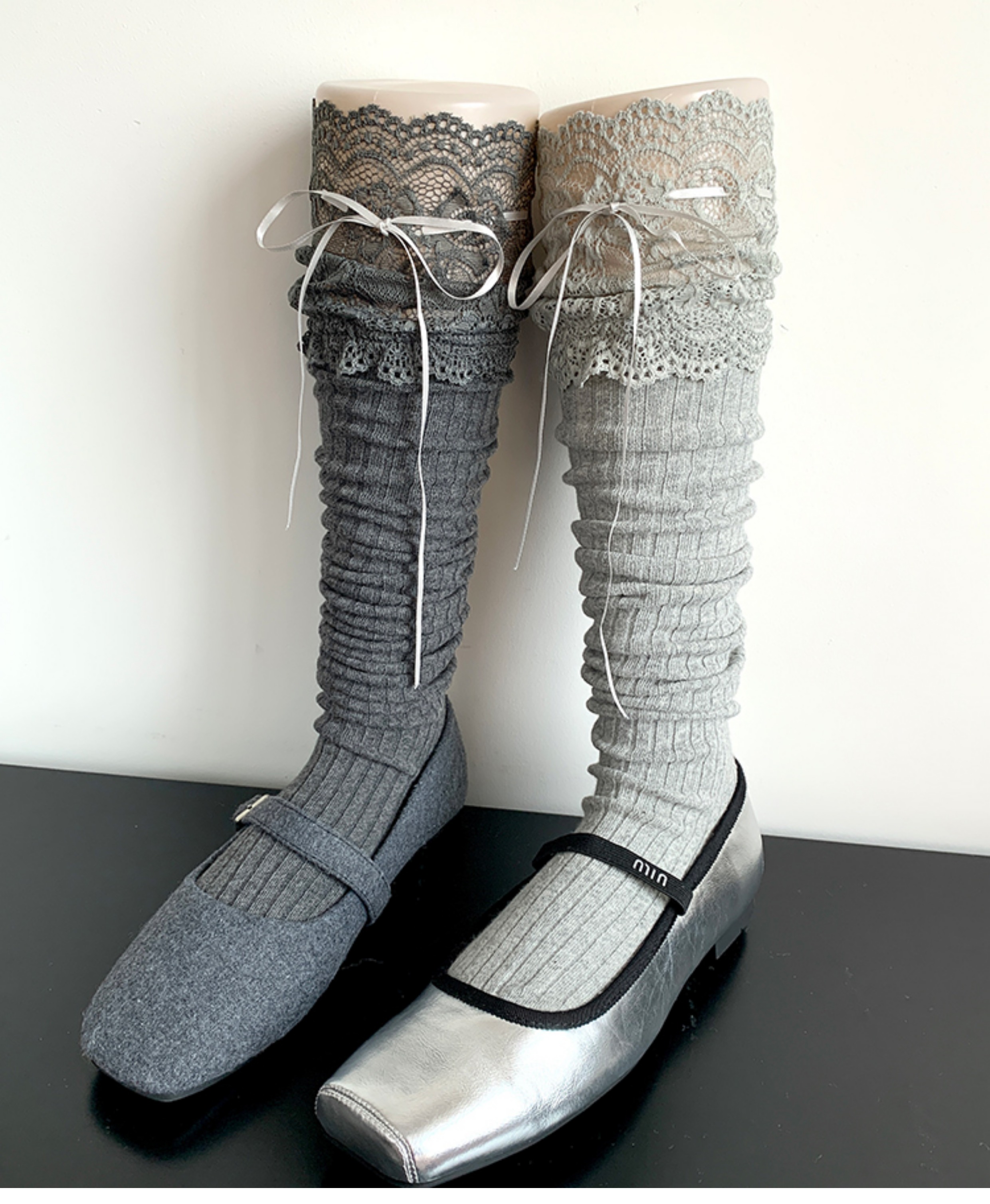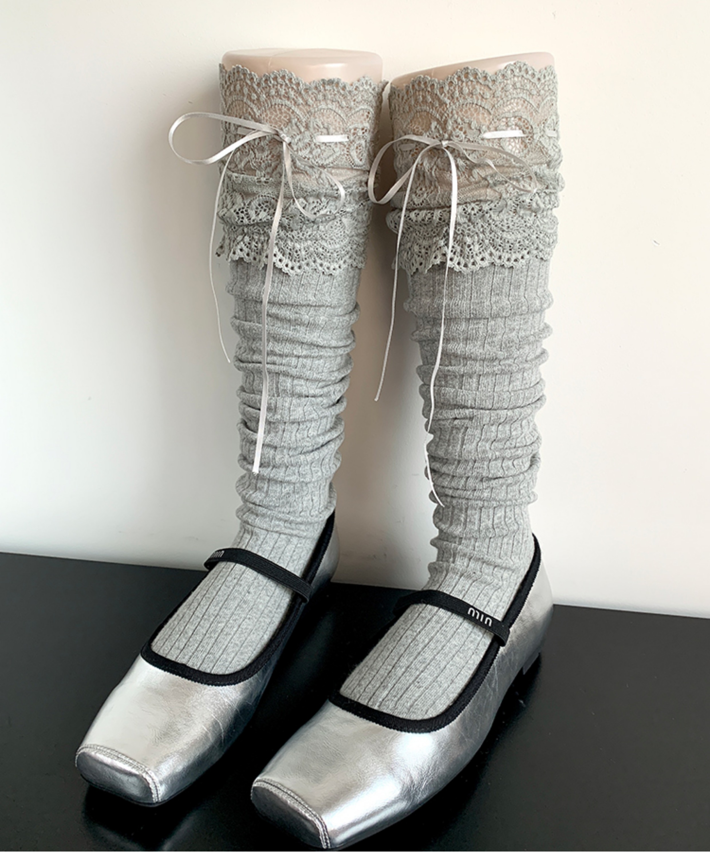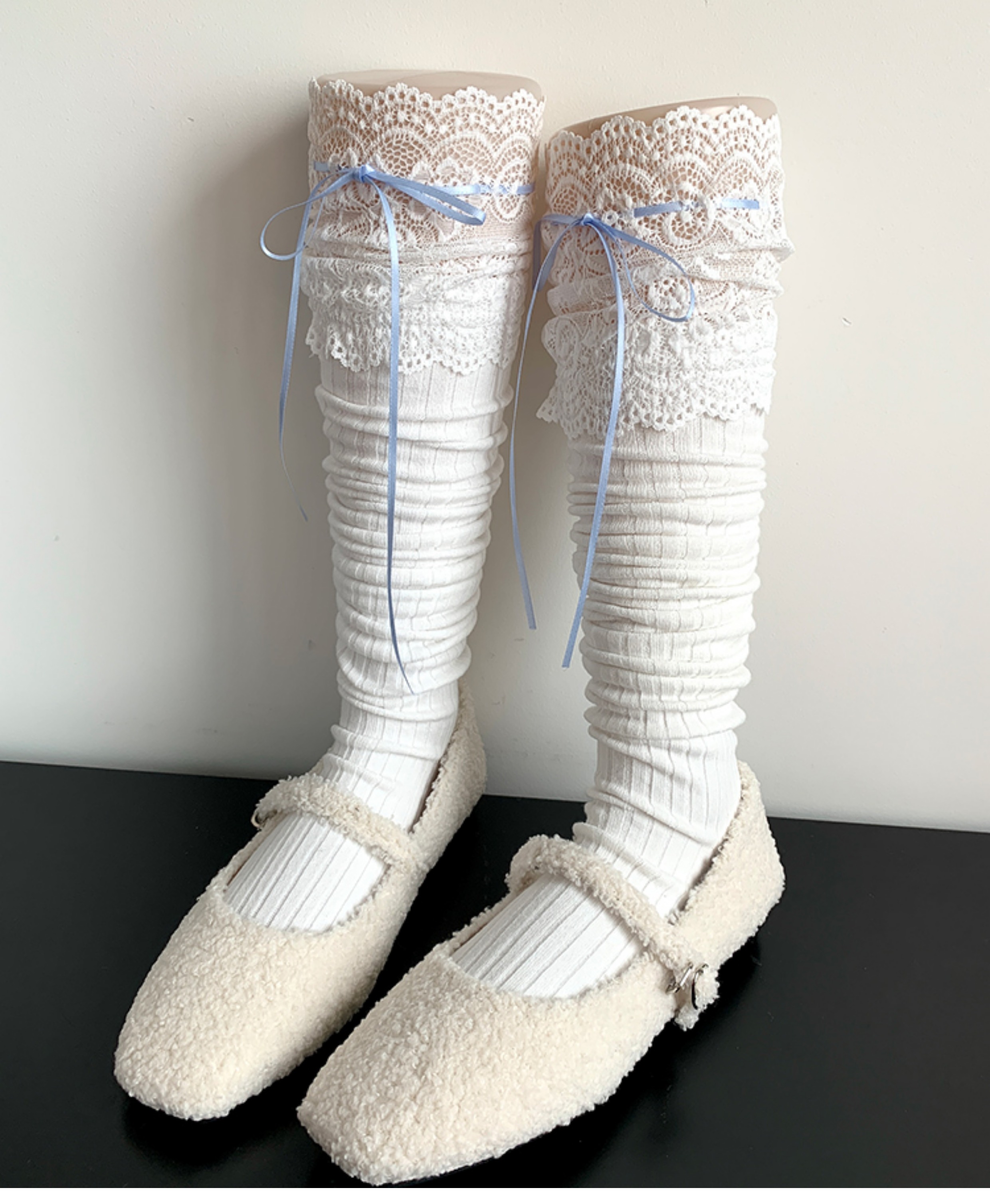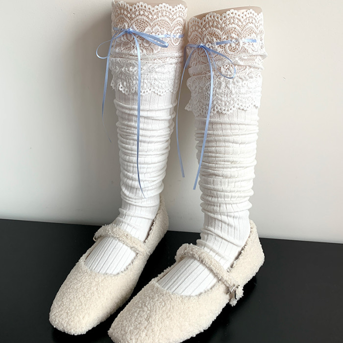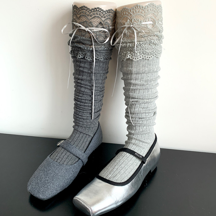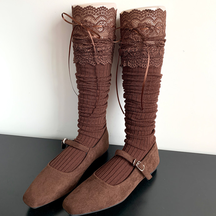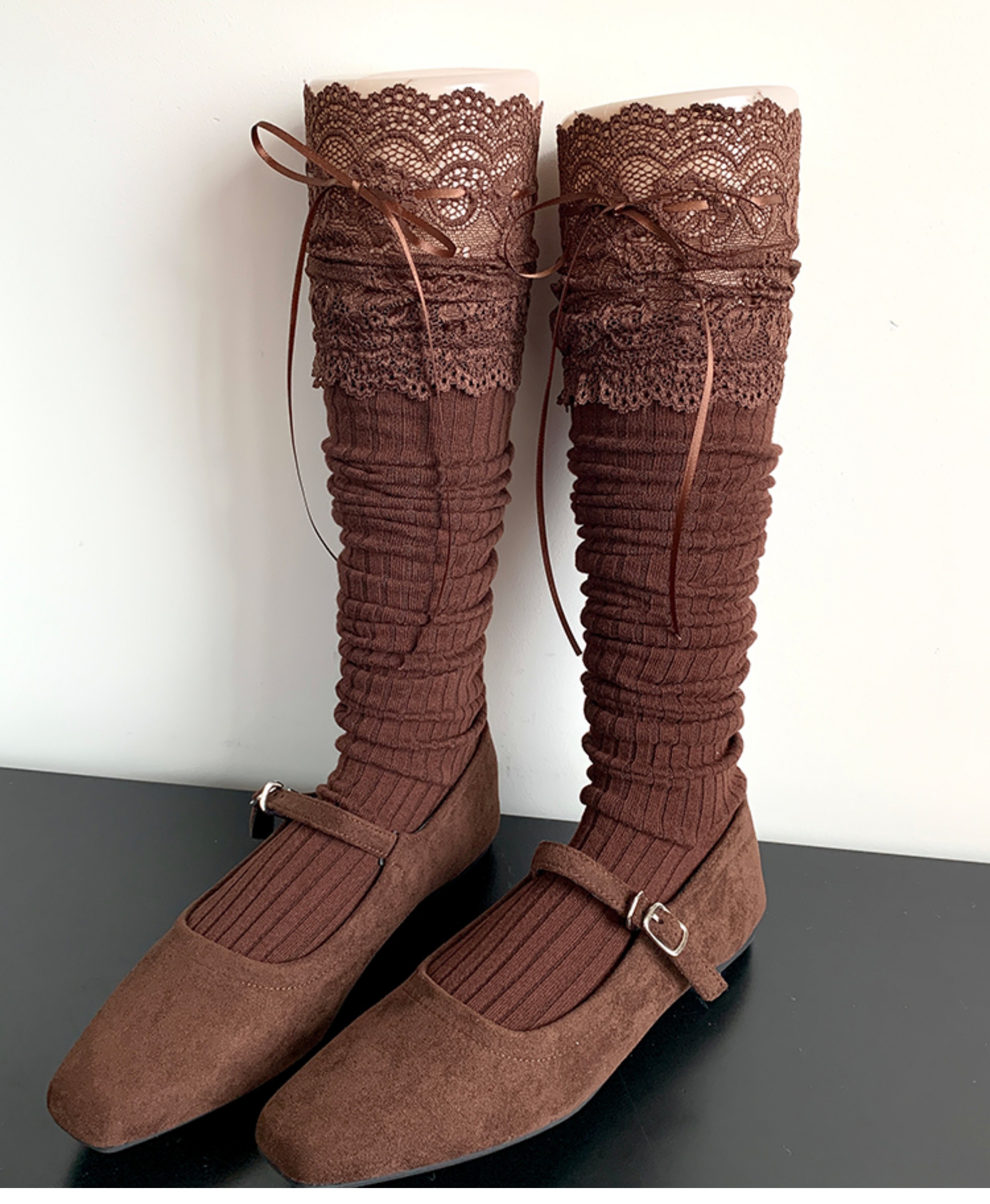 美拉德咖色絲帶蕾絲花邊長筒襪過膝堆堆襪子女春秋黑色高筒大腿襪