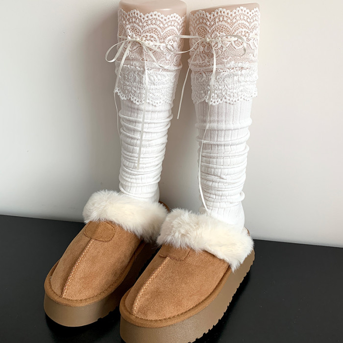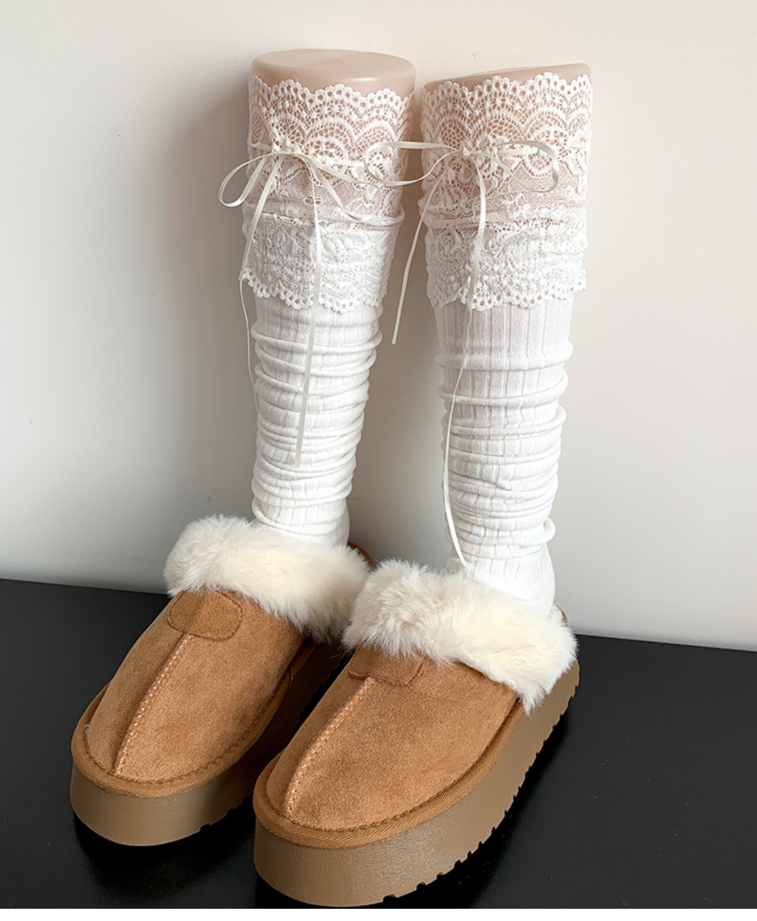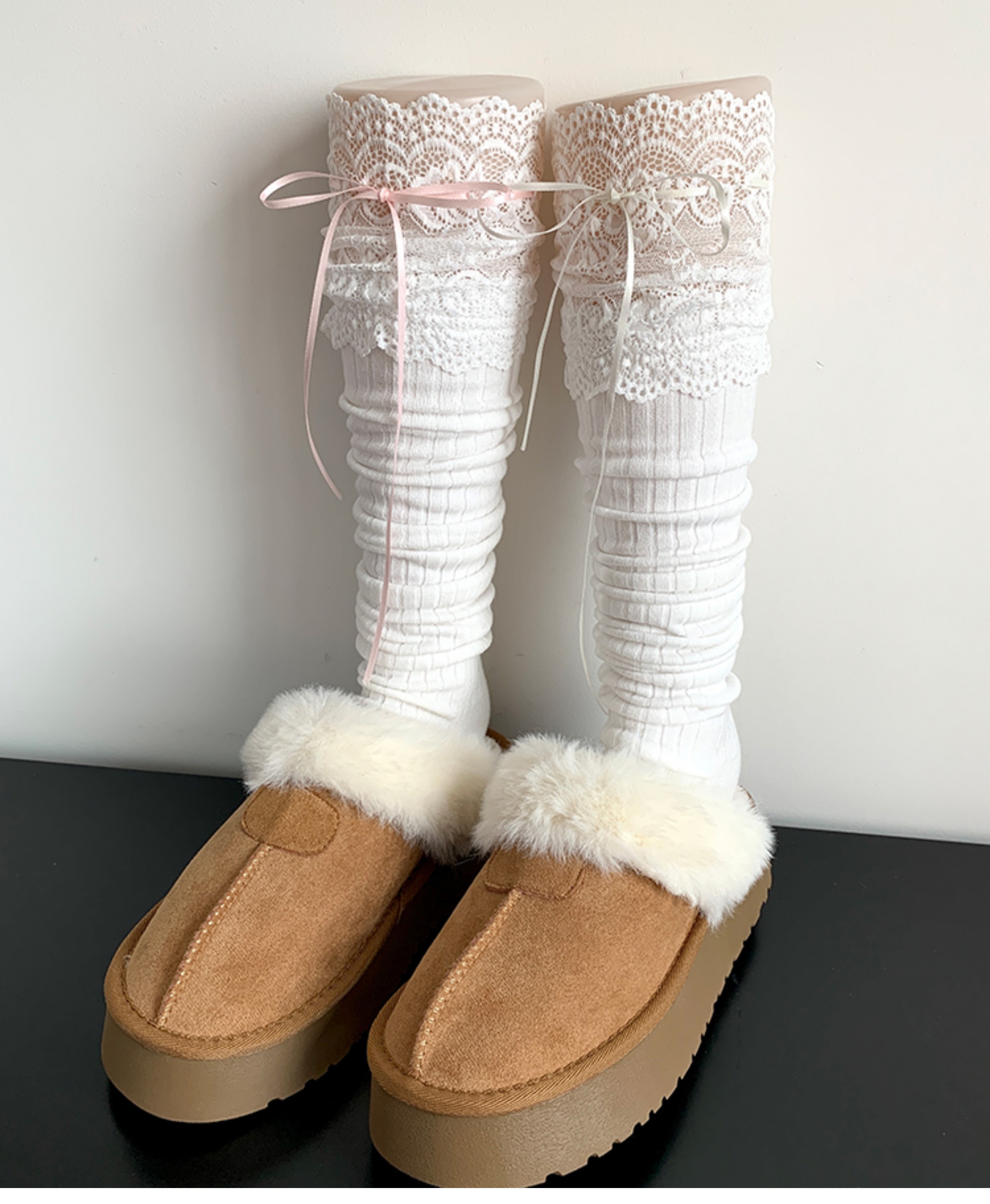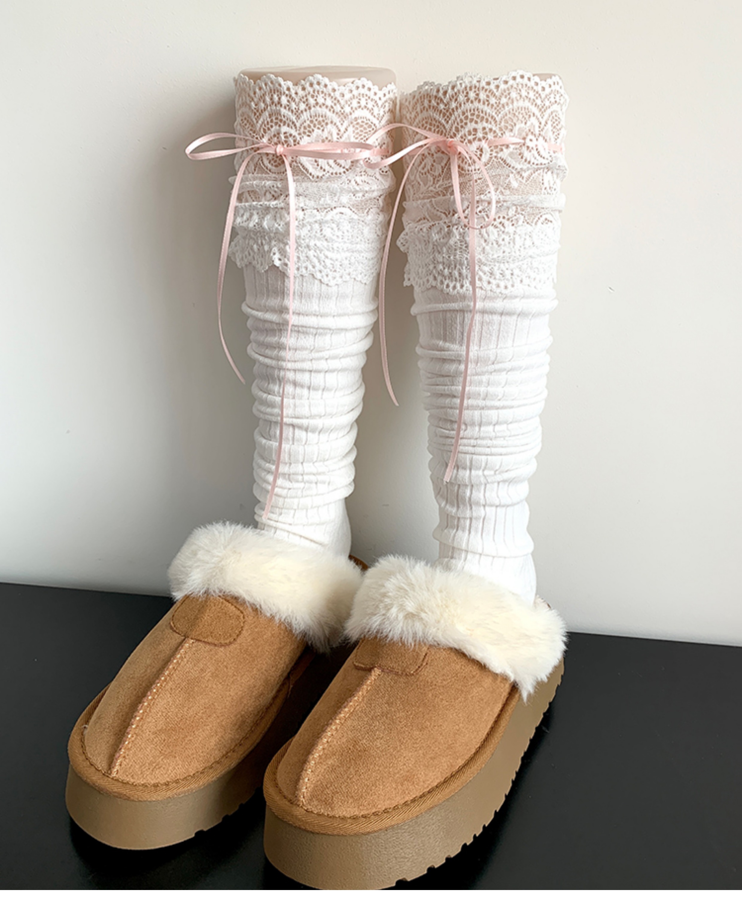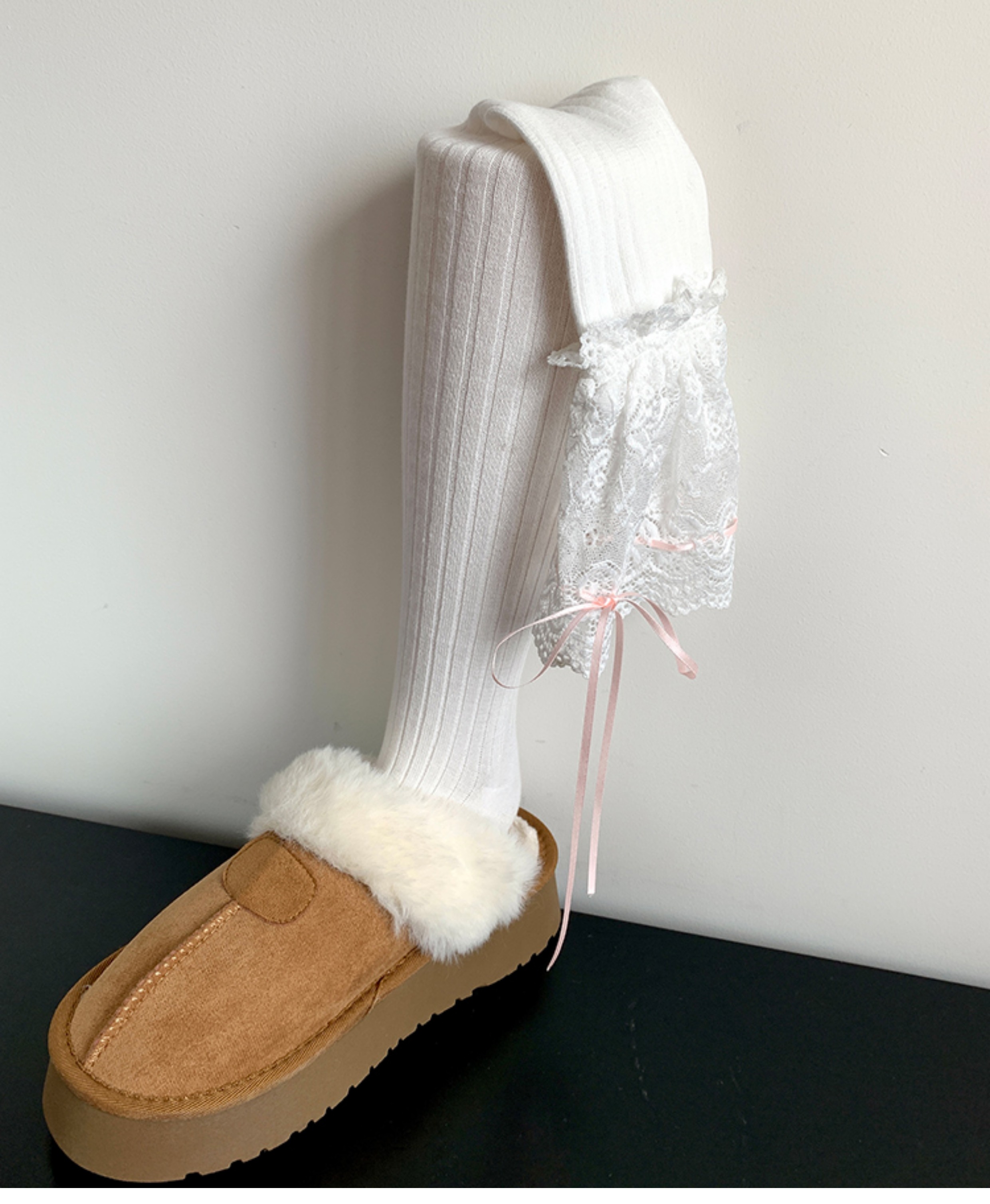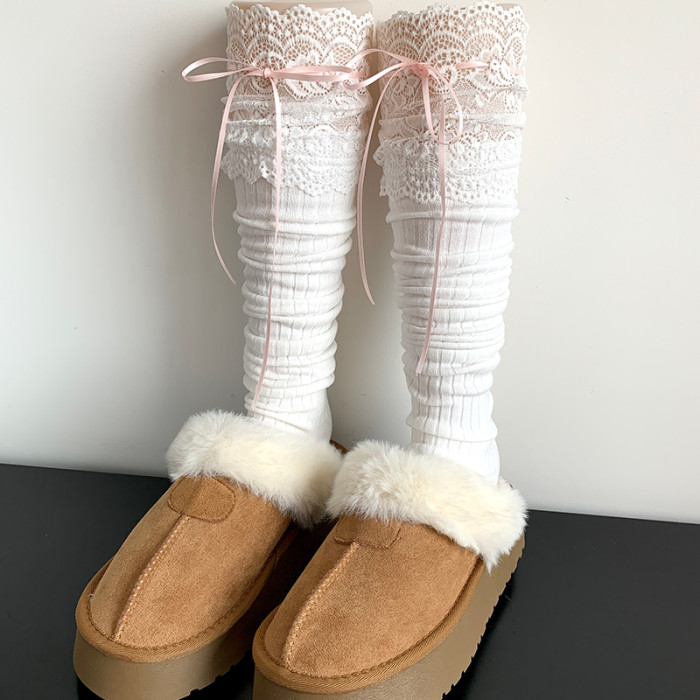 美拉德咖色絲帶蕾絲花邊長筒襪過膝堆堆襪子女春秋黑色高筒大腿襪