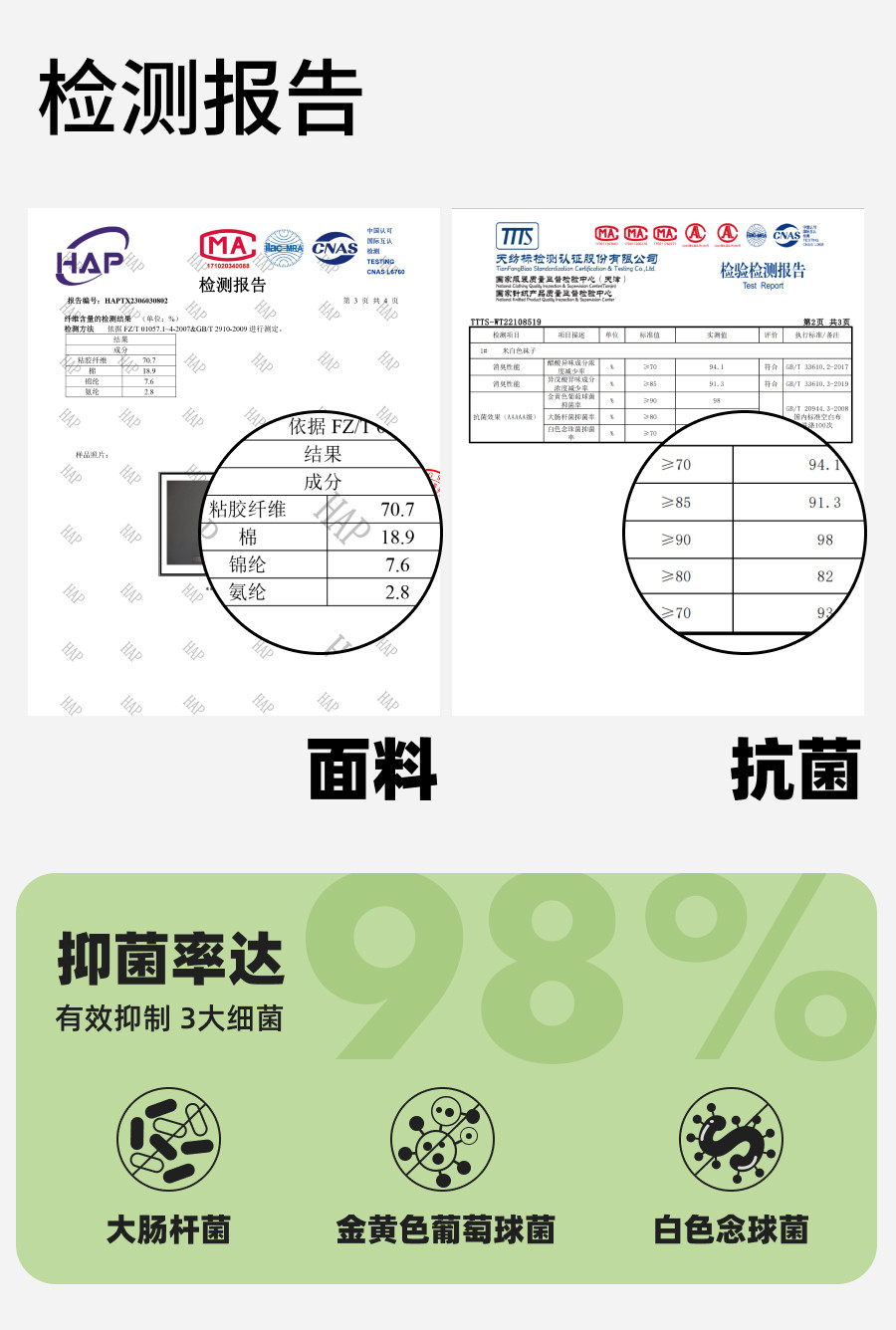 | 面料材質成分 | 粘膠纖維(粘纖)70.7% 棉18.9% 聚醯胺纖維(錦綸)7.6% 聚氨酯彈性纖維(氨綸)2.8% |
